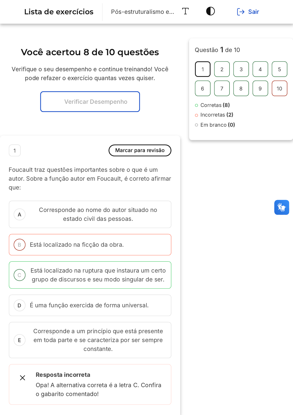 Você acertou 8 de 10 questões Verifique o seu desempenho e continue treinando! Você pode refazer o exercício quantas vezes quiser. Verificar Desempenho A B C D E 1 Marcar para revisão Foucault traz questões importantes sobre o que é um autor. Sobre a função autor em Foucault, é correto afirmar que: Corresponde ao nome do autor situado no estado civil das pessoas. Está localizado na ficção da obra. Está localizado na ruptura que instaura um certo grupo de discursos e seu modo singular de ser. É uma função exercida de forma universal. Corresponde a um princípio que está presente em toda parte e se caracteriza por ser sempre constante. Resposta incorreta Opa! A alternativa correta é a letra C. Confira o gabarito comentado! Questão 1 de 10 Corretas (8) Incorretas (2) Em branco (0) 1 2 3 4 5 6 7 8 9 10 Lista de exercícios Pós-estruturalismo e… Sair A B C D E Gabarito Comentado Para Foucault, a função autor não se refere ao nome do autor no estado civil das pessoas, nem está localizada na ficção da obra, nem é uma função exercida de forma universal, nem corresponde a um princípio que está presente em toda parte e se caracteriza por ser sempre constante. Ao contrário, a função autor, segundo Foucault, está localizada na ruptura que instaura um certo grupo de discursos e seu modo singular de ser. Isso significa que a função autor surge ou se encontra no modo específico de certos discursos se instaurarem e se organizarem. Portanto, a alternativa C é a correta, pois está em consonância com o pensamento de Foucault sobre a função autor. 2 Marcar para revisão Das afirmações abaixo, qual corresponderia à ideia barthesiana de crítica literária? O crítico deve abandonar o método que se abra para uma multiplicidade de sentidos no texto. O crítico literário não pode estabelecer um vaivém constante entre crítica e prática literária. O crítico deve, do ponto de vista axiológico, ter a última palavra sobre o texto analisado. A crítica é uma constante metamorfose entre leitura e escrita e escrita e leitura. A escrita do crítico não pode ser uma atividade de variação e combinação. Resposta correta A B C D E Parabéns, você selecionou a alternativa correta. Confira o gabarito comentado! Gabarito Comentado Roland Barthes se destacou, entre outras coisas, por ter privilegiado na crítica literária as relações entre os processos de leitura e de escrita. As demais alternativas estão incorretas porque trazem ideias ou conclusões contrárias ao pensamento barthesiano. 3 Marcar para revisão Assinale a alternativa correta a respeito das proposições teóricas de Barthes a respeito do prazer e da literatura. Barthes recusou a ideia lacaniana de jouissance, optando radicalmente por uma teoria do prazer. Para Barthes, o texto literário se constrói nas falhas ou nos interstícios entre prazer e gozo (jouissance). Ao referir-se aos estudos de Lacan, Barthes considera o texto de prazer como um interdito e o texto de gozo como dizível. Não há na obra de Barthes nenhuma preocupação com aspectos alienados dos textos. Para Barthes, no que se refere à escrita, o escritor tem pleno domínio do que pretende expressar. A B Resposta correta Parabéns, você selecionou a alternativa correta. Confira o gabarito comentado! Gabarito Comentado Barthes, ao discutir a leitura do texto literário, apresenta a constante tensão entre prazer e gozo (jouissance). Ele acredita que o texto literário é construído nas falhas ou nos interstícios entre esses dois conceitos. As outras alternativas estão incorretas, pois contradizem as ideias desenvolvidas por Barthes. Por exemplo, Barthes não recusou a ideia lacaniana de jouissance, nem considerou o texto de prazer como um interdito e o texto de gozo como dizível. Além disso, em sua obra, Barthes demonstra preocupação com aspectos alienados dos textos, contrariando a afirmação da alternativa D. E, por fim, Barthes não acredita que o escritor tem pleno domínio do que pretende expressar, como afirmado na alternativa E. 4 Marcar para revisão Avalie as asserções a seguir e a relação proposta entre elas. I. A confusão entre "realidade linguística" e "realidade natural" parece ao desconstrucionismo algo inevitável. PORQUE II. A cultura já tem uma propensão a se tornar ideologia. As asserções I e II são proposições verdadeiras, mas a II não é uma justificativa correta da I. A asserção I é uma proposição verdadeira, e a II é uma proposição falsa. C D E A B C As asserções I e II são proposições verdadeiras, e a II é uma justificativa correta da I. A asserção I é uma proposição falsa, e a II é uma proposição verdadeira. As asserções I e II são proposições falsas. Resposta correta Parabéns, você selecionou a alternativa correta. Confira o gabarito comentado! Gabarito Comentado Ambas as afirmações são verdadeiras e se complementam, porque a naturalização dos signos é um procedimento ideológico. As demais alternativas não devem ser assinaladas porque não atribuem corretamente o sentido e a relação entre as asserções. 5 Marcar para revisão Em Crítica e Verdade, Roland Barthes distinguiu os textos ______________ dos textos ______________. Essa estratégia objetivava analisar um grau de pluralidade maior ou menor nas obras estudadas. Assinale a alternativa que completa corretamente as lacunas do texto do enunciado. Sistemáticos - estruturais. Desconstrucionistas - estruturais. Escrevíveis - sistemáticos. D E A B C Escrevíveis - legíveis. Neutros - legíveis. Resposta correta Parabéns, você selecionou a alternativa correta. Confira o gabarito comentado! Gabarito Comentado Problematizando a questão da pluralidade do sentido na escrita, Roland Barthes distinguiu os textos escrevíveis dos legíveis. As demais alternativas não devem ser assinaladas porque trazem palavras que não cabem corretamente nas lacunas do enunciado. 6 Marcar para revisão Da