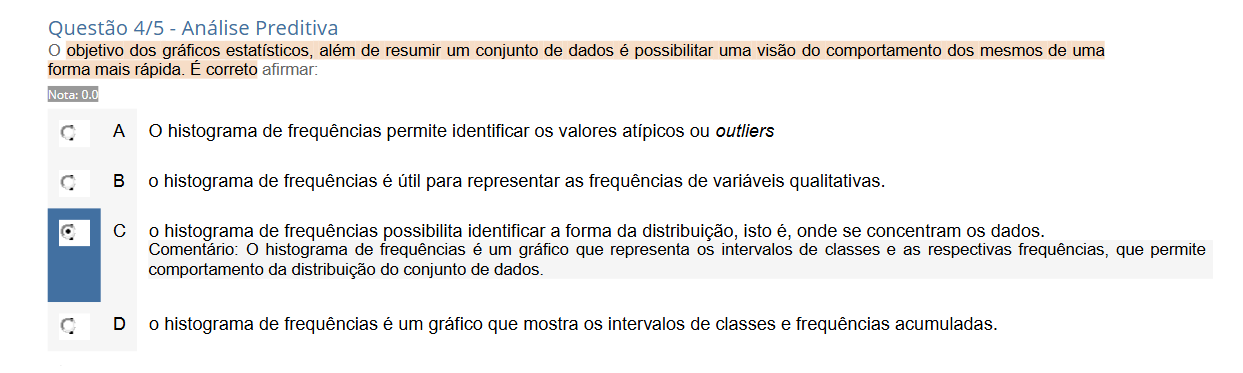 Questão 4/5 - Análise Preditiva o objetivo dos gráficos estatísticos, além de resumir um conjunto de dados é possibilitar uma visão do comportamento dos mesmos de uma forma mais rápida. É correto Nota: A O histograma de frequências permite identificar os valores atípicos ou outliers B o histograma de frequências é útil para representar as frequências de variáveis qualitativas. C o histograma de frequências possibilita identificar a forma da distribuição, isto é, onde se concentram os dados. Comentário: o histograma de frequências é um gráfico que representa os intervalos de classes e as respectivas frequências, que permite comportamento da distribuição do conjunto de dados. D o histograma de frequências é um gráfico que mostra os intervalos de classes e frequências acumuladas.
