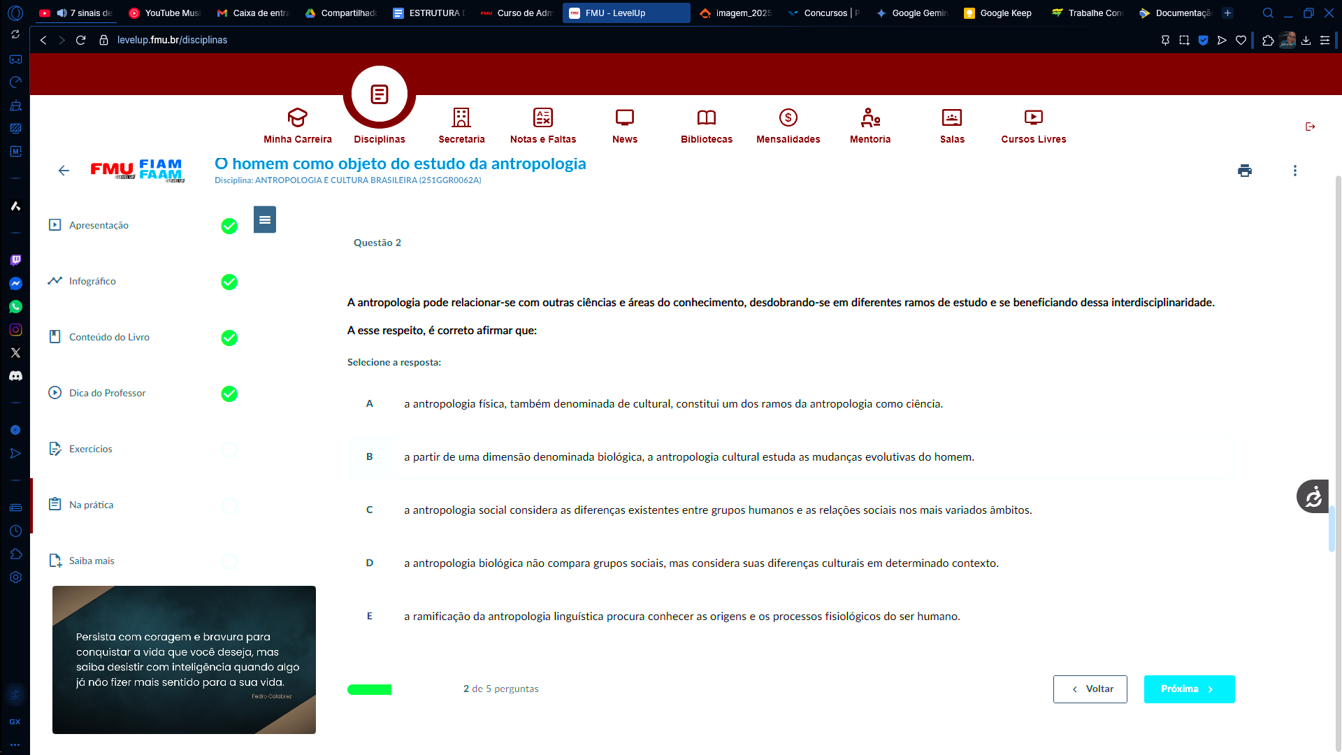 sinais de YouTube Mus Caixa de entra Compartilhad ESTRUTURA Curso de Adm FMU LevelUp imagem_2025 Concursos Google Gemir Google Keep Trabalhe Con X levelup.fmu.br/disciplinas $ Minha Carreira Disciplinas Secretaria Notas e Faltas News Bibliotecas Mensalidades Mentoria Salas Cursos Livres FMU FIAM homem como objeto do estudo da antropologia FAAM Disciplina: ANTROPOLOGIA E CULTURA BRASILEIRA (251GGR0062A) Apresentação Questão 2 Infográfico A antropologia pode relacionar-se com outras ciências e áreas do conhecimento, desdobrando-se em diferentes ramos de estudo e se beneficiando dessa interdisciplinaridade. A esse respeito, é correto afirmar que: Conteúdo do Livro Selecione a resposta: Dica do Professor A a antropologia física, também denominada de cultural, constitui um dos ramos da antropologia como ciência. Exercícios B a partir de uma dimensão denominada biológica, a antropologia cultural estuda as mudanças evolutivas do homem. Na prática a antropologia social considera as diferenças existentes entre grupos humanos e as relações sociais nos mais variados âmbitos. Saiba mais D a antropologia biológica não compara grupos sociais. mas considera suas diferenças culturais em determinado contexto. O E a ramificação da antropologia linguística procura conhecer as origens e os processos fisiológicos do ser Persista com coragem e bravura para conquistar a vida que você deseja, mas saiba desistir com inteligência quando algo já não fizer mais sentido para a sua vida 2 de 5 perguntas GX