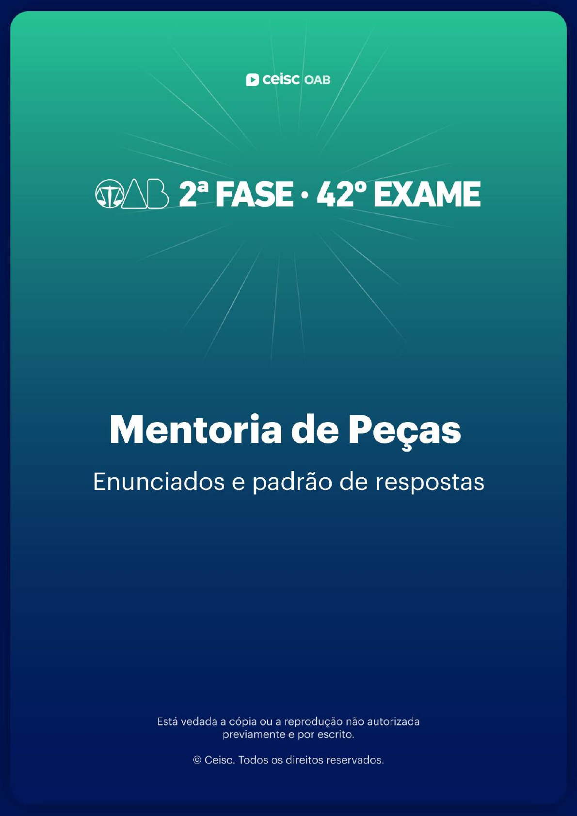 Olá, alunos! Sejam bem-vindos ao treinamento de peças. O presente e-book contém diversas peças para que você realize o treinamento. Sugerimos que você imprima as linhas que estão nas páginas seguintes e pratique as peças à mão, consultando apenas a legislação permitida, simulando ao máximo as condições que você terá no dia da prova. Qualquer dúvida, estaremos à disposição para auxiliá-los através da ferramenta “Pergunte ao professor”! Bons estudos, Abraços, Equipe Ceisc. 2ª FASE OAB | PENAL | 42º EXAME Mentoria de Peças SUMÁRIO Queixa-Crime .......................................................................................................................................... 5 Resposta à Acusação ............................................................................................................................. 7 Memoriais ................................................................................................................................................ 9 Recurso de Apelação ........................................................................................................................... 11 Contrarrazões de Apelação ................................................................................................................. 13 Memoriais do Procedimento do Júri .................................................................................................... 16 Recurso em Sentido Estrito contra decisão de pronúncia ................................................................. 17 Agravo em Execução ........................................................................................................................... 19 Revisão Criminal ................................................................................................................................... 20 Relaxamento de Prisão em Flagrante ................................................................................................. 21 Apelação do Assistente de Acusação no Procedimento do Júri ....................................................... 22 Apelação no Tribunal do Júri ................................................................................................................ 24 Embargos Infringentes .......................................................................................................................... 25 Recurso Ordinário Constitucional ........................................................................................................ 26 Liberdade Provisória ............................................................................................................................. 27 Revogação da Prisão Preventiva ........................................................................................................ 28 Defesa Preliminar – Funcionário Público ............................................................................................ 29 Defesa Preliminar – Lei de Drogas ...................................................................................................... 30 Carta Testemunhável ........................................................................................................................... 31 Razões de Apelação............................................................................................................................. 32 Contrarrazões de Agravo em Execução ............................................................................................. 34 Contrarrazões de Recurso em Sentido Estrito ................................................................................... 36 Padrão De Respostas Queixa Crime ........................................................................................................................................ 39 Resposta à Acusação ........................................................................................................................... 44 Memoriais .............................................................................................................................................. 49 Recurso de Apelação ........................................................................................................................... 55 Contrarrazões de Apelação ................................................................................................................. 62 Memoriais do Procedimento do Júri .................................................................................................... 70 Recurso em Sentido Estrito contra decisão de pronúncia ................................................................. 73 Agravo em Execução ........................................................................................................................... 79 Revisão Criminal ................................................................................................................................... 84 Relaxamento de Prisão em Flagrante ................................................................................................. 88 Apelação do Assistente de Acusação no Procedimento do Júri ....................................................... 92 Apelação no Tribunal do Júri ................................................................................................................ 98 Embargos Infringentes ........................................................................................................................ 103 Recurso Ordinário Constitucional ...................................................................................................... 107 Liberdade Provisória ........................................................................................................................... 111 Revogação da Prisão Preventiva ..................................................