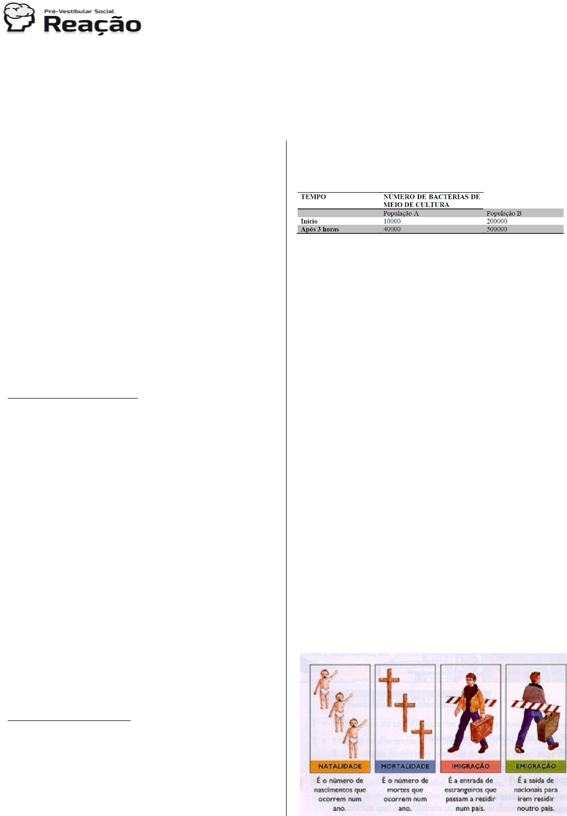 Ecologia de populações Características gerais das populações Curvas de crescimento populacional Estrutura etária e fatores que regulam o crescimento das populações Curva de crescimento da população humana BIOLOGIA III 1. Introdução Os estudos até aqui permearam a biosfera, ecossistemas e comunidades, entretanto uma parte da Ecologia destina-se ao estudo de como as populações se comportam dentro do ecossistema. Em um ecossistema com equilíbrio dinâmico, o tamanho da população se mantém mais ou menos constante ao longo do tempo e modificações nas características ecológicas podem gerar desequilíbrios ecológicos. Uma população biológica é um grupo de indivíduos da mesma espécie que convivem em determinado habitat. 2. Características gerais das populações As principais características que determinam o equilíbrio de uma população e são afetados mediante uma ação qualquer sobre a mesma são densidade populacional e tamanho populacional. 1 – Densidade Populacional: a densidade corresponde ao número de indivíduos de uma população que vivem em uma específica área ou volume. Este conceito pode ser matematizado pela fórmula: D = Número de Indivíduos/Área ou Volume O estudo estatístico do tamanho e da estrutura das populações (idade e sexo dos indivíduos), assim como a variação desses parâmetros é denominado demografia. Em populações humanas, a densidade demográfica é calculada com base no recenseamento, os censores demográficos, realizados pelo IBGE (Instituto Brasileiro de Geografia e Estatística), por exemplo: no ano de 2000, o censo demonstrou que a população brasileira continha 169 milhões de pessoas, em 8,5 milhões de quilômetros de território nacional, demonstrando que existe uma densidade de 17,6 hab./km2. Hipoteticamente aproximadamente 18 pessoas vivem a cada quilometro quadrado. O crescimento populacional depende de dois conjuntos de fatores, os que aumentam a densidade (taxa de natalidade e imigração) e os que diminuem a densidade (taxa de mortalidade e emigração). A interação destas variáveis determina o tamanho populacional. 2 – Tamanho Populacional: importante para se entender o comportamento da população dentro do ecossistema. As medições populacionais ao longo do tempo informam se as mesmas estão em declínio, estáveis ou em progressão. A taxa de crescimento da população pode ser definida como a variação do tamanho populacional em determinado intervalo de tempo. Veja a situação para entender as fórmulas de crescimento. Exemplo: Duas populações distintas de bactérias foram cultivadas e apresentam tamanho populacional como apresentado na tabela. Determine a taxa de crescimento. Para determinar a taxa de crescimento da população, ou seja, o quanto a população cresceu em relação ao seu tamanho inicial, realiza-se uma fórmula. Inicialmente toma-se o número de indivíduos no tempo final (Nf) e subtrai-se do número de indivíduos no tempo inicial (Ni). Após essa subtração, divide- se o resultado pelo número de indivíduos da população no tempo inicial (Ni). Em seguida, divide-se todo esse resultado pelo tempo de crescimento (T). Taxa de Crescimento = (Nf – Ni)/Ni)/T Resposta: Taxa de Crescimento da População A: (40.000 – 10.000)/10.000)/3 Taxa de Crescimento da População A: (30.000/10.000)/3 Taxa de Crescimento da População A: 3/3 Taxa de Crescimento da População A: 1 pop/h Taxa de Crescimento da População B: (500.000 – 200.000)/200.000)/3 Taxa de Crescimento da População B: (300.000/200.000)/3 Taxa de Crescimento da População B: 1,5/3 Taxa de Crescimento da População B: 0,5 pop/h Esses resultados indicam que a população A cresce mais rápido que a população B. Em A, em uma hora foi acrescida uma população inteira, ao passo que na B, meia população foi acrescida em uma hora. Os quatro fatores que interferem no tamanho populacional são: taxa de natalidade, taxa de mortalidade, emigração e imigração. Entre estas quatro variáveis podem-se estabelecer as seguintes relações: N + I = M + E: população estável N + I > M + E: população aumenta N + I 2 (CRESCIMENTO) IFda mesma espécie na sua dominância pelo local. Um exemplo claro dessa competição reside na delimitação territorial por machos da mesma população que impedem que outros machos da mesma espécie se aproximem e estabeleçam território, aumentando as chances, então de conseguirem fêmeas, como os leões-marinhos. Competição Interespecífica: como explicitado em aulas anteriores, este tipo de competição ocorre principalmente quando há nichos ecológicos sobrepostos, culminando na especialização de uma determinada espécie aquele nicho e a extinção ou migração da outra espécie. O Princípio da Exclusão Competitiva de Gause ilustra o caso extintivo, no que tange a queda no número populacional dos indivíduos da espécie Paramecium caudatum. Predação: a relação predador-presa auxilia no tamanho das populações, uma vez que a densidade de predadores auxilia na densidade de presas e vice-versa. O exemplo clássico estudado no Canadá com linces e lebres ilustra bem o aumento no número de lebres quando ocorre redução no número de predadores e o aumento no numero de linces diminui o número de lebres porque elas serão muito predadas, comportando-se de forma complementar. Parasitismo: os parasitas são seres vivos extremamente específicos, porque não tem a capacidade de variar em relação aos hospedeiros, portanto na ausência de seu hospedeiro ele entra em colapso ou em dormência. Entretanto, em virtude da sua alta especificidade, ele e amplamente utilizado no controle de pragas, porque conseguem agir diretamente sobre a praga que deve ser erradicada, enquanto que a utilização de um predador pode se tornar um problema, já que ele pode encontrar outras formas de alimento e aumentar seu numero populacional tornando-se outra praga. 5. Crescimento da Popula