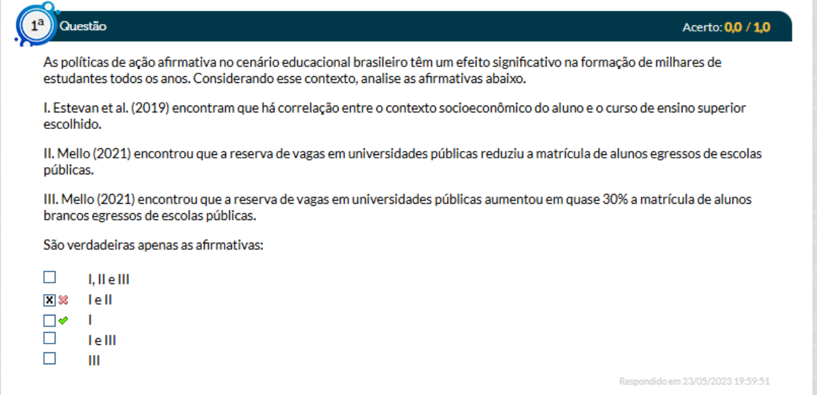 Questão Acerto: As políticas de ação afirmativa no cenário educacional brasileiro têm um efeito significativo na formação de milhares de estudantes todos os anos. Considerando esse contexto, analise as afirmativas abaixo. I. Estevan et al. (2019) encontram que há correlação entre o contexto socioeconômico do aluno e o curso de ensino superior escolhido. II. Mello (2021) encontrou que a reserva de vagas em universidades públicas reduziu a matrícula de alunos egressos de escolas públicas. III. Mello (2021) encontrou que a reserva de vagas em universidades públicas aumentou em quase 30% a matrícula de alunos brancos egressos de escolas públicas. São verdadeiras apenas as afirmativas: II e III e e III III Respondido em 23/05/2023 19:59:51Questão Acerto: Bertrand e Mullainathan (2004) conduzem um experimento sobre a economia da discriminação no mercado de trabalho. Considerando esse estudo analise as afirmativas abaixo. I. Os resultados encontrados por Bertrand e Mullainathan (2004) indicam que empregadores respondem 50% a mais a currículos de pessoas brancas do que de pessoas negras, dado um mesmo nível de competência dos currículos. II. Bertrand e Mullainathan (2004) estimam que um nome branco proporciona a mesma quantidade de resposta para entrevista que um adicional de 2 anos de experiência para negros. III. Os resultados de Bertrand e Mullainathan (2004) apontam que viver em um bairro mais rico aumenta as taxas de retorno da entrevista. São verdadeiras apenas as afirmativas: III le III le Respondido em 23/05/2023 20:01:10Questão Acerto: A reeleição é fundamental para modelo de agência política. Sobre esse tema considere as afirmativas abaixo. I.O risco moral é um dos fundamentos do modelo clássico de principal e agente. II. Uma maior accountability por parte dos eleitores não leva a resultados mais alinhados com as preferências dos eleitores. III. As regras formais de uma democracia tem como objetivo conectar diretamente a performance de um político e sua probabilidade de reeleição. São verdadeiras as afirmativas: Apenas | e III. Apenas I. Apenas e III. Apenas III. Apenas e II. Respondido em 23/05/2023 20:02:28Questão Acerto: efeito da divulgação de informações e da grande mídia nas eleições é fonte de diversos estudos. Considere as afirmativas abaixo que tratam desse aspecto. I. Ferraz e Finan (2008) compararam municípios auditados apenas após as eleições municipais, condicionais aos seus níveis de corrupção reportada para capturar o fato de que auditorias podem ter um efeito positivo ou negativo, a depender do teor do relatório divulgado e se os eleitores superestimam ou subestimam o nível de corrupção de seus prefeitos. II. Ferraz e Finan (2008) encontram que apenas a divulgação das informações, independente da crença anterior sobre políticos, não necessariamente aumentam accountability III. Segundo DellaVigna e Kaplan (2007), o efeito da emissora foi reduzido nas cidades com mais canais a cabo. FERRAZ, C. e FINAN, F. Exposing Corrupt Politicians: The Effects of Publicly Released Audits on Electoral Outcomes. Quarterly Journal of Economics, 123(2), DELLAVIGNA S. e KAPLAN E. The Fox News effect: media bias and voting. Quarterly Journal of Economics 2007. São verdadeiras as afirmativas: Apenas e Apenas e III Apenas e III Apenas III Apenas Respondido em 23/05/2023 20:04:43