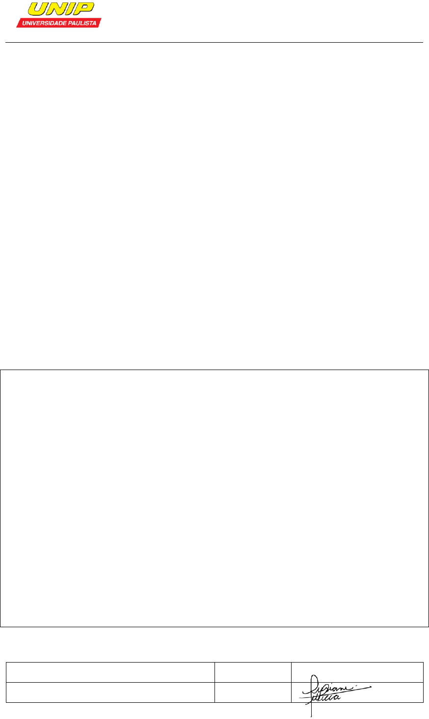 UNIVERSIDADE PAULISTA – UNIP Instituto de Ciências da Saúde Página 1 de 5 Curso de Nutrição Registro Acadêmico Relativo às Atividades de Extensão Campus: UNIP /Limeira Se FLEX, indique o Polo: Limeira I e II, Americana, Artur Nogueira e Cosmópolis. Período de matrícula: 2º Período Ano da Realização da Atividade: 2024 Mês da realização da atividade: Novembro Área Temática: SAÚDE Projeto: Ações de educação e saúde voltados à sociedade (panfletos e infográficos). Ação e Carga Horária: Panfleto informativo - Carga horária 30 horas RELATÓRIO No dia 17 de setembro de 2024 foram apresentados aos alunos do 2º semestre do curso de Nutrição EaD/Flex, a necessidade do cumprimento de atividades de extensão, na ocasião solicitou-se aos alunos que formassem grupos de 5 ou 6 pessoas e selecionassem temas para elaboração de panfletos explicativos. Os alunos optaram pelos seguintes temas: Plantas alimentícias não convencionais (Panc´s), adulteração do leite e processo de degradação do mel. Dezessete alunos participaram da atividade, elaborando panfletos sobre os tópicos selecionados que foram expostos em formato A3 na clínica de Nutrição da Universidade Paulista UNIP, Campus Limeira. Os panfletos foram entregues ao professor responsável no dia 29 de outubro. A clínica recebe estagiários do curso de Nutrição e é aberta para atendimento ao público, recebendo moradores da cidade de Limeira e região, sendo o conteúdo abordado, importante para orientação. Em anexo, fotos da disposição dos panfletos fixados em mural da clínica e também da Jornada da Saúde que ocorreu nos dias 06 e 07 de novembro, em evento aberto ao público. Responsável Funcional Assinatura Profa. Dra. Lusiane Malafatti Picca 9212715498 UNIVERSIDADE PAULISTA – UNIP Instituto de Ciências da Saúde Página 3 de 5 Anexo_ Fotos da disposição dos cartazes (panfletos explicativos) UNIVERSIDADE PAULISTA – UNIP Instituto de Ciências da Saúde Página 4 de 5 UNIVERSIDADE PAULISTA – UNIP Instituto de Ciências da Saúde Página 5 de 5