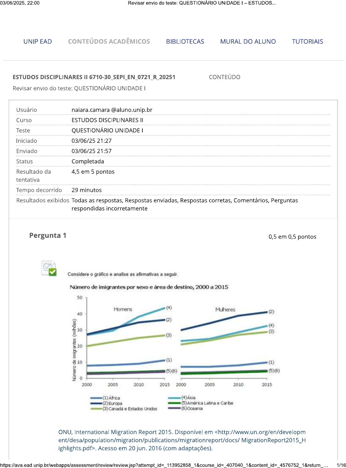 03/06/2025, 22:00 Revisar envio do teste: QUESTIONÁRIO UNIDADE - ESTUDOS... UNIP EAD CONTEÚDOS ACADÊMICOS BIBLIOTECAS MURAL DO ALUNO TUTORIAIS ESTUDOS DISCIPLINARES II 6710-30_SEPI_EN_0721_R_20251 CONTEÚDO Revisar envio do teste: QUESTIONÁRIO UNIDADE Usuário Curso ESTUDOS DISCIPLINARES Teste QUESTIONÁRIO UNIDADE Iniciado 03/06/25 21:27 Enviado 03/06/25 21:57 Status Completada Resultado da 4,5 em 5 pontos tentativa Tempo decorrido 29 minutos Resultados exibidos Todas as respostas, Respostas enviadas, Respostas corretas, Comentários, Perguntas respondidas incorretamente Pergunta 1 0,5 em 0,5 pontos Considere o gráfico e analise as afirmativas a Número de imigrantes por sexo e área de destino, 2000 a 2015 50 Homens (4) Mulheres (2) 40 (2) (4) 30 (3) (3) 20 de 10 (1) (1) (5)(6) (5)(6) 0 2000 2005 2010 2015 2000 2005 2010 2015 (1) África (4)Asia (2) Europa (5) Latina e Caribe (3) Canadá e Estados Unidos (6) Oceania ONU, International Migration Report 2015. Disponível em . Acesso em 20 jun. 2016 (com adaptações). 1/1603/06/2025, 22:00 Revisar envio do teste: QUESTIONÁRIO UNIDADE ESTUDOS... I-A Ásia é o lugar de destino que, em 2015, apresentou a maior diferença entre o número de homens e de mulheres imigrantes. II-O número de mulheres com destino à Europa cresceu mais no período de 2000 a 2010 do que no período de 2010 a 2015. III-O número de imigrantes que chegaram à Europa em 2015 foi 35 milhões. É correto o que se afirma em: Resposta Selecionada: b. e II, apenas. Respostas: I, e III. a. b. e II, apenas. e III, apenas. C. d. e III, apenas. I, apenas. e. Comentário Resposta: B da resposta: Análise das afirmativas. Afirmativa correta. JUSTIFICATIVA. Do gráfico, vemos que, em 2015, os números de imigrantes homens foram os indicados a seguir. Para a África: cerca de 10 milhões. Para a Europa: cerca de 35 milhões. Para o Canadá e para os Estados Unidos: cerca de 25 milhões. Para a Ásia: cerca de 45 milhões. Do gráfico, vemos que, em 2015, os números de imigrantes mulheres foram os indicados a seguir. Para a África: cerca de 10 milhões. Para a Europa: cerca de 40 milhões. Para o Canadá e para os Estados Unidos: cerca de 25 milhões. Para a Ásia: cerca de 30 milhões. Temos, então, que as diferenças entre os números de imigrantes homens e de mulheres foram de cerca de 5 milhões para a Europa e cerca de 15 milhões para a Ásia. Nas demais regiões, os números de imigrantes homens e mulheres foram similares. II Afirmativa correta. JUSTIFICATIVA. Para analisarmos crescimento, devemos comparar as inclinações dos gráficos: quanto maior a "inclinação para a direita", maior a taxa de crescimento. Vemos, no gráfico de imigrantes mulheres com destino à Europa, que a inclinação é maior no período de 2000 a 2010 do que no período entre 2010 e 2015, o que evidencia menor taxa de imigração no segundo período. III Afirmativa incorreta. JUSTIFICATIVA. Considerando que os imigrantes são classificados, nos gráficos, por gênero, tivemos cerca de 35 milhões de imigrantes homens e cerca de 40 milhões de mulheres com destino à Europa em 2015. Somando o número de homens e o número de mulheres, temos cerca de 75 milhões de imigrantes com destino à Europa nesse ano. Pergunta 2 0,5 em 0,5 pontos (Enade 2016) Leia o texto a seguir. A articulação indígena e quilombola vem-se consolidando em Oriximiná, no Pará, desde 2012, com o objetivo de incentivar a parceria entre índios e quilombolas frente a novos desafios comuns. A aliança possibilitou, em 2015, a reaproximação entre índios da Terra 2/1603/06/2025, 22:00 Revisar envio do teste: QUESTIONÁRIO UNIDADE ESTUDOS... Indígena Kaxuyana Tunayana e os quilombolas da Terra Quilombola Cachoeira Porteira, cujas relações, no processo de regularização de suas terras, haviam assumido ares de conflito. Reunidos no Quilombo Abuí, escolhido como local neutro e livre de influências externas, em maio de 2015, lideranças indígenas e quilombolas de ambas as terras, com a mediação de lideranças quilombolas de outras comunidades, acordaram os limites territoriais para fins de regularização fundiária. acordo foi oficializado junto ao Ministério Público Federal e ao Ministério Público Estadual. Disponível em . Acesso em 29 ago. 2016 (com adaptações). A análise dessa situação evidencia a importância da: Resposta a. Selecionada: Autodeterminação dos povos tradicionais na definição de seus limites territoriais. Respostas: a. Autodeterminação dos povos tradicionais na definição de seus limites territoriais. b. Intervenção prévia do Estado em situações de potencial conflito entre povos tradicionais. C. Urgência de regularização das terras quilombolas e indígenas, priorizando-se áreas isentas de conflitos. d. Definição, por atores externos, dos desafios comuns a serem enfrentados pelos povos tradicionais. e. Participação do Ministério Público nas negociações de limites territoriais entre quilombolas e indígenas. Comentário Resposta: A da resposta: Análise das alternativas. A - Alternativa correta. JUSTIFICATIVA. texto mostra lideranças indígenas e quilombolas dialogando para solucionar conflitos territoriais, sem a participação de terceiros. B Alternativa incorreta. JUSTIFICATIVA. texto trata da importância da "parceria entre índios e quilombolas", independentemente de agentes externos, como o Estado. Alternativa incorreta. JUSTIFICATIVA. O texto trata de um acordo para resolver conflitos entre índios e quilombolas, não trata da regularização de terras por parte do Estado. D Alternativa incorreta. JUSTIFICATIVA. O ponto central do texto é que o conflito entre indígenas e quilombolas está sendo resolvido por comum acordo entre as partes, sem a interferência externa. E - Alternativa incorreta. JUSTIFICATIVA. O texto não cita a interferência externa na resolução dos conflitos, muito menos a intervenção do Ministério Pergunta 3 0,5 em 0,5 ponto