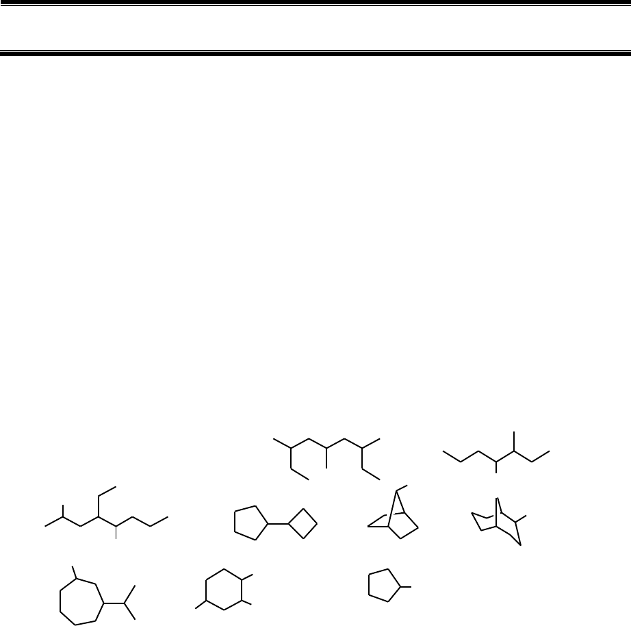 1 TEÓRICO-PRÁTICA Nº2 1. Escreva a fórmula de estrutura de cada um dos seguintes compostos: a) 1,4-dicloropentano b) 4-metilpentan-2-ol c) 4-isopropil-heptano d) 2,2,3-trimetilpentano e) 3-etil-2-metil-hexano f) 1,4-diciclopropil-hexano g) 1,1-diclorociclopentano i) ciclopentilciclopentano j) 1-bromo-2,4-dicloro-hexano k) biciclo[2.2.2]octano l) biciclo[3.1.1]heptano 2. Atribua o nome IUPAC a cada um dos seguintes compostos: a) b) c) d) e) f) g) CH3CH2C(CH3)2CHOHCH3 OH Br Br Cl Br h) HO CH2CH3 CH3H3C i) j) CH2CH(CH3)2 3. Escreva a estrutura e dê o nome IUPAC de um alcano ou cicloalcano com a fórmula molecular: a) C8H18, que tenha apenas átomos de hidrogénio primários. b) C6H12, que tenha apenas átomos de hidrogénio secundários. c) C6H12, que tenha apenas átomos de hidrogénio primários e secundários. d) C8H14, que tenha 12 átomos de hidrogénio secundários e 2 átomos de hidrogénio terciários. 4. Três diferentes alcenos originaram o 2-metilbutano quando foram tratados, separadamente, com hidrogénio na presença de um catalisador. Escreva as fórmulas de estrutura dos três alcenos e o esquema das reacções envolvidas. 5. Quatro ciclo-alcenos diferentes dão origem ao metilciclopentano quando tratados, separadamente, com hidrogénio na presença de um catalisador. Faça o esquema das reacções, ilustrando a fórmula de estrutura de cada um dos alcenos. 2 6. Os calores de combustão de três isómeros do pentano (C5H12) são os seguintes: CH3(CH2)3CH3 - 845,2 Kcal mol-1 CH3CH(CH3)CH2CH3 - 843,4 Kcal mol-1 (CH3)3CCH3 - 840,0 Kcal mol-1 Diga, justificando a sua resposta, qual é o isómero mais estável. 7. Escreva as estruturas de duas conformações em cadeira do 1-ter-butil-1-metilciclo-hexano. Diga, justificando a sua resposta, qual é a conformação mais estável. 8. Considere o 1-bromopropano. a) Desenhe a projecção de Newman para a conformação na qual os grupos CH3 e Br são anti. b) Desenhe a projecção e Newman para a conformação na qual os grupos CH3 e Br são gauche. c) Diga, justificando a sua resposta, qual das conformações referidas anteriormente é menos energética. 9. Considere o 1-bromo-2-metilpropano e desenhe: a) a (s) conformação (ões) em estrela de mais baixa energia. b) a (s) conformação (ões) em estrela de mais alta energia. 10. Escreva e diga como se designam as projecções de Newman relativas à rotação em torno da ligação C2-C3 do 2,3-dimetilbutano e do 2,2,3,3-tetrametilbutano. Apresente o gráfico relativo à análise conformacional de cada composto (não necessita de usar valores numéricos das variações de energia, apenas os máximos e mínimos que correspondem a cada conformação).