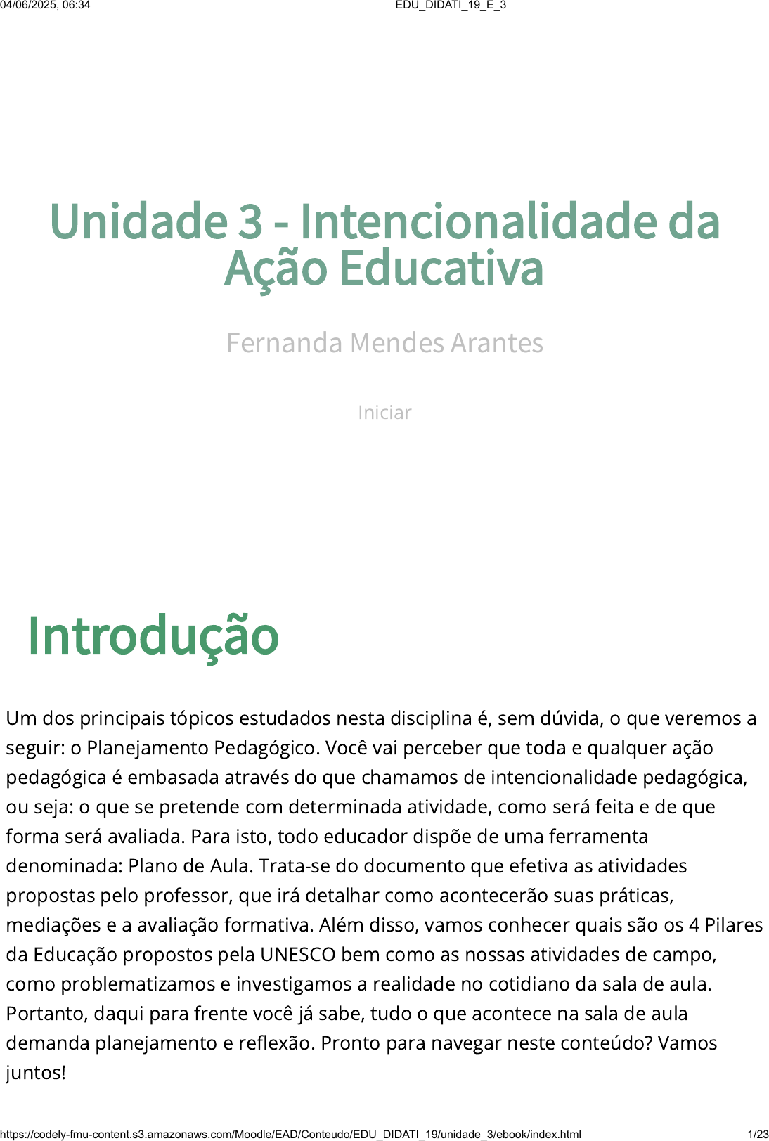 Introdução Um dos principais tópicos estudados nesta disciplina é, sem dúvida, o que veremos a seguir: o Planejamento Pedagógico. Você vai perceber que toda e qualquer ação pedagógica é embasada através do que chamamos de intencionalidade pedagógica, ou seja: o que se pretende com determinada atividade, como será feita e de que forma será avaliada. Para isto, todo educador dispõe de uma ferramenta denominada: Plano de Aula. Trata-se do documento que efetiva as atividades propostas pelo professor, que irá detalhar como acontecerão suas práticas, mediações e a avaliação formativa. Além disso, vamos conhecer quais são os 4 Pilares da Educação propostos pela UNESCO bem como as nossas atividades de campo, como problematizamos e investigamos a realidade no cotidiano da sala de aula. Portanto, daqui para frente você já sabe, tudo o que acontece na sala de aula demanda planejamento e reflexão. Pronto para navegar neste conteúdo? Vamos juntos! Unidade 3 - Intencionalidade da Ação Educativa Fernanda Mendes Arantes Iniciar 04/06/2025, 06:34 EDU_DIDATI_19_E_3 https://codely-fmu-content.s3.amazonaws.com/Moodle/EAD/Conteudo/EDU_DIDATI_19/unidade_3/ebook/index.html 1/23 1. Plano de Aula O Plano de Aula é uma ferramenta essencial ao trabalho do educador. Nela, o professor estabelece quais serão seus os objetivos (geral e específicos), conteúdos, metodologias, avaliação e a partir de quais referências aquela atividade foi estruturada. Vamos detalhar um pouco melhor para que você conheça o Plano de Aula em sua totalidade. Sabemos que a Educação é um processo complexo, que demanda conhecimento e planejamento, mas, não é somente isto. Dentro deste macroprocesso existem algumas unidades que a constituem, a saber: conhecimento, análise, compreensão, aplicação, síntese e avaliação. Estas unidades foram delimitadas na Taxonomia de Bloom, que você conhecerá mais profundamente na próxima Unidade. Agora, vamos conhecer minimamente cada uma delas para favorecer o entendimento da sua necessidade no trabalho com o planejamento: Conhecimento: Agora é hora do professor se perguntar: como meu aluno constrói seu conhecimento? E a resposta é: a partir dos seus conhecimentos prévios, aliado à mediação docente e aos conhecimentos que serão construídos na escola e na vida Análise: A análise acontece a partir dos conhecimentos que se recebe do meio externo e da mediação interna, mobilizando as estruturas cognitivas que compõe a inteligência humana. Compreensão: A compreensão decorre da inter-relação que se estabelece entre os dois processos anteriores: conhecimento e análise. Portanto, só posso afirmar que o conteúdo foi efetivamente compreendido por meu aluno quando este conteúdo “faz sentido”. Se o conhecimento é apenas memorizado e reproduzido, a compreensão não aconteceu. Aplicação: é a experimentação do conhecimento. Seja um conteúdo de Matemática, Língua Portuguesa, Ciências… Ou seja, a aplicação decorre da compreensão do conhecimento, é o momento onde a teoria é aplicada na prática. Síntese: A síntese é estabelecida cognitivamente para que possamos organizar o processo educativo de maneira intencional e partirmos para um novo conhecimento. 04/06/2025, 06:34 EDU_DIDATI_19_E_3 https://codely-fmu-content.s3.amazonaws.com/Moodle/EAD/Conteudo/EDU_DIDATI_19/unidade_3/ebook/index.html 2/23 Avaliação: Quando falamos em avaliação não estamos nos referindo necessariamente às provas escritas tradicionais. A avaliação deve acontecer ao longo do processo para a aprendizagem do aluno e também pelos professores, e serve para mensurar a efetividade do processo de ensino aprendizagem, ou seja, indicar em que medida a aprendizagem está de fato ocorrendo. Pois bem, estes elementos estão envolvidos no seu cotidiano enquanto professor, e o planejamento de suas aulas necessita da articulação destes componentes. O planejamento é macro quando nos referimos ao ato de planejar um semestre ou ano letivo, e é micro quando nos referimos à um plano de aula. O plano de aula pode fazer parte de uma sequência didática, ou pode acontecer de maneira isolada. Vamos conhecer um pouco mais a respeito dessa ferramenta pedagógica. Haydt (2001) afirma que: “(...) o planejamento é um processo mental que envolve análise, reflexão e previsão”. Para elaborar um plano de aula, é necessário estudar, refletir, prever o que pode acontecer e em qual medida de tempo e espaço. Libâneo (1994) afirma que: “os planos devem ser como um guia de orientação e devem apresentar uma ordem sequencial, objetividade, coerência e flexibilidade”. Vamos imaginar que você é um professor de Educação Infantil atuando com crianças na faixa de 3 a 4 anos de idade e deseja auxiliar as crianças na construção de sua identidade. Para isto, você precisa estabelecer um planejamento. Nossa sugestão aqui é trabalhar com uma sequência didática, ou seja, vários planos de aula em sequência. Neste exemplo prático, nossa ideia é trabalhar o conteúdo em três aulas, ou seja, três momentos de situações de aprendizagem. Como as crianças são pequenas o tempo destinado ao foco e atenção é pequeno, portanto, o educador tem que ser lúdico e criativo. Para iniciarmos qualquer temática em sala de aula, partimos sempre do conhecimento prévio do estudante, portanto no Plano de Aula 1 nossa atividade inicial sugerida é a Roda de Conversa. A estruturação deste item dentro do Plano de Aula é estabelecida desta forma: Tema: Construção da Identidade Duração : 20 min. 04/06/2025, 06:34 EDU_DIDATI_19_E_3 https://codely-fmu-content.s3.amazonaws.com/Moodle/EAD/Conteudo/EDU_DIDATI_19/unidade_3/ebook/index.html 3/23 Objetivos: auxiliar a criança a desenvolver noções de pertencimento de si próprio enquanto indivíduo no mundo. Favorecer o reconhecimento de si e dos colegas da turma e demais pessoas do seu convívio. Conteúdo: Quem sou eu? Que