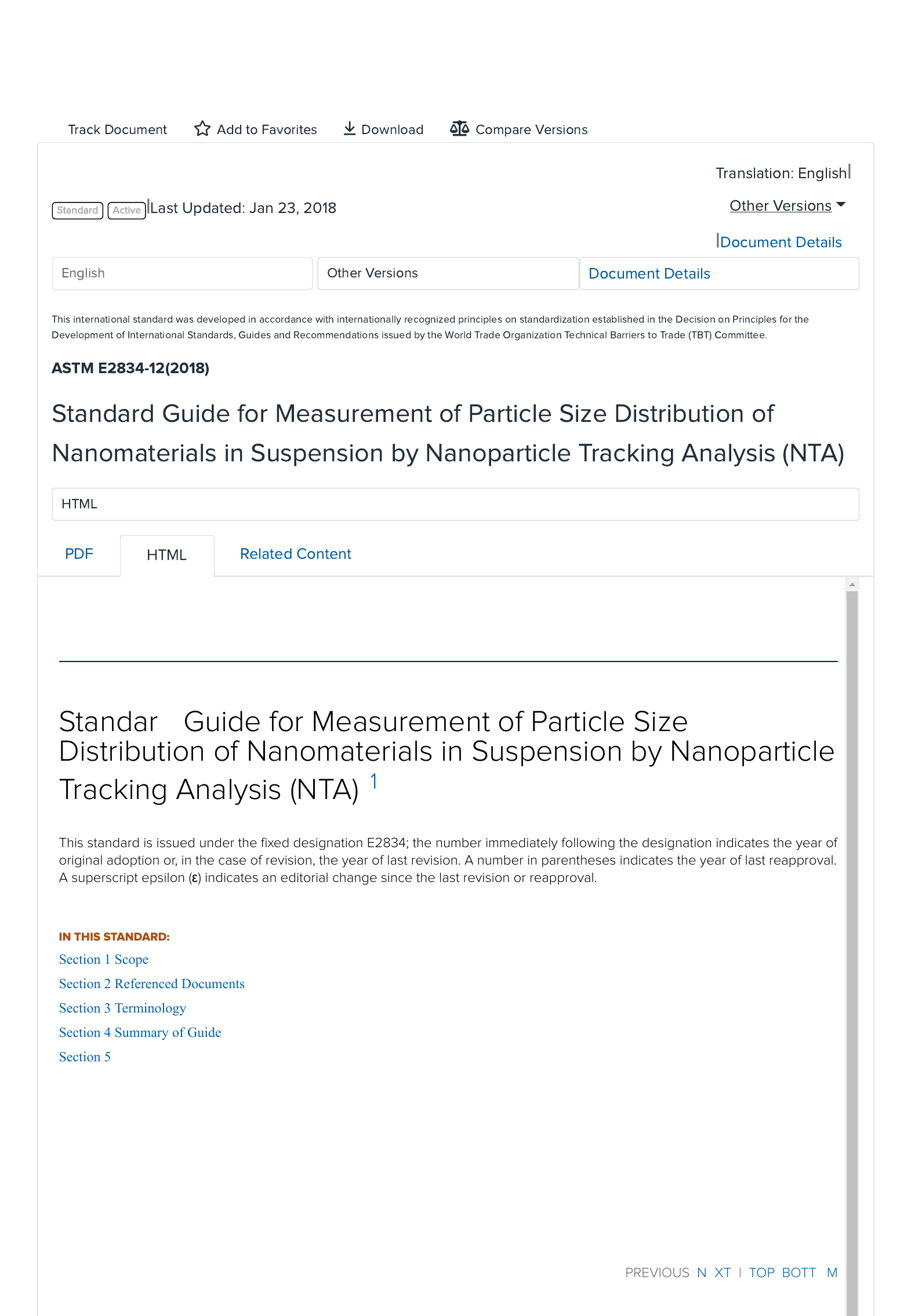 Track Document Add to Favorites Download Compare Versions Standard Active |Last Updated: Jan 23, 2018 Translation: English| |Document Details Document Details This international standard was developed in accordance with internationally recognized principles on standardization established in the Decision on Principles for the Development of International Standards, Guides and Recommendations issued by the World Trade Organization Technical Barriers to Trade (TBT) Committee. ASTM E2834-12(2018) Standard Guide for Measurement of Particle Size Distribution of Nanomaterials in Suspension by Nanoparticle Tracking Analysis (NTA) PDF HTML Related Content PREVIOUS NEXT | TOP BOTTOM Standard Guide for Measurement of Particle Size Distribution of Nanomaterials in Suspension by Nanoparticle Tracking Analysis (NTA) 1 This standard is issued under the fixed designation E2834; the number immediately following the designation indicates the year of original adoption or, in the case of revision, the year of last revision. A number in parentheses indicates the year of last reapproval. A superscript epsilon (ε) indicates an editorial change since the last revision or reapproval. IN THIS STANDARD: Section 1 Scope Section 2 Referenced Documents Section 3 Terminology Section 4 Summary of Guide Section 5 Significance and Use Section 6 Reagents Section 7 Procedure Section 8 Test Method Section 9 Report Section 10 Keywords REFERENCES Footnotes 1 | SCOPE 1.1 This guide deals with the measurement of particle size distribution of suspended particles, from ~10 nm to the onset of sedimentation, l d d i h i l ki l i ( ) h i d id l h d l Designation: E2834–12 (Reapproved 2018) Other Versions English Other Versions HTML PREVIOUS NEXT | TOP BOTTOM PREVIOUS NEXT | TOP BOTTOM sample dependent, using the nanoparticle tracking analysis (NTA) technique. It does not provide a complete measurement methodology for any specific nanomaterial, but provides a general overview and guide as to the methodology that should be followed for good practice, along with potential pitfalls. 1.2 The values stated in SI units are to be regarded as standard. No other units of measurement are included in this standard. 1.3 This standard does not purport to address all of the safety concerns, if any, associated with its use. It is the responsibility of the user of this standard to establish appropriate safety, health, and environmental practices and determine the applicability of regulatory limitations prior to use. 1.4 This international standard was developed in accordance with internationally recognized principles on standardization established in the Decision on Principles for the Development of International Standards, Guides and Recommendations issued by the World Trade Organization Technical Barriers to Trade (TBT) Committee. 2 | REFERENCED DOCUMENTS 2.1 ASTM Standards: 2 C322 Practice for Sampling Ceramic Whiteware Clays E456 Terminology Relating to Quality and Statistics E1617 Practice for Reporting Particle Size Characterization Data E2490 Guide for Measurement of Particle Size Distribution of Nanomaterials in Suspension by Photon Correlation Spectroscopy (PCS) 2.2 ISO Standards: 3 ISO 13320 Particle Size Analysis—Laser Diffraction Methods ISO 13321 Particle Size Analysis—Photon Correlation Spectroscopy ISO 14488 Particulate Materials—Sampling And Sample Splitting for the Determination of Particulate Properties ISO 22412 Particle Size Analysis—Dynamic Light Scattering (DLS) 3 | TERMINOLOGY 3.1 Definitions: 3.1.1 diffusion coefficient, n—a measure to characterize the rate a particular molecule or particle moves in a particular medium when driven by random thermal agitation (Brownian motion). 3.1.1.1 Discussion—After measurement, the value is to be inputted into the Stokes-Einstein equation (Eq 1, see 7.2.1.2(3)). Diffusion coefficient units in nanoparticle tracking analysis (NTA) measurements are typically cm2/s, rather than the correct SI units of m2/s. 3.1.2 repeatability, n—in NTA and other particle sizing techniques, this usually refers to a measure of the precision of repeated consecutive measurements on the same group of particles under identical conditions and is normally expressed as a relative standard deviation (RSD) or coefficient of variation (CV). 3.1.2.1 Discussion—The repeatability value reflects the stability (instrumental, but mainly the sample) of the system over time. Changes in the sample could include dispersion, aggregation and settling. 3.1.3 reproducibility, n—in NTA and particle sizing this usually refers to a measure of the deviation of the results obtained from the first aliquot to that obtained for the second and further aliquots of the same bulk sample (and therefore is subject to the homogeneity or heterogeneity of the starting material and the sampling method employed). Normally expressed as a relative standard deviation (RSD) or coefficient of variation (CV). 3.1.3.1 Discussion—In a heterogenous and polydisperse (for example, slurry) system, it is often the largest error when repeated samples are taken. Other definitions of reproducibility also address the variability among single test results gathered from different laboratories when inter-laboratory testing is undertaken, or operator-to-operator, instrument-to-instrument, location-to-location, or even day-to-day. It is to be noted that the same group of particles can never be measured in such a system of tests and therefore reproducibility values may typically be considerably in excess of repeatability values. 3.1.4 robustness, n—a measure of the change of the required parameter with deliberate and systematic variations in any or all of the key parameters that influence it. 3.1.4.1 Discussion—For example, dispersion energy input (that is, ultrasound power and duration) almost certainly will affect the reported results. Variation in pH is likely to affect the degree of agglomeration and so forth. A useful discussion of robustness e