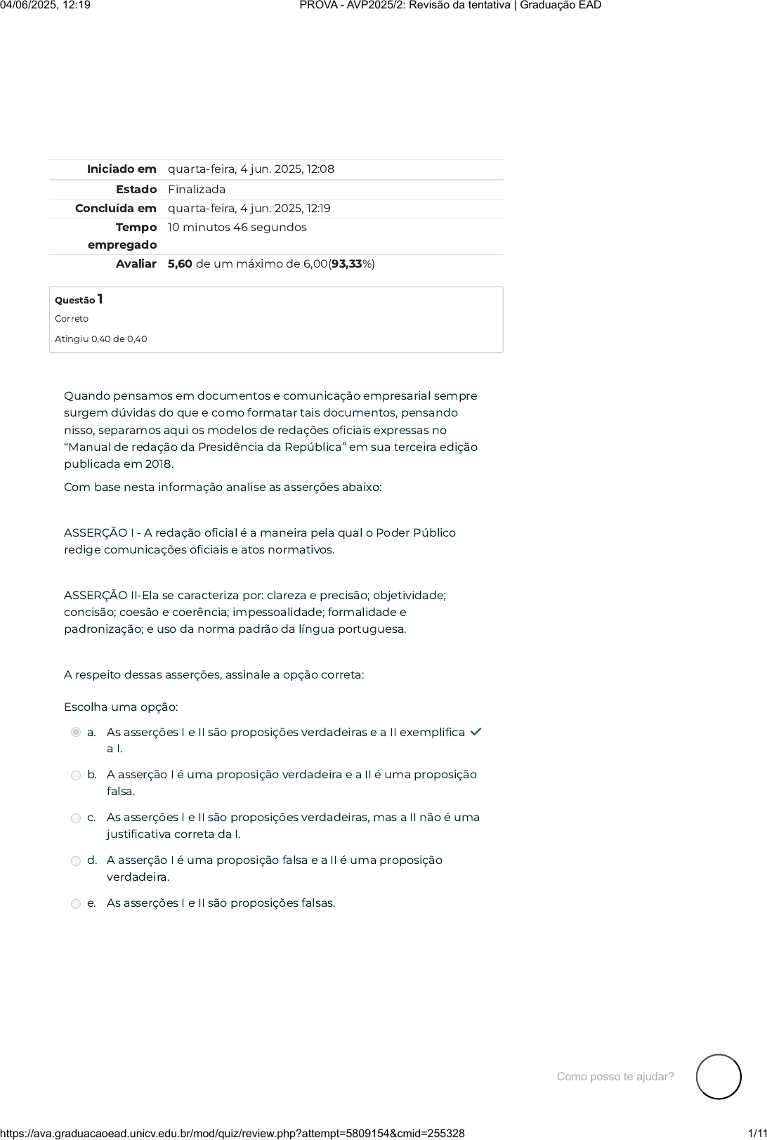 Iniciado em quarta-feira, 4 jun. 2025, 12:08 Estado Finalizada Concluída em quarta-feira, 4 jun. 2025, 12:19 Tempo empregado 10 minutos 46 segundos Avaliar 5,60 de um máximo de 6,00(93,33%) Questão 1 Correto Atingiu 0,40 de 0,40 Quando pensamos em documentos e comunicação empresarial sempre surgem dúvidas do que e como formatar tais documentos, pensando nisso, separamos aqui os modelos de redações oficiais expressas no “Manual de redação da Presidência da República” em sua terceira edição publicada em 2018. Com base nesta informação analise as asserções abaixo: ASSERÇÃO I - A redação oficial é a maneira pela qual o Poder Público redige comunicações oficiais e atos normativos. ASSERÇÃO II-Ela se caracteriza por: clareza e precisão; objetividade; concisão; coesão e coerência; impessoalidade; formalidade e padronização; e uso da norma padrão da língua portuguesa. A respeito dessas asserções, assinale a opção correta: Escolha uma opção: a. As asserções I e II são proposições verdadeiras e a II exemplifica a I. ✓ b. A asserção I é uma proposição verdadeira e a II é uma proposição falsa. c. As asserções I e II são proposições verdadeiras, mas a II não é uma justificativa correta da I. d. A asserção I é uma proposição falsa e a II é uma proposição verdadeira. e. As asserções I e II são proposições falsas. Como posso te ajudar? 04/06/2025, 12:19 PROVA - AVP2025/2: Revisão da tentativa | Graduação EAD https://ava.graduacaoead.unicv.edu.br/mod/quiz/review.php?attempt=5809154&cmid=255328 1/11 Questão 2 Correto Atingiu 0,40 de 0,40 Durante a nossa trilha de aprendizagem pudemos ver vários tipos e gêneros de textos que são usados no dia a dia, seja no âmbito empresarial ou não. Entrevista, Fábula, Lenda, Ficção científica e Palestra são exemplos de: I) Tipos textuais II) Gêneros discursivos III) Gêneros textuais IV) Tipos de documentos V) Nenhuma das alternativas É correto o que se afirma em: Escolha uma opção: a. Item I e II b. Item V c. Item III ✓ d. Item IV e. Item II e III Como posso te ajudar? 04/06/2025, 12:19 PROVA - AVP2025/2: Revisão da tentativa | Graduação EAD https://ava.graduacaoead.unicv.edu.br/mod/quiz/review.php?attempt=5809154&cmid=255328 2/11 Questão 3 Correto Atingiu 0,40 de 0,40 As funções da linguagem estão diretamente ligadas aos elementos essenciais do processo de comunicação. Uma delas tenta explicar o código através dele mesmo, o melhor exemplo é o dicionário, são palavras falando de palavras. Estamos nos referindo à função: 1) Função Metalinguística 2) Função Conativa ou Apelativa 3) Função Poética 4) Função Referencial ou Denotativa 5) Função Fática Está correto o que se afirma em: Escolha uma opção: a. Item 5 b. Item 2 c. Item 4 d. Item 1 ✓ e. Item 3 Como posso te ajudar? 04/06/2025, 12:19 PROVA - AVP2025/2: Revisão da tentativa | Graduação EAD https://ava.graduacaoead.unicv.edu.br/mod/quiz/review.php?attempt=5809154&cmid=255328 3/11 Questão 4 Correto Atingiu 0,40 de 0,40 Sobre o item “Recomendações”, veja as afirmativas a seguir: I-Sempre que necessário, deve-se utilizar recurso de confirmação de leitura. Caso não esteja disponível, deve constar da mensagem pedido de confirmação de recebimento; II- Apesar da imensa lista de fontes disponíveis nos computadores, mantêm-se a recomendação de tipo de fonte, tamanho e cor dos documentos oficiais: Calibri ou Carlito, tamanho 12, cor preta; III - Fundo ou papéis de parede eletrônicos são recomendados para mensagens profissionais. Analise as afirmativas e marque a alternativa correta: Escolha uma opção: a. Todas as alternativas estão corretas. b. Todas estão incorretas. c. Apenas II e III estão corretas. d. Apenas I está correta e. Apenas I e II estão corretas. ✓ Como posso te ajudar? 04/06/2025, 12:19 PROVA - AVP2025/2: Revisão da tentativa | Graduação EAD https://ava.graduacaoead.unicv.edu.br/mod/quiz/review.php?attempt=5809154&cmid=255328 4/11 Questão 5 Correto Atingiu 0,40 de 0,40 Questão 6 Correto Atingiu 0,40 de 0,40 Podemos considerar sendo linguagem toda forma ou sistemas de significados que proporciona a comunicação de pensamentos ou sentimentos através de signos conhecidos e compreendidos socialmente, como: sons, imagens, palavras, gestos, cores, símbolos, etc. Percebemos os signos da linguagem por meio dos nossos cinco sentidos, por isso o uso de diversos tipos de linguagem para expressar e compreender o mundo. Basicamente podemos dividir a linguagem em dois tipos: Assinale a alternativa que corresponde aos 2 tipos de linguagem: Escolha uma opção: a. Linguagem escrita e linguagem falada. b. Linguagem visual e linguagem auditiva. c. Linguagem verbal e não verbal. ✓ d. Linguagem dos sinais e linguagem dos gestos. e. Língua Nacional e Língua Estrangeira. Corrado (1994, apud Pimenta, 2010) defende a ideia de que o administrador (executivo-chefe) pode agir como diretor de comunicação. Para tanto, é necessário, primeiramente, reconhecer a importância da comunicação no exercício da liderança. A partir do exposto acima e dos nossos estudos, leia as asserções e assinale a alternativa que corresponda a habilidades importantes que o Gestor/Administrador de empresas deve ter em relação a comunicação: I. Ter capacidade de agregar pessoas e conduzi-las na mesma direção. II. Ter lábia, convencer as pessoas sem se importar com o que pensa o colaborador. III. Ampliar o seu entendimento do processo de comunicação. IV. Conhecer os processos e ferramentas de comunicação. É correto o que se afirma em: Escolha uma opção: a. II e III, apenas. b. I, III e IV, apenas. ✓ c. I, II, III e IV. d. II, III e IV, apenas. e. I e II, apenas. Como posso te ajudar? 04/06/2025, 12:19 PROVA - AVP2025/2: Revisão da tentativa | Graduação EAD https://ava.graduacaoead.unicv.edu.br/mod/quiz/review.php?attempt=5809154&cmid=255328 5/11 Questão 7 Corre