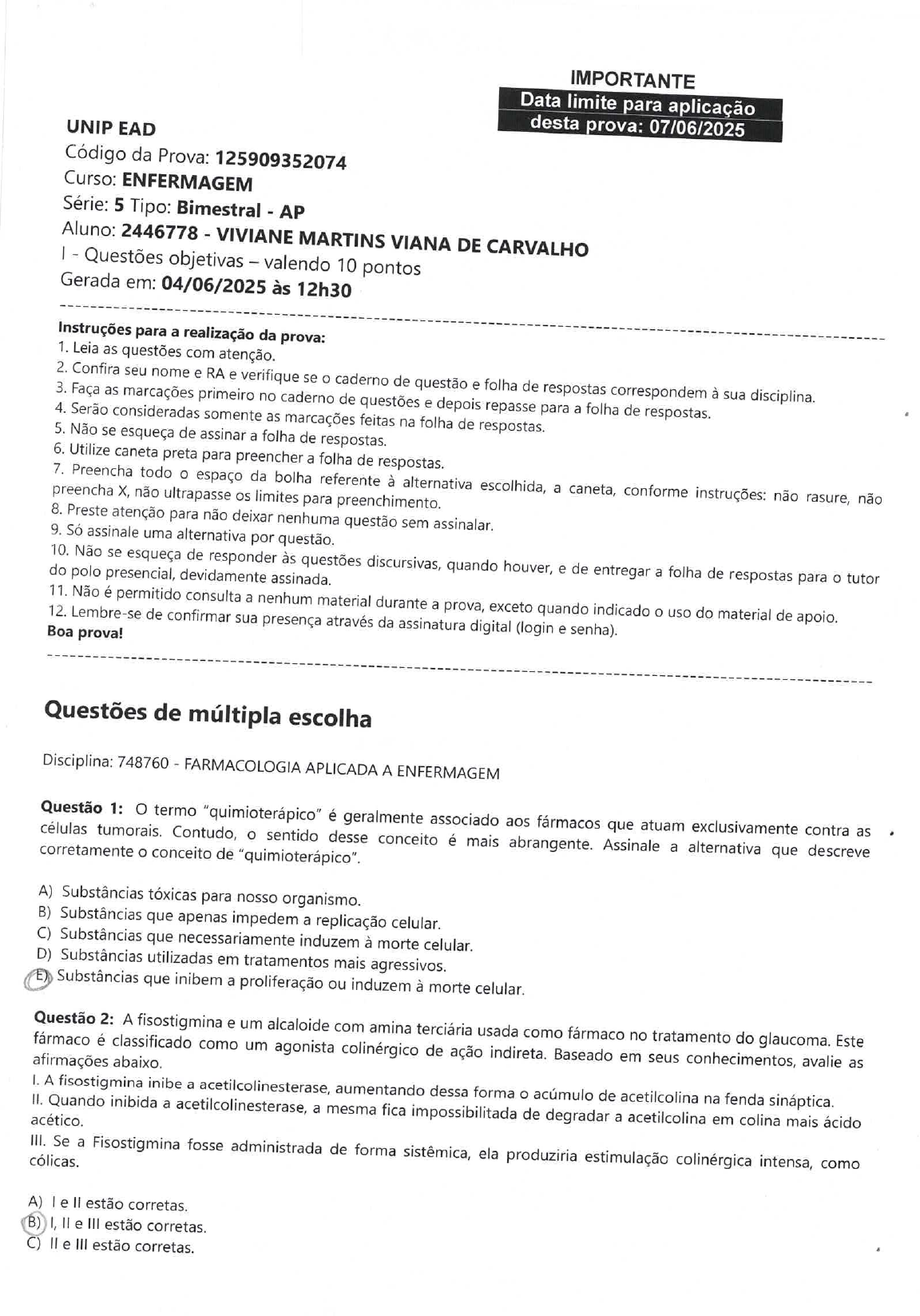 IMPORTANTE Data limite para aplicação UNIP EAD desta prova: 07/06/2025 Código da Prova: 125909352074 Curso: ENFERMAGEM Série: 5 Tipo: Bimestral AP Aluno: 2446778 VIVIANE MARTINS VIANA DE CARVALHO Questões objetivas valendo 10 pontos Gerada em: 04/06/2025 às 12h30 Instruções para a realização da prova: 1. Leia as questões com atenção. 3. 2. Faça Confira as seu nome e RA e verifique se o caderno de questão e folha de respostas à sua disciplina. 5. 4. consideradas somente as marcações feitas na folha de respostas. Serão marcações primeiro no caderno de questões e depois repasse para a folha correspondem de respostas. Não se esqueça de assinar a folha de respostas. 6. Utilize caneta preta para preencher a folha de respostas. preencha 7. Preencha X, não todo o espaço da bolha referente à alternativa escolhida, a caneta, conforme instruções: não rasure, não ultrapasse os limites para 8. Preste atenção para não deixar nenhuma questão sem 9. Só assinale uma alternativa por questão. do 10. Não se esqueça devidamente de responder assinada. às questões discursivas, quando houver, e de entregar a folha de respostas para o tutor polo presencial, 12. 11. Lembre-se Não é permitido de consulta a nenhum material durante a prova, exceto quando indicado o uso do material de Boa prova! confirmar sua presença através da assinatura digital (login e senha). Questões de múltipla escolha Disciplina: 748760 FARMACOLOGIA APLICADA A ENFERMAGEM células Questão 1: termo "quimioterápico" é geralmente associado aos fármacos que atuam exclusivamente corretamente conceito de "quimioterápico". tumorais. Contudo, o sentido desse conceito é mais abrangente. Assinale a alternativa que contra descreve as A) Substâncias tóxicas para nosso organismo. B) Substâncias que apenas impedem a replicação celular. C) Substâncias que necessariamente induzem à morte D) Substâncias utilizadas em tratamentos mais Substâncias que inibem a proliferação ou induzem à morte celular. fármaco Questão 2: A fisostigmina e um alcaloide com amina terciária usada como fármaco no tratamento do afirmações abaixo. é classificado como um agonista colinérgico de ação indireta. Baseado em seus conhecimentos, glaucoma. avalie Este as I. A fisostigmina inibe a acetilcolinesterase, aumentando dessa forma acúmulo de acetilcolina fenda acético. II. Quando inibida a acetilcolinesterase, a mesma fica impossibilitada de degradar a acetilcolina na em colina sináptica. mais ácido cólicas. III. Se a Fisostigmina fosse administrada de forma sistêmica, ela produziria estimulação colinérgica intensa, como A) e estão corretas. B) I, e III estão corretas. C) e III estão corretas.D) e III estão corretas. E) Apenas está dos Questão receptores 3: Qual H1, dos dos receptores seguintes efeitos colinérgicos colaterais muscarínicos causados ou pelos dos receptores antidepressivos alfa1-adrenérgicos? não é consequência do bloqueio A) hipotensão ortostática. B) sedação. C) visão D) retenção urinária. E) aumento do tempo de condução Questão é: 4: fármaco de escolha para o tratamento da salivação escassa, consequência de irradiação na cabeça e pescoço A) B) Escopolamina. C) D) Acetilcolina. E) neoplasias. Questão 5: Podemos Compreender verificar a biologia tumoral é uma das principais formas de delinear os tratamentos modernos para de forma inespecífica. que alguns fármacos atuam de forma específica no ciclo enquanto outros atuam Sendo assim, assinale a alternativa que contém a afirmação correta acerca dos agentes tem A) Apesar especificidade de sobre diversos determinada mecanismos fase do ciclo de ação distintos, a ação dos compostos antibióticos antitumorais não específicos para a fase M do ciclo B) Compostos antimetabólitos inibem a síntese de moléculas essenciais para a proliferação da célula, sendo mais migração dos cromossomos, sendo específica para a fase S do ciclo C) Os alcaloides da vinca inibem a polimerização da tubulina, impedindo a formação dos microtúbulos para a do D) ciclo Agentes alquilantes se ligam ao DNA e promovem a alquilação de sua agindo especificamente na fase S E) Fármacos anticorpos monoclonais são altamente específicos, atuando somente na fase S do ciclo celular. Questão 6: Esquizofrenia é uma doença psicótica causada por múltiplos sintomas que comprometem: está percepção, incorreta? emoção e cognição. Em relação à doença e seu tratamento farmacológico, qual das alternativas raciocínio, abaixo A) Os sintomas positivos da esquizofrenia incluem: delírios e alucinações, fala e comportamento pensamento e da produção da fala. afeto incongruente enquanto os sintomas negativos incluem isolamento social, redução da produção desorganizados, e fluência do utilizados B) Quanto à etiologia da esquizofrenia, a teoria é a mais aceita, tanto que os fármacos clássicos no tratamento da doença são agonistas D) C) A potência clínica correlaciona-se com a afinidade pelos receptores dopaminérgicos do subtipo representam os atípicos. Dentre os antipsicóticos podemos citar a clorpromazina e enquanto que risperidona e olanzapina E) ginecomastia, boca seca e Dentre os efeitos adversos do uso de antipsicóticos podemos citar: aumento do apetite, galactorréia, Questão 7: Os efeitos da histamina sobre os receptores H1 pode produzir: A) Broncodilatação, vasodilatação e prurido. B) Estimulação da secreção gástrica ácida, broncoconstrição e prurido. Aumento da produção nasal e brônquica de muco, broncoconstrição, prurido e D) Estimulação da secreção gástrica ácida, aumento da produção nasal e brônquica de muco, broncoconstrição.E) Prurido, broncodilatação e Questão doença 8: mal de Alzheimer é a causa mais comum de demência, contribuindo relação uma ao mal senil de Alzheimer ou pré-senil e seu e as tratamento mulheres farmacológico: são duas vezes mais afetad