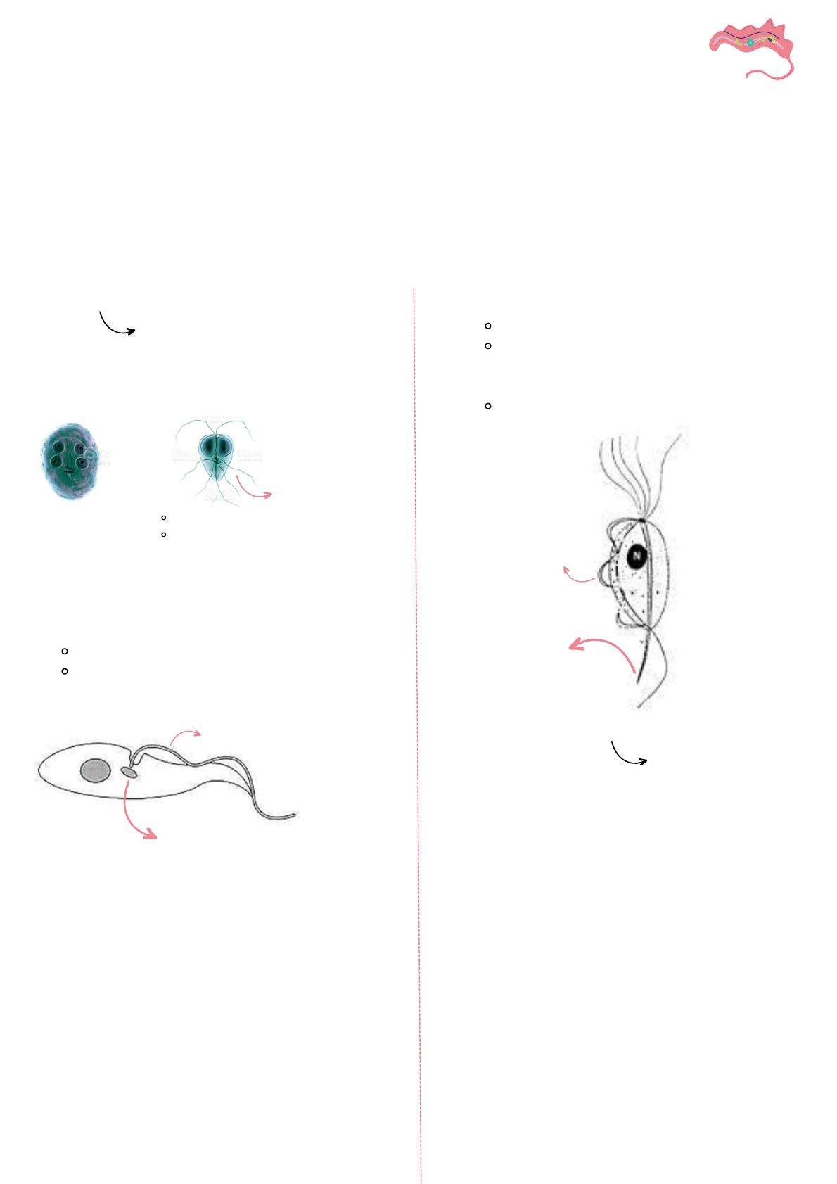 Protozoários Reino Protista (engloba protozoários, algas unicelulares, seres heterotróficos, unicelulares e inclui organismos eucariontes) SR Protozoa (unicelulares, eucariontes e heterotróficos) Filo Sarcomastigophora SF Mastigophora (MASTYX = chicote = flagelos, se locomove por flagelos) Classe zoomastigophora (zoo = heterotrófico + MASTYX = chicote = flagelos) Ordem diplomonadida: di= 2 núcleos no trofozoíto da giárdia GIARDIA DUODENALIS CISTO Forma de sobrevivência no meio externo TROFOZOÍTO FLAGELOS 2 núcleos Apresenta simetria bilateral (essas são características de diplomonadida) 2 formas do ciclo: Ordem kinetoplastida: Flagelados Não possuem cisto Os dois representantes são: Trypanosoma spp. e Leishmania spp. CINETOPLASTO (é uma mitocôndria grande que gera energia para mover o flagelo) OBS: APENAS LEISHMANIA E TRYPANOSOMA TEM MEMBRANA ONDULANTE Ordem trichomonadida: Só tem trofozoíto Possui membrana ondulante (é o flagelo aderido a membrana plasmática que quando se move, gera a membrana ondulante) Apenas um núcleo Trichomonas spp. A depender da quantidade de flagelos, o nome muda. MEMBRANA ONDULANTE AXÓSTILO (é uma estrutura rígida que sustenta a morfologia do corpo do protozoário, para que ele não achate) GIÁRDIAGIÁRDIA Reino Protista (engloba protozoários, algas unicelulares, seres heterotróficos, unicelulares e inclui organismos eucariontes) SR Protozoa (unicelulares, eucariontes e heterotróficos) Filo Sarcomastigophora SF Mastigophora (MASTYX = chicote = flagelos, se locomove por flagelos) Ordem diplomonadida ( 2 núcleos e simetria bilateral) Não se usa a classificação de hospedeiro intermediário e definitivo, pois o seu ciclo vai se desenvolver em um único hospedeiro. Obs: A especificidade parasitária é ampla, então existe a possibilidade de desenvolver o ciclo em vários hospedeiros diferentes, só que o ciclo completo (trofozoíto e depois produção de cisto) em um de cada vez. Ciclo monoxeno: ciclo todo usando apenas um hospedeiro. Os hospedeiros são os mamíferos em geral (inclui humanos) HOSPEDEIRO:HOSPEDEIRO: VETOR:VETOR: Não obrigatoriamente tem vetor. Normalmente não tem, mas pode acontecer. PARASITO ZOONÓTICOPARASITO ZOONÓTICO Sim. Então a giardíase é uma doença zoonótica, é uma zoonose (de origem animal que pode ser transmitida de animal para animal ou de animal para ser humano e vice versa). CARACTERÍSTICAS:CARACTERÍSTICAS: Parasito eurixeno (é amplo, tem uma quantidade de hospedeiros/espécies possíveis muito grande, é um leque de espécies diferentes e de hospedeiros. Capacidade de adaptação a várias espécies diferentes) CICLO:CICLO: 1. Ingestão de cistos maduros (da pra ver 4 núcleos. O cisto está maduro porque dentro dele vai ter o desenvolvimento de 2 trofozoítos) por um mamífero (em água ou alimentos). OBS: Tem parede dupla (lipoproteica), quando passa pelo estômago as enzimas digestivas, ác. clorídrico vão atuar na parede proteica, digerindo- a. Mas a parte lipídica, não. Então, continuam até chegar no intestino delgado, encontram as enzimas digestivas de lipídeos, essa parte lipídica é digerida, liberando os 2 trofozoítos. 2. O trofozoíto se fixa na parede intestinal, começa a se alimentar, gerando energia e se reproduzir por bipartição (1 vai gerar 2 e assim sucessivamente) gerando um atapetamento (reveste as vilosidades da parede intestinal do intestino delgado, não tendo absorção de água e de nutrientes, pois recobre tudo) 3. Chega um momento que os trofozoítos iniciais já estão mais velhos ou não há mais espaço para fixação (sem nutrição), sendo assim, eles se afastam e vão em direção a luz intestinal, quando estão na luz intestinal começam a aderir ao redor deles partículas do alimento que o hospedeiro ingeriu, partículas lipídicas, proteicas, vai se revestindo e forma camada dupla. (por enquanto só tem 2 núcleos) 4. Como ele está na luz intestinal, e o intestino tem peristaltismo, vai se movimentando e empurrando ele, saindo para o ambiente juntamente com as fezes de forma imatura (o cisto quando chega no ambiente é um trofozoíto protegido/revestido) 5. Quando chega no ambiente, ele se biparte uma vez, ao longo dos dias, o cisto apresentará 4 núcleos. (Quando se observa um material fecal recém eliminado, observa-se cisto imaturo, mas se ficar um tempo no ambiente ele se biparte e para por aí. Se nenhum hospedeiro ingerir esse cisto, ele pode durar muito tempo, caso o ambiente esteja propício, úmido. Mas se tiver em um local seco e com sol, ele resseca e pode morrer.) OBS: o cisto tem 4 núcleos, cada dupla de núcleos gera um trofozoíto. GIÁRDIAGIÁRDIA OBS 1: Trofozoítos sempre são encontrados no intestino delgado. OBS 2: Caso o cisto imaturo seja ingerido, nada vai acontecer, ele vai ser digerido, pois esse trofozoíto já está desgastado, já não em mais tanta energia. OBS 3: Nem sempre a giárdia vai para o ambiente em forma de cisto, pois as vezes não há tempo hábil para se fixar (diarreia intensa, imunidade baixa do hospedeiro, proliferação muito grande), o peristaltismo começa a ser muito intenso e não tem absorção de água e nutrientes (pois está tudo revestido), ou seja, acontece a diarreia. No início da diarreia se observa os 2 (cisto e trofozoíto), se for dias de diarreia se observa trofozoítos. Em fezes formadas, se observa o cisto. Em animais que tem dias de diarreia e para por um tempo, melhora a imunidade e dá tempo de encistar, encontrando cisto. atapetamento FUNÇÃO:FUNÇÃO: TROFOZOÍTO: Alimentação e reprodução (assexuada - bipartição) CISTO: Proteger para não ressecar no ambiente e a disseminação. FORMAS DE INFECÇÃO:FORMAS DE INFECÇÃO: Ingestão de cistos maduros por água e alimentos contaminados. VETOR MECÂNICO:VETOR MECÂNICO: Só transporta o cisto de um local para o outro, mas a infecção se dá pela ingestão de cisto maduro com água e alimento. COMO ACONTECE?COMO ACONTECE?