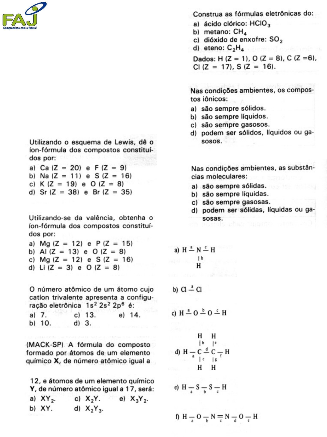Docente: Ma Amanda de O. Lista de exercícios Introdução à Química Geral. As respostas deverão ser escritas no seu caderno, não há necessidade da cópia do enunciado. 1- Escreva as estruturas de Lewis para: a) O2 ; b) H2O ; c) CO2 . 2- a) CH4 b) PCI3 c) SO2 d) NO+ e) CO3 3- Desenhe as estruturas de Lewis para o NO e NO2 4- Escreva as estruturas de Lewis para: a) NF3 b) NO2 c) NO+ d) CO2 5- 6- 7- 8- 9- 10- 11- 12- Identifique nas letras correspondentes as ligações se elas são polares ou apolares. 13- 14- 15- No Gelo seco, as moléculas do dióxido de carbono (CO2), estão unidas por: a) Pontes de hidrogênio b) Forças dipolo induzido c) Forças dipolo-dipolo d) Ligações iônicas e) Ligações covalentes 16- 17- Apresente as fórmulas eletrônicas e estruturais do trióxido de enxofre, do hidróxido de sódio e do perclorato de cálcio. 18- Na ligação entre átomos dos elementos químicos 15P31 e Ca, que tem 20 prótons, forma-se o composto de fórmula: a) CaP b) Ca3P c) CaP3 d) Ca2P3 e)Ca3P2 19- Dados os compostos: I - Cloreto de sódio II - Brometo de hidrogênio III - Gás carbônico IV - Metanol V - Fe2O3 apresentam ligações covalentes os compostos: A) I e V B) III e V C) II, IV e V D) II, III e IV E) II, III, IV e V 20- image5.png image6.png image7.png image8.png image9.png image10.png image11.png image12.png image13.png image14.png image15.png image16.png image17.png image18.png image19.png image1.jpeg image2.png image3.png image4.png