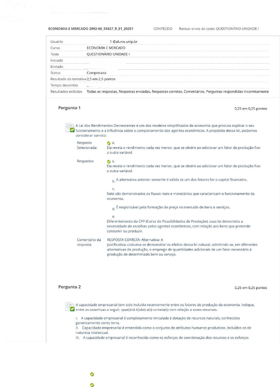 06/04/2025, 11:33 Revisar envio do teste: QUESTIONÁRIO UNIDADE I – ... https://ava.ead.unip.br/webapps/assessment/review/review.jsp?attempt_id=_112172790_1&course_id=_384003_1&content_id=_4312234_1&retu… 1/6 relacionados com as diferentes formas de empreendedorismo na sociedade. IV. Não se pode falar em capacidade empresarial sem existir uma dotação média de recursos tecnológicos à disposição da sociedade. Está(ão) correta(s) apenas: Resposta Selecionada: a. III. Respostas: a. III. 06/04/2025, 11:33 Revisar envio do teste: QUESTIONÁRIO UNIDADE I – ... https://ava.ead.unip.br/webapps/assessment/review/review.jsp?attempt_id=_112172790_1&course_id=_384003_1&content_id=_4312234_1&retu… 2/6 b. III e IV. c. IV. d. I e III. e. II e IV. Comentário da RESPOSTA CORRETA: Alternativa: A resposta: Justificativa: essa categoria foi adicionada recentemente às três anteriores, clássicas (terra, capital e trabalho) e engloba os processos de coordenação e supervisão dos variados recursos de produção à disposição da sociedade para o atendimento às suas necessidades, individuais e coletivas. Pergunta 3 0,25 em 0,25 pontos Acerca dos sistemas calcados no livre funcionamento dos mercados, pode-se considerar como correta(s) a(s) assertiva(s): I. São, em todas as circunstâncias, fortemente direcionados ao atendimento às questões relativas ao controle ambiental da sociedade. II. O mecanismo de preços constitui a força predominante e direciona o comportamento para a definição das escolhas de produção e consumo dos diferentes agentes econômicos. III. A propriedade dos seus recursos de produção é, predominantemente, de controle dos próprios indivíduos ou da sociedade. IV. Não contam com qualquer participação do Estado no controle das atividades econômicas Está(ão) correta(s) apenas: Resposta Selecionada: b. II e III. Respostas: Comentário da resposta: a. I e IV. b. II e III. c. I e III. d. IV. e. III e IV. Alternativa: B Justificativa: esses sistemas apresentam como principais características: • Propriedade privada de fatores de produção e de bens e serviços. • Liberdade de iniciativa dos agentes econômicos. • Formação de preços fixada pela própria atuação das forças e agentes de mercado. • Pequena interferência do Estado nos negócios. A justificativa para a atuação do Governo é dada pelas chamadas externalidades, que fazem com que sejam diferentes os custos sociais dos privados nas alternativas de produção e de consumo de bens e serviços. Pergunta 4 0,25 em 0,25 pontos As empresas, tal como as famílias, são agentes que atuam na economia. No tocante a elas, é possível considerar: I. São, na maioria das vezes, consumidoras de bens e serviços oferecidos nos diferentes mercados. II. Atuam como demandantes de fatores necessários à produção de bens e serviços na economia. III. Representam a oferta no mercado de bens e serviços e a demanda de mão de obra. IV. Somente atuam nos mercados de fatores de produção. Estão corretas apenas: Resposta Selecionada: Respostas: d. II e III. 06/04/2025, 11:33 Revisar envio do teste: QUESTIONÁRIO UNIDADE I – ... https://ava.ead.unip.br/webapps/assessment/review/review.jsp?attempt_id=_112172790_1&course_id=_384003_1&content_id=_4312234_1&retu… 3/6 a. I e II. b. I e III. c. II e IV. d. II e III. e. III e IV. Comentário da RESPOSTA CORRETA: Alternativa: D resposta: Justificativa: no geral, as empresas são responsáveis pela geração/produção de bens e serviços, em qualquer segmento de atividade (indústria, comércio etc.), enquanto as famílias englobam os agentes consumidores, isto é, são elas que detêm a posse dos fatores de produção, necessários às empresas para a criação de bens e serviços. Pergunta 5 0,25 em 0,25 pontos As externalidades justificam a intervenção mais direta do Estado na economia e, a respeito delas, pode ser dito: Resposta Selecionada: Respostas: Comentário da resposta: c. Tanto as externalidades negativas quanto as positivas alteram a correta distribuição de custos e benefícios entre os agentes sociais. a. Devemos nos preocupar apenas com as negativas, que dificultam a comparação de custos e benefícios das diversas atividades econômicas. b. As externalidades positivas são representadas, exclusivamente, pela absoluta necessidade de produção de bens públicos. c. Tanto as externalidades negativas quanto as positivas alteram a correta distribuição de custos e benefícios entre os agentes sociais. d. Apenas de gerar grandes dificuldades para a sociedade, a inflação não se enquadra como uma externalidade para a atuação dos agentes econômicos. e. O crescimento econômico pode trazer somente externalidades positivas, quaisquer que sejam os grupos com ele envolvidos. RESPOSTA CORRETA: Resposta: C Justificativa: uma externalidade ocorre quando um agente econômico (produtor ou consumidor) influencia os resultados das atividades de outro(s), o que não é precificado naturalmente pelas forças de livre atuação nos diferentes mercados. Há externalidades negativas (como a poluição) e positivas (abertura de um colégio na rua em que moro ou tenho um estabelecimento comercial). As externalidades podem ser corrigidas por meio da negociação entre os próprios agentes privados ou, se isso não for possível, por decisões coletivas, via mecanismo de eleição e/ou de estabelecimento de padrões, cobrança de impostos, multas etc. Pergunta 6 0,25 em 0,25 pontos 06/04/2025, 11:33 Revisar envio do teste: QUESTIONÁRIO UNIDADE I – ... https://ava.ead.unip.br/webapps/assessment/review/review.jsp?attempt_id=_112172790_1&course_id=_384003_1&content_id=_4312234_1&retu… 4/6 Considerando o modelo representado pela Curva de Possibilidades de Produção (CPP), largamente adotado para a tentativa de explicar o fenômeno da escassez de recursos e a necessidade de escolhas de produção de bens e serviços pelos agentes econômicos, podemos consid