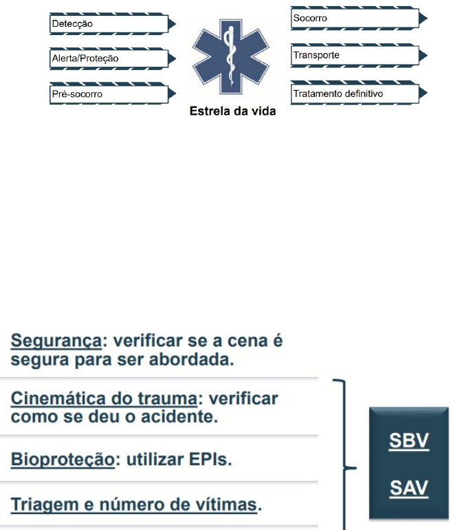Suporte básico de vida O Atendimento de Emergência O sistema de emergências médicas · Sistema de emergência médica pré-hospitalar guerra do Vietnã. · 1970 · Conjunto de ações extra-hospitalares, hospitalares e intra-hospitalares que possibilitam uma ação multidisciplinar rápida e eficaz em situações de emergência · · Portaria n. 814, de 24 de julho de 1999: regulariza as atividades do APH em todo o Brasil · Urgência: significa uma situação imprevista, com ou sem risco potencial de vida, mas em que a vítima necessita de cuidados médicos imediatamente. · Emergência: implica uma situação de risco iminente de vida ou sofrimento intenso, exigindo, portanto, tratamento médico imediato O Atendimento Pré-Hospitalar – APH SUPORTE BASICO DE VIDA =SBV pode ser realizado por leigos SUPORTE AVANÇADO DE VIDA = SAV existe risco de morte A Corrente de Sobrevida · 1 – Reconhecimento imediato da PCR e acionamento do serviço e urgência. · 2 – Ressuscitação cardiopulmonar (RCP), com ênfase nas compressões torácicas. · 3 – Rápida desfibrilação. · 4 – Suporte avançado de vida. · 5 – Cuidados pós-PCR eficiente. Avaliação primária · Avaliar a responsividade/nível de consciência, através de um contato verbal ou tátil · Se a vítima não responder imediatamente, deverão ser observados os movimentos respiratórios por 10 segundos. · Se a vítima não estiver respirando ou estiver com dificuldade respiratória, o Serviço de Emergência · · Avaliar nível de consciência. · Avaliar nível de consciência. · Observar respiração · OBSERVAR: SEGURANÇA DO LOCAL NECESSIDADE DE REMOÇÃO, QUANTIDADE DE VÍTIMAS, INFORMACÇÕES,M GRAVIDADE, MECANISMO DA LESAO. Avaliação secundaria · Rapida e sistematica · Compreende: respiração, presença de hemorraria, tamanho de pupila, temperatura, ferimentos e areas dolorosas Realizando exames · Avaliar nivel de consciencia · Se a vitma estiver inconsciente manter vias aereas abertas · SE ATENTE PARA: AUSENCIA DE CIRCULÇAO, RESPIRAÇÃO E HEMORRAGIA SINAIS DE ENVENENAMENTO RCP precoce · Inicio de manobras · Massagem cardiaca · Crucial · CAB DA VIDA = compressões toracicas SBV e SAV · image.png image3.png image2.png