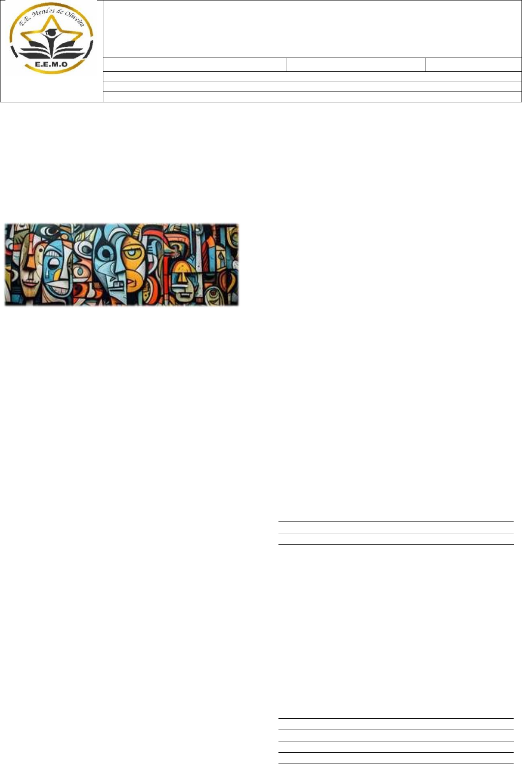 TRABALHO AVALIATIVO ARTE MODERNA Você sabia que a Arte Moderna revolucionou as expressões artísticas? Surgida na Europa no final do século XIX e até meados do século XX, esse movimento abrange diversas formas de arte, como arquitetura, escultura, literatura e pintura. Essas manifestações artísticas buscavam romper com tradições, experimentando novas técnicas e redefinindo o conceito de arte. Diversos movimentos surgiram na Europa durante o período modernista, como Expressionismo, Cubismo, Fauvismo, Abstracionismo, Futurismo, Dadaísmo, Concretismo. CARACTERÍSTICAS DA ARTE MODERNA A Arte Moderna rompeu com padrões tradicionais, refletindo o contexto histórico de seu surgimento, marcado por avanços tecnológicos, como a fotografia e o cinema, e eventos impactantes como as duas guerras mundiais. Essas transformações tornaram a arte mais contestadora, expressando incertezas da época. Suas principais características incluem: Humor e Irreverência: utilização de sátira para a crítica social; Estranhamento: criação de desconforto no espectador, desafiando expectativas; Urbanismo: temas relacionados à vida urbana e suas dinâmicas; Rejeição ao Academicismo: recusa às normas das academias de arte tradicionais; Liberdade de Expressão: exploração pessoal e inovadora de temas; Pontuação Relativa: flexibilidade na pontuação e estrutura gramatical na literatura; Linguagem Popular: uso de uma linguagem acessível e cotidiana; Figuras Deformadas: representações distorcidas e lógicas desafiadas; Abandono da Representação Realista: ênfase em representações abstratas e subjetivas; Arbitrariedade nas Cores: uso livre de cores para expressar emoções, sem a necessidade de realismo. ARTISTAS MODERNISTAS EUROPEUS Entre os artistas modernistas europeus, destacam-se Pablo Picasso que influenciou o Cubismo, Edvard Munch, conhecido por “O Grito”, expressando a angústia humana. Joan Miró adota uma abordagem lúdica e surrealista, e Marc Chagall mescla sonho e realidade. Juntos, esses artistas redefiniram a arte no século XX. ARTISTAS MODERNISTAS BRASILEIROS A Arte Moderna no Brasil se destacou com a Semana de Arte Moderna de 1922, um evento cultural importante que ocorreu no Teatro Municipal de São Paulo e marcou a renovação da arte no país. Os principais expoentes desse movimento foram: Mário de Andrade, Oswald de Andrade, Tarsila do Amaral, Heitor Villa-Lobos, Anita Malfatti, Victor Brecheret, Vicente do Rego Monteiro, Ismael Nery, Zina Aita, Candido Portinari, Oscar Niemeyer, João Guimarães e Clarice Lispector. Esses artistas contribuíram significativamente para a formação da identidade moderna brasileira. PRINCIPAIS OBRAS DA ARTE MODERNA NO BRASIL Entre as principais criações da Arte Moderna no Brasil, destacam-se a escultura Cabeça de Cristo (1920), de Victor Brecheret; A sombra (1922), pintura de Zina Aita; Abaporu (1928), pintura de Tarsila do Amaral; Macunaíma (1928), romance de Mário de Andrade; Bachianas Brasileiras (1930 - 1945), composições de Heitor Villa-Lobos; Retirantes (1944), pintura de Candido Portinari e Grande sertão: veredas (1956), romance de João Guimarães Rosa. Essas obras não só marcaram a história da arte moderna, mas também contribuíram para moldar a identidade cultural do Brasil. Erica Sousa Tudo Sala de Aula ATIVIDADE DE FIXAÇÃO 1. Segundo o texto, o que é Arte Moderna? 2. Qual dos seguintes movimentos artísticos NÃO faz parte da Arte Moderna? a) Cubismo. b) Expressionismo. c) Romantismo. d) Futurismo. 3. Que característica da Arte Moderna se refere ao uso da sátira para criticar a sociedade? a) Urbanismo. b) Estranhamento. c) Humor e Irreverência. d) Rejeição ao Academicismo. 4. Como a Arte Moderna se desenvolveu no Brasil? ESCOLA ESTADUAL MENDES DE OLIVEIRA 1º E 2º GRAUS – 046/ DECRETO LEI 1723 DE 29/04/66 /DECRETO 31125 DE 20/04/90 PARECER CEE Nº95 DE 19/02/94 / PORTARIA Nº307 DE 11/03/94 RUA ANTÔNIO CAPUCHINHO, 339 – CENTRO – FONE 38 998760216 CEP 39540000-SÃO JOÃO DO PARAÍSO – MG Componente Curricular: Artes Turma: Data: __/__/2024 Professor(a): Maria Cláudia Aluno(a): 5. Analise a imagem a seguir e responda: Fonte: https://pt.wikipedia.org/ Na sua opinião, qual mensagem essa obra de arte transmite? Quais sentimentos e sensações você percebe ao observá-la? 6. A Semana de Arte Moderna de 1922 marcou a renovação cultural no Brasil. Cite três artistas cujas produções ajudaram a formar a identidade moderna brasileira. 7. Quais dos seguintes movimentos surgiram na Europa no período modernista? a) Surrealismo, Impressionismo, Neoclassicismo. b) Expressionismo, Cubismo, Fauvismo. c) Romantismo, Barroco, Dadaísmo. d) Minimalismo, Cubismo, Concretismo. 8. Sobre a Arte Moderna, pinte apenas as informações verdadeiras. 9. Qual dos seguintes elementos foi abandonado pelos artistas modernistas em favor de representações mais abstratas e subjetivas? a) Figuras deformadas. b) Cenas sem lógica. c) Representação realista. d) Uso da linguagem popular e coloquial. 10. Relacione as características da Arte Moderna com sua respectiva definição. 1. Humor e Irreverência. 2. Estranhamento. 3. Rejeição ao Academicismo. 4. Informalidade. 5. Abandono da Representação Realista. ( ) Menos preocupação com regras rígidas de composição e técnica. ( ) Representações mais abstratas e subjetivas, em vez de realismo. ( ) Uso do humor e da sátira para criticar a sociedade e seus valores. ( ) Provoca surpresa ou perplexidade no espectador, desafiando suas expectativas. ( ) Recusa as normas e estilos das academias de arte tradicionais. 11. Observe a obra de Edvard Munch, intitulada Angústia, de 1894 para responder à questão. Quais características da Arte Moderna são mais evidentes nesta obra? Destaque pelo menos quatro delas. 12. Identifique a imagem que NÃO representa uma Arte Modernista. a) b) c) d) 13. Complete a obra de Arte Moderna com os elementos que faltam, conforme 