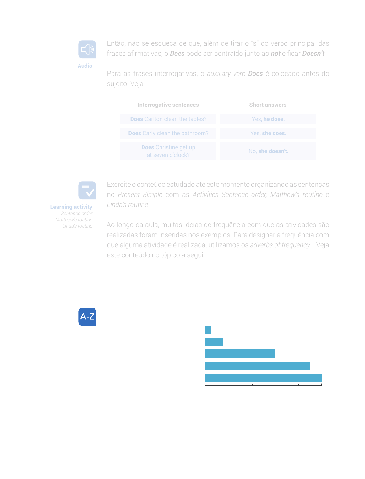 English1421ª ed. rev. e atual. Então, não se esqueça de que, além de tirar o “s” do verbo principal das frases afirmativas, o Does pode ser contraído junto ao not e ficar Doesn’t. Para as frases interrogativas, o auxiliary verb Does é colocado antes do sujeito. Veja: Interrogative sentences Short answers Does Carlton clean the tables? Yes, he does. Does Carly clean the bathroom? Yes, she does. Does Christine get up at seven o’clock? No, she doesn't. Exercite o conteúdo estudado até este momento organizando as sentenças no Present Simple com as Activities Sentence order, Matthew’s routine e Linda’s routine. Ao longo da aula, muitas ideias de frequência com que as atividades são realizadas foram inseridas nos exemplos. Para designar a frequência com que alguma atividade é realizada, utilizamos os adverbs of frequency. Veja este conteúdo no tópico a seguir. 3.4 How often do you…? - Adverbs of frequency Na imagem a seguir, veja os adverbs of frequency. sometimes, occasionally, periodically usually, generaly, normally 0 20 40 60 80 100% always, constantly, continually often, frequently, regularly hardly ever, rarely, seldom never, not ever Audio Learning activity Sentence order Matthew’s routine Linda’s routine Glossary Never/Not ever: nunca Hardly ever: dificilmente Rarely/Seldom: raramente Sometimes: às vezes Occasionally: ocasionalmente Periodically: periodicamente Often/Frequently: frequentemente Regularly: regularmente Usually/Generally: geralmente Normally: normalmente Always: Sempre Constantly: constantemente Continually: continuamente Lesson 06 - Cleaning day 143 e-Tec Brasil Observe as frases a seguir. Perceba que os adverbs of frequency ficam imediatamente após o sujeito e antes do verbo: Christine usually eats at restaurants. Subject Adverb Verb Rosa often sleeps late on weekends. Rosa always takes a shower in the morning. Christine sometimes takes a shower in the morning. Christine never cooks. Quando a frase é negativa, o advérbio localiza-se após o auxiliar (don't ou doesn't) e o verbo principal: My friends and I don't usually go to the movies. Carlton doesn't always cook. No entanto, quando usamos adverbs of frequency com o verb To be a posição muda, ou seja, eles são colocados depois de am, is e are. Veja mais exemplos a seguir: English Português Doing the dishes is sometimes fun. Lavar a louça, às vezes, é divertido. Cleaning the windows is normally tiring. Limpar as janelas normalmente é cansativo. Public toilets are frequently dirty. Banheiros públicos são frequentemente sujos. Além dos adverbs of frequency, podemos usar outras expressões que indicam a quantidade de vezes que algo é ou foi realizado. Observe: Audio English1441ª ed. rev. e atual. English Português once (a day, a year, a month...) uma vez (por dia, por ano, por mês...) twice duas vezes three times três vezes four times quatro vezes every day todos os dias s every month todos os meses every year todos os anos every morning todas as manhã every night todas as noites Perceba que essas expressões localizam-se no final da frase. Veja nos exemplos a seguir: Rosa brushes her teeth three times a day. Christine makes phone calls to her family once a week. Rosa presses snooze every morning. Agora veja como perguntar com que frequência uma ação é realizada. Para isso, utilizamos a expressão How often combinada com a estrutura das interrogative sentences do Present Simple. Observe os exemplos a seguir: How often do you go to college? I go to college every day! How often does your pet have a bath? My pet has a bath once a week. How often do you and your friends go to the movies? We often go to the movies. Com este conteúdo é possível que você consiga indicar com que frequência executa uma determinada ação. Audio Lesson 06 - Cleaning day 145 e-Tec Brasil Para fixar essas informações pratique os advérbios e expressões de frequência realizando as Activities Expressing frequencies e Daily routines. Existem alguns sons em língua inglesa que podem ser um pouco difíceis, pois diferem dos sons da nossa língua. Acompanhe no tópico a seguir os sons de sh e ch. Out loud 3.5 Initial sh vs. ch Em língua inglesa, palavras que iniciam com a grafia sh tem o som que se parece com o de “shhh”, quando pedimos silêncio. Veja os exemplos: shower chuveiro shoe sapato shelf prateleira shadow sombra shampoo xampu Palavras que iniciam com a grafia ch, têm o som como o que produzimos quando espirramos. Veja outros exemplos: chair cadeira cheese queijo China China chores tarefas children criança Entretanto, há algumas exceções para essa regra. Veja a seguir alguns exemplos: choir coral Chemistry Química A partir destas informações você poderá identificar algumas diferenças nas pronúncias das palavras com sh e ch. Não esqueça de repeti-las para aperfeiçoar a sua oralidade. Learning activity Expressing frequencies Daily routines Audio