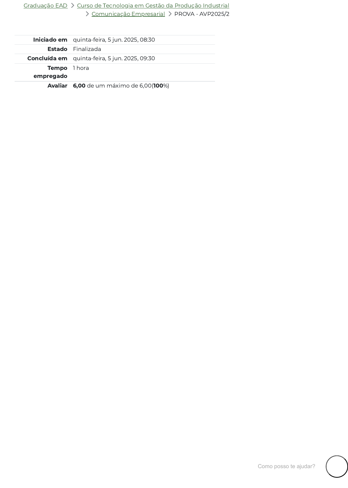 Graduação EAD 〉 Curso de Tecnologia em Gestão da Produção Industrial 〉 Comunicação Empresarial 〉 PROVA - AVP2025/2 Iniciado em quinta-feira, 5 jun. 2025, 08:30 Estado Finalizada Concluída em quinta-feira, 5 jun. 2025, 09:30 Tempo empregado 1 hora Avaliar 6,00 de um máximo de 6,00(100%) Como posso te ajudar? https://ava.graduacaoead.unicv.edu.br/course/index.php?categoryid=34 https://ava.graduacaoead.unicv.edu.br/course/index.php?categoryid=90 https://ava.graduacaoead.unicv.edu.br/course/view.php?id=2398#section-4 Questão 1 Correto Atingiu 0,40 de 0,40 Para facilitar o entendimento sobre o mundo, buscamos sempre modelos, padrões e/ou processos e com a comunicação não é diferente, para entendemos como se dá seu processo, foi desenvolvido um esquema que nos mostra os elementos da comunicação e como eles se relacionam. De acordo com Matos (2009), estes são os principais elementos da comunicação: Emissor, Meio, Mensagem, Código, Receptor, Ruído e Resposta. Dentre as alternativas abaixo, assinale aquela que corresponde a definição correta de RECEPTOR e RUÍDO: I. Aquele que, num dado momento, emite uma mensagem para um receptor ou destinatário. II. Tudo o que dificulta a comunicação, interfere na transmissão e perturba a recepção ou a compreensão da mensagem. III. Todo suporte material que veicula uma mensagem de um emissor a um receptor, através do espaço e do tempo. IV. Aquele a quem se dirige a mensagem, aquele que recebe a informação e a decodifica. São consideradas afirmativas corretas: Escolha uma opção: a. I e III estão apenas. b. I, II, III e IV c. I e IV apenas. d. I e II apenas. e. II e IV apenas. ✓ Como posso te ajudar? Questão 2 Correto Atingiu 0,40 de 0,40 Questão 3 Correto Atingiu 0,40 de 0,40 Segundo o MANUAL DE REDAÇÃO DA PRESIDÊNCIA DA REPÚBLICA, 2018: A utilização do e-mail para a comunicação tornou-se prática comum, não só em âmbito privado, mas também na administração pública. O termo e-mail pode ser empregado com três sentidos. Dependendo do contexto, pode significar gênero textual, endereço eletrônico ou sistema de transmissão de mensagem eletrônica. Como gênero textual, o e-mail pode ser considerado um: Complete com a alternativa correta. Escolha uma opção: a. documento não-oficial. b. Documento para socialização informal. c. Documento legítimo. d. documento oficial. ✓ e. Documento formal. Nas edições anteriores do Manual de redação da Presidência da República os documentos Ofício, Memorando e Aviso foram explicitados separadamente, mas com “o objetivo de uniformiza-los, deve-se adotar nomenclatura e diagramação únicas, que sigam o que chamamos de padrão ofício”. A distinção básica anterior entre os três era: Escolha uma opção: a. Aviso, identificação e memorando. b. Aviso, ofício e portfólio. c. Registro, ofício e memorando. d. Cabeçalho, ofício e memorando. e. Aviso, ofício e memorando. ✓ Como posso te ajudar? Questão 4 Correto Atingiu 0,40 de 0,40 “A comunicação é o espelho da cultura empresarial e reflete, necessariamente, os valores das organizações” (BUENO, 2009, p. 6). Sobre o contexto da comunicação nas empresas, assinale a alternativa que corresponde ao conceito correto de Comunicação Empresarial: a) Refere-se ao fluxo de informações relacionado ao dia a dia de uma empresa. Tem como objetivo principal coordenar, orientar e atualizar esse fluxo, para que as informações distribuídas por todos os setores e departamentos da organização. b) Aquela voltada a todos os colaboradores da empresa, da presidência ou diretoria aos auxiliares. O principal objetivo é realizar a integração entre todos os trabalhadores da empresa com foco em suas políticas, valores e objetivos. c) Utilizada para atingir os objetivos de marketing de uma organização, como divulgar produtos e estimular suas vendas ao seu público- alvo por meio dos veículos de comunicação. d) Conjunto integrado de ações, estratégias, planos, políticas e produtos planejados e desenvolvidos por uma organização para estabelecer a relação permanente e sistemática com todos os seus públicos de interesse. e) Capacidade e formas (formatos) que produzimos, possuímos e compreendemos para expressar nossos pensamentos, ideias, opiniões e sentimentos. Está correto o que se afirma em: Escolha uma opção: a. Opção E b. Opção D ✓ c. Opção B d. Opção C e. Opção A Como posso te ajudar? Questão 5 Correto Atingiu 0,40 de 0,40 Assinale Verdadeiro (V) ou Falso (F): A possibilidade de anexar documentos, planilhas e imagens de diversos formatos é uma das vantagens do e-mail. A mensagem que encaminha algum arquivo deve trazer informações mínimas sobre o conteúdo do anexo. Antes de enviar um anexo: ( ) É preciso avaliar se ele é realmente indispensável e se seria possível colocá-lo no corpo do correio eletrônico. ( ) Deve-se evitar o tamanho excessivo ( ) Deve-se reencaminhar anexos nas mensagens de resposta. ( ) Os arquivos anexados devem estar em formatos usuais e que apresentem poucos riscos de segurança. ( ) Quando se tratar de documento ainda em discussão, os arquivos devem ser enviados em formato que impossibilite a edição. Escolha uma opção: a. F-F-F-V-V b. F-V-F-V-F c. V-V-F-V-F ✓ d. V-V-V-V-V e. F-F-V-F-F Como posso te ajudar? Questão 6 Correto Atingiu 0,40 de 0,40 Analise o padrão abaixo: a) nome: nome da autoridade que as expede, grafado em letras maiúsculas, sem negrito. Não se usa linha acima do nome do signatário; b) cargo: cargo da autoridade que expede o documento, redigido apenas com as iniciais maiúsculas. As preposições que liguem as palavras do cargo devem ser grafadas em minúsculas; e c) alinhamento: a identificação do signatário deve ser centralizada na página. O modelo descrito acima corresponde a que item do Ofício padrão ? Escolha uma opção: a. Endereçamento. b. Identificação do Signatário. ✓ c. Assunto. d