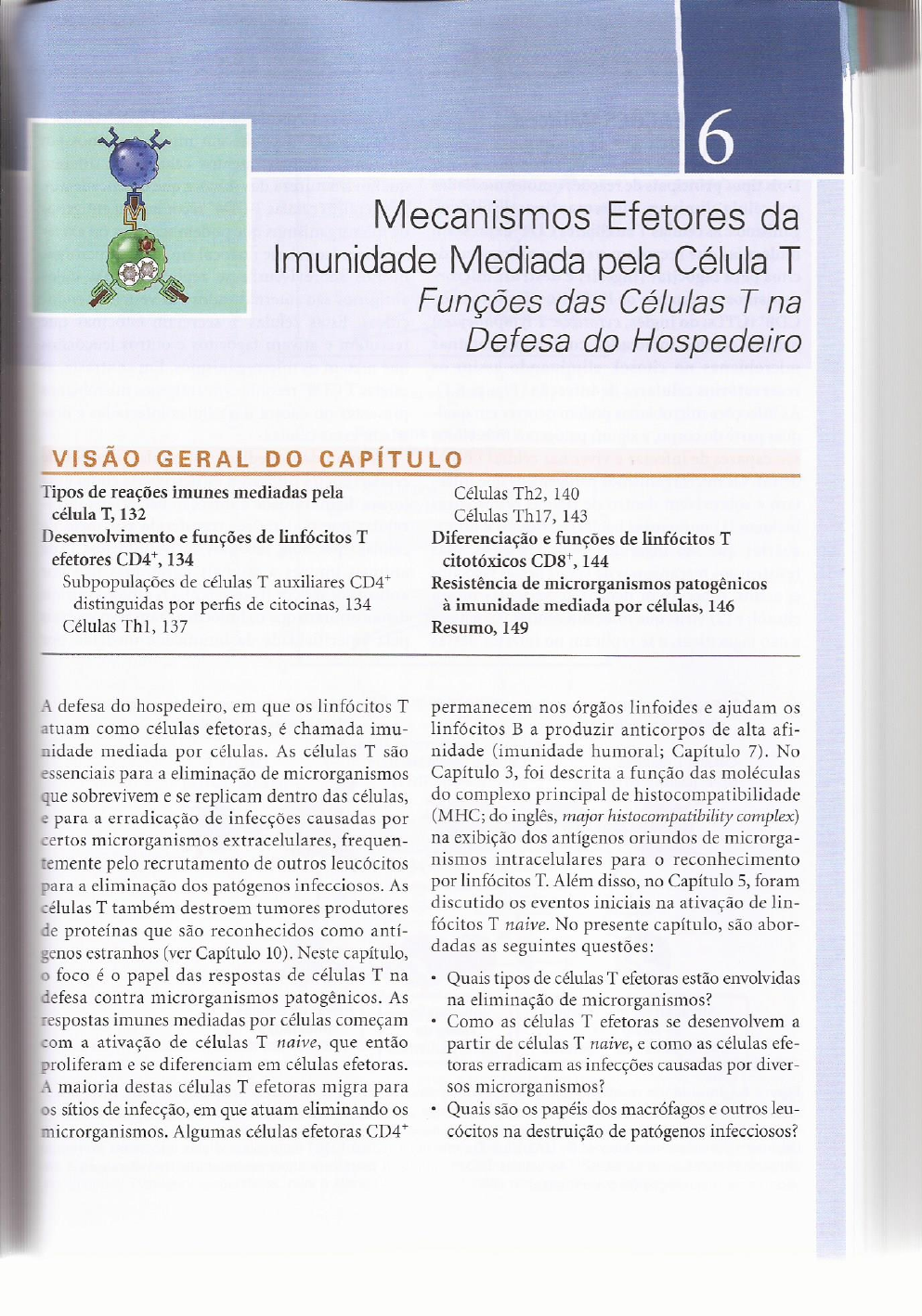 6 Mecanismos Efetores da Imunidade Mediada pela Célula T Funções das Células T na Defesa do Hospedeiro VISÃO GERAL DO CAPÍTULO Tipos de reações imunes mediadas pela Células Th2, 140 célula T, 132 Células Th17, 143 Desenvolvimento e funções de linfócitos T Diferenciação e funções de linfócitos T efetores CD4+, 134 citotóxicos 144 Subpopulações de células T auxiliares CD4+ Resistência de microrganismos patogênicos distinguidas por perfis de citocinas, 134 à imunidade mediada por células, 146 Células Thl, 137 Resumo, 149 A defesa do hospedeiro, em que os linfócitos T permanecem nos órgãos linfoides e ajudam os atuam como células efetoras, é chamada imu- linfócitos B a produzir anticorpos de alta afi- nidade mediada por células. As células T são nidade (imunidade humoral; Capítulo 7). No essenciais para a eliminação de microrganismos Capítulo 3, foi descrita a função das moléculas que sobrevivem e se replicam dentro das células, do complexo principal de histocompatibilidade e para a erradicação de infecções causadas por (MHC; do inglês, major histocompatibility complex) certos microrganismos extracelulares, frequen- na exibição dos antígenos oriundos de microrga- temente pelo recrutamento de outros leucócitos nismos intracelulares para o reconhecimento para a eliminação dos patógenos infecciosos. As por linfócitos T. Além disso, no Capítulo 5, foram células T também destroem tumores produtores discutido os eventos iniciais na ativação de lin- de proteínas que são reconhecidos como antí- fócitos T naive. No presente capítulo, são abor- genos estranhos (ver Capítulo 10). Neste capítulo, dadas as seguintes questões: foco é o papel das respostas de células T na Quais tipos de células T efetoras estão envolvidas defesa contra microrganismos patogênicos. As na eliminação de microrganismos? respostas imunes mediadas por células começam Como as células T efetoras se desenvolvem a com a ativação de células T naive, que então partir de células T naive, e como as células efe- proliferam e se diferenciam em células efetoras. toras erradicam as infecções causadas por diver- A maioria destas células T efetoras migra para SOS microrganismos? os sítios de infecção, em que atuam eliminando os Quais são os papéis dos macrófagos e outros leu- microrganismos. Algumas células efetoras CD4+ cócitos na destruição de patógenos infecciosos?132 Imunologia Básica TIPOS DE REAÇÕES IMUNES células (ver Capítulo 5; Figura 5.1). As células T MEDIADAS PELA CÉLULA CD4+ e CD8+ reconhecem microrganismos em diferentes compartimentos celulares e diferem Dois tipos principais de reações imunes mediadas quanto à natureza das reações que desencadeiam. por célula eliminam diferentes tipos de micror- Em geral, as células T CD4+ reconhecem antígenos ganismos: as células T auxiliares CD4+ expressam de microrganismos que podem ser intra ou extra- moléculas que recrutam e ativam outros leucó- celulares (com base no local em que os microrga- citos para fagocitar (ingerir) e destruir micror- nismos sobrevivem e se replicam), mas cujos ganismos, enquanto os linfócitos T citotóxicos antígenos são internalizados em vesículas endo- CD8+ (CTLs; do inglês, cytotoxic T lymphocytes) cíticas. Estas células T secretam citocinas que matam células infectadas contendo proteínas recrutam e ativam fagócitos e outros leucócitos microbianas no citosol, eliminando assim os que matam os microrganismos. Em contraste, as reservatórios celulares de infecção (Figura 6.1). células T CD8+ reconhecem antígenos microbianos As infecções microbianas podem ocorrer em qual- presentes no citosol das células infectadas e des- quer parte do corpo, e alguns patógenos infecciosos troem essas células. são capazes de infectar e viver nas células hospe- A imunidade mediada por células (imunidade deiras. Os microrganismos patogênicos que infec- celular) contra patógenos foi descoberta como uma tam e sobrevivem dentro de células hospedeiras forma de imunidade à infecção bacteriana intra- incluem (1) numerosas bactérias, fungos e proto- celular que poderia ser transferida por meio de zoários que são ingeridos pelos fagócitos, mas células (que, hoje, sabemos são os linfócitos T) de resistem aos mecanismos de killing desses fagócitos animais imunes a animais naive, mas não por e, assim, sobrevivem dentro de vesículas ou no anticorpos séricos (Figura 6.2). Os estudos iniciais citosol; e (2) vírus que infectam células fagocíticas demonstraram que os linfócitos eram responsáveis e não fagocíticas, e se replicam no interior dessas pela especificidade da imunidade mediada por A Fagócito com microrganismos ingeridos B Célula infectada, contendo antígenos dentro de vesículas microbianos no citoplasma Células T efetoras Células T efetoras Células T CD4+ (células Th1) CD4+ (células Th17) CD8+ (CTLs) Secreção de citocinas Ativação do macrófago Inflamação, Killing de células killing dos killing de infectadas microrganismos ingeridos microrganismos Figu rime expo Figura 6.1 Imunidade mediada por células. A. Células T efetoras CD4+ das subpopulações Th17 e Th1 reco- nhecem antígenos microbianos e secretam citocinas que recrutam leucócitos (inflamação) e ativam fagócitos para do Ci matar os microrganismos. As células efetoras da subpopulação Th2 (não mostradas) recrutam eosinófilos que destroem parasitas helmínticos. B. Linfócitos T citotóxicos (CTLs) CD8+ matam as células infectadas contendo rênci microbianos no citosol. As células T CD8+ também produzem citocinas indutoras de inflamação e ati- As vadoras de macrófagos (não mostradas). de linCAPÍTULO 6 Mecanismos Efetores da Imunidade Mediada pela Célula T 133 A Linfócitos T transferem adotivamente imunidade específica 10 Células T imunes 8 Células T não imunes 6 de 4 no 2 0 1 2 3 4 Dias após infecção B Soro falha em transferi