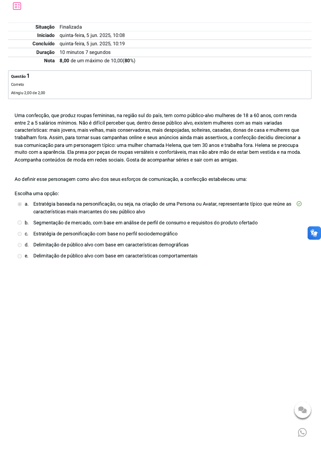 Situação Finalizada Iniciado quinta-feira, 5 jun. 2025, 10:08 Concluído quinta-feira, 5 jun. 2025, 10:19 Duração 10 minutos 7 segundos Nota 8,00 de um máximo de 10,00(80%) Questão 1 Correto Atingiu 2,00 de 2,00 Uma confecção, que produz roupas femininas, na região sul do país, tem como público-alvo mulheres de 18 a 60 anos, com renda entre 2 a 5 salários mínimos. Não é difícil perceber que, dentro desse público alvo, existem mulheres com as mais variadas características: mais jovens, mais velhas, mais conservadoras, mais despojadas, solteiras, casadas, donas de casa e mulheres que trabalham fora. Assim, para tornar suas campanhas online e seus anúncios ainda mais assertivos, a confecção decidiu direcionar a sua comunicação para um personagem típico: uma mulher chamada Helena, que tem 30 anos e trabalha fora. Helena se preocupa muito com a aparência. Ela presa por peças de roupas versáteis e confortáveis, mas não abre mão de estar bem vestida e na moda. Acompanha conteúdos de moda em redes sociais. Gosta de acompanhar séries e sair com as amigas. Ao de�nir esse personagem como alvo dos seus esforços de comunicação, a confecção estabeleceu uma: Escolha uma opção: a. Estratégia baseada na personi�cação, ou seja, na criação de uma Persona ou Avatar, representante típico que reúne as características mais marcantes do seu público alvo b. Segmentação de mercado, com base em análise de per�l de consumo e requisitos do produto ofertado c. Estratégia de personi�cação com base no per�l sociodemográ�co d. Delimitação de público alvo com base em características demográ�cas e. Delimitação de público alvo com base em características comportamentais https://whatsa.me/5533998173005/?t=Ol%C3%A1,%20tenho%20d%C3%BAvidas.... Questão 2 Correto Atingiu 2,00 de 2,00 Questão 3 Incorreto Atingiu 0,00 de 2,00 No e-commerce, a distribuição tende a ser mais ampla do que no comércio tradicional. Para atender clientes de várias regiões, com uma grande diversidade de produtos, as lojas virtuais devem coordenar, de maneira estratégica, todas as atividades que compõem o ciclo de pedidos, o que exige um grande esforço gerencial interno ou, no caso da terceirização de operações, a gestão de uma complexa rede de parceiros. Além disso, no caso do e-commerce, a demanda é considerada dispersa, instável e fragmentada, o que exige atenção redobrada nos métodos de provisão ou projeção de vendas. A tendência é a geração de um grande número de pedidos com pequenos volumes, vindos de regiões dispersas e que devem ser entregues de maneira fracionada, porta a porta. Tais características resultam em baixa densidade geográ�ca (pequena concentração em áreas especí�cas) e custos de entrega mais elevados. O texto acima expõe algumas características particulares que distinguem a operação logística do e-commerce (ou e-logistics) da operação logística do comércio tradicional. Com base na análise do texto, é possível destacar os elementos que são os responsáveis pelas maiores diferenças entre os processos logísticos para negócios virtuais e esses mesmos processos para empreendimentos físicos. Pela ordem de aparição no texto, tais elementos são: Escolha uma opção: a. Comportamento da demanda, inconsistência de pedidos e abrangência b. Armazenagem, distribuição, abrangência e inconsistência da demanda c. Abrangência, internalização e terceirização, inconsistência da demanda d. Custos, inconsistência da demanda, amplitude, internalização e terceirização e. Internalização e terceirização, densidade, amplitude e custos Leia com atenção as a�rmações abaixo: No comércio eletrônico, a compra é intermediada por uma plataforma online e realizada em um computador, notebook, smartphone ou tablete. Em função de suas características peculiares, o e-commerce tem elementos próprios e envolve esforços de planejamento, comunicação e logística. PORQUE Não se trata apenas de ter um site e colocar produtos à venda. Trata-se da organização estratégica de recursos para criar, ofertar e entregar valor (sob a forma de produtos e serviços) para públicos especí�cos. Com base nas a�rmações acima, é correto concluir que: Escolha uma opção: a. As duas a�rmações são verdadeiras e a segunda justi�ca a primeira b. Apenas a primeira a�rmação é verdadeira c. As duas a�rmações são falsas d. As duas a�rmações são verdadeiras e a segunda não justi�ca a primeira e. Apenas a segunda a�rmação é verdadeira https://whatsa.me/5533998173005/?t=Ol%C3%A1,%20tenho%20d%C3%BAvidas.... Questão 4 Correto Atingiu 2,00 de 2,00 Leia com atenção as a�rmações abaixo: É preciso ter cuidado e não ceder ao impulso de descrever o comércio eletrônico exclusivamente como a venda de produtos em ambiente digital. Porque O objetivo do comércio eletrônico é, por meio da aplicação de tecnologias de informação e comunicação, além de esforços logísticos, criar, manter e entregar informações, produtos e serviços a diferentes públicos, a partir de uma interação online. Com base nas a�rmações é correto concluir que: Escolha uma opção: a. As duas a�rmações são verdadeiras e se relacionam b. As duas a�rmações são verdadeiras e não se relacionam c. Apenas a segunda a�rmação é verdadeira d. As duas a�rmações são falsas e. Apenas a primeira a�rmação é verdadeira https://whatsa.me/5533998173005/?t=Ol%C3%A1,%20tenho%20d%C3%BAvidas.... Questão 5 Correto Atingiu 2,00 de 2,00 Reunindo dados da consultoria Ebit/Nielsen, o blog.olist.com (URL: https://bit.ly/2LuRFTt ) apresenta o crescimento das vendas online no Brasil entre os anos de 2012 e 2019. No primeiro ano de análise, o comércio eletrônico foi responsável por R$ 22,5 Bilhões em vendas; já em 2019, as vendas online no Brasil chegaram a R$ 61,2 Bilhões. Além do crescimento signi