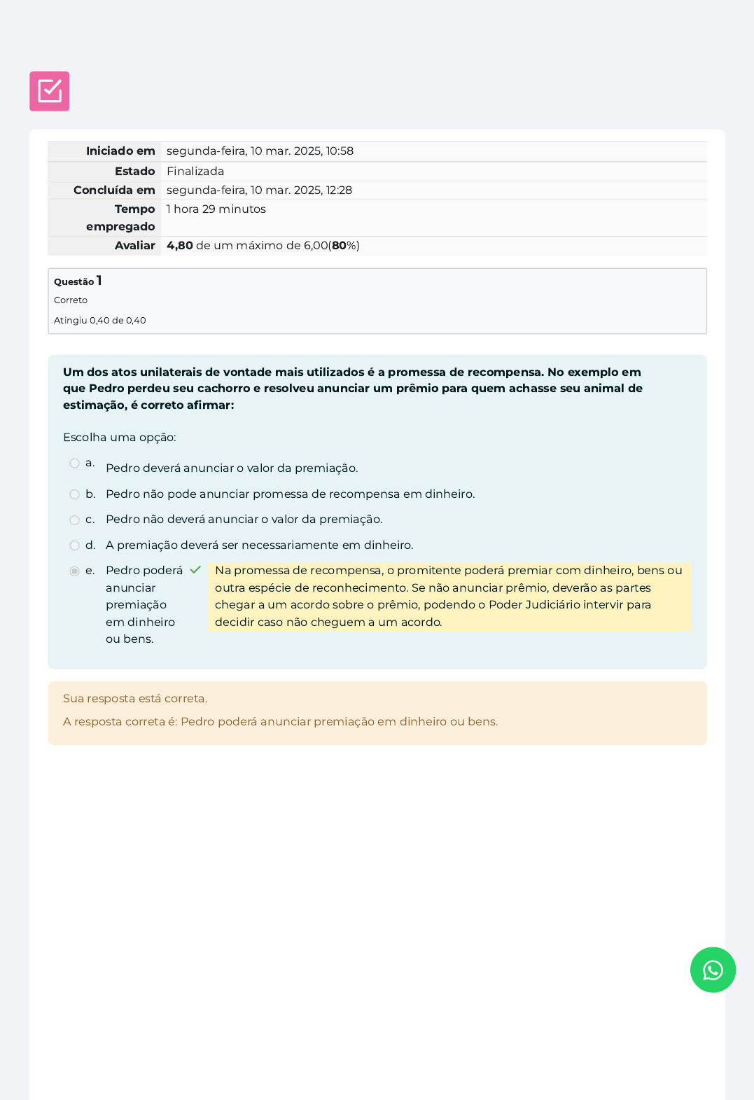 Iniciado em segunda-feira, 10 mar. 2025, 10:58 Estado Finalizada Concluída em segunda-feira, 10 mar. 2025, 12:28 Tempo empregado 1 hora 29 minutos Avaliar 4,80 de um máximo de 6,00(80%) Questão 1 Correto Atingiu 0,40 de 0,40 Um dos atos unilaterais de vontade mais utilizados é a promessa de recompensa. No exemplo em que Pedro perdeu seu cachorro e resolveu anunciar um prêmio para quem achasse seu animal de estimação, é correto afirmar: Escolha uma opção: a. Pedro deverá anunciar o valor da premiação. b. Pedro não pode anunciar promessa de recompensa em dinheiro. c. Pedro não deverá anunciar o valor da premiação. d. A premiação deverá ser necessariamente em dinheiro. e. Pedro poderá anunciar premiação em dinheiro ou bens. ✓ Na promessa de recompensa, o promitente poderá premiar com dinheiro, bens ou outra espécie de reconhecimento. Se não anunciar prêmio, deverão as partes chegar a um acordo sobre o prêmio, podendo o Poder Judiciário intervir para decidir caso não cheguem a um acordo. Sua resposta está correta. A resposta correta é: Pedro poderá anunciar premiação em dinheiro ou bens. https://api.whatsapp.com/send?phone=554491540086&text=Ol%C3%A1,%20como%20podemos%20te%20ajudar%20hoje? Questão 2 Correto Atingiu 0,40 de 0,40 Murilo e Paola celebraram um contrato de mútuo remoto, estando Murilo no Rio de Janeiro e Paola no Espírito Santo. Na ocasião, tanto Murilo quanto Paola assinaram o documento eletronicamente, por meio de suas assinaturas digitais. Transcorrido o prazo estipulado, Murilo não cumpriu com as cláusulas contratuais e Paola precisou executar o contrato, pois, todas as vezes em que tentou entrar em contato com Murilo, não obtinha retorno. Ao ajuizar a ação, o juiz entendeu que Paola não tinha direito de executar o contrato, pois, durante a assinatura, tanto ela quanto Murilo não preencheram o campo das testemunhas e, por esse motivo, o contrato não seria válido. Assinale a resposta correta para o caso. Escolha uma opção: a. Não assiste razão para a decisão do magistrado, uma vez que o STJ já entendeu que a autenticidade das assinaturas digitais, por si só, é capaz de comprovar a vontade das partes e tornar o título executável. ✓ No caso em tela, não assiste razão ao magistrado, uma vez que o STJ entendeu que a autenticidade das assinaturas digitais, por si só, é capaz de tornar o título executável. Em que pese a legislação civil ainda exigir a presença de testemunhas para a garantia de validade do contrato, tal conduta pode ser substituída pela autenticidade das assinaturas digitais. b. Não assiste razão ao magistrado, uma vez que seria impossível, no caso em tela, as testemunhas assinarem o documento, considerando que as partes moram em locais distantes, inviabilizando tal conduta. c. O magistrado está correto em suas alegações, uma vez que, independentemente do meio de formalização do contrato, deve ser respeitada a legislação vigente sobre o tema. d. Não assiste razão ao magistrado, uma vez que o contrato faz lei entre as partes e está em desuso a utilização de testemunhas, pois as partes têm liberdade de celebrar o contrato ou não. e. Assiste razão ao magistrado, pois, no caso em comento, as testemunhas também deveriam ter assinado digitalmente o documento, conferindo, assim, uma maior autenticidade e garantindo sua executabilidade. Sua resposta está correta. A resposta correta é: Não assiste razão para a decisão do magistrado, uma vez que o STJ já entendeu que a autenticidade das assinaturas digitais, por si só, é capaz de comprovar a vontade das partes e tornar o título executável. https://api.whatsapp.com/send?phone=554491540086&text=Ol%C3%A1,%20como%20podemos%20te%20ajudar%20hoje? Questão 3 Correto Atingiu 0,40 de 0,40 O enriquecimento indevido e o pagamento indevido têm como traço característico a ausência de justa causa para a sua ocorrência. O enriquecimento indevido tem como principal característica: Escolha uma opção: a. Ser um ato unilateral de vontade, porque não se precisa repetir o indevido. b. Ser um ato bilateral de vontade, porque sempre envolve quem enriquece e quem empobrece. c. Importar na majoração do patrimônio de alguém em detrimento de outrem. ✓ O enriquecimento indevido é um ato unilateral de vontade em que um enriquece em detrimento do outro, devendo repetir o indevidamente enriquecido. A Receita Federal do Brasil tem por atribuição acompanhar e auditar casos de enriquecimento indevido pelos cidadãos. d. Importar na majoração do patrimônio de alguém, sem importar no empobrecimento de outrem. e. Ser um ato bilateral de vontade, porque sempre envolve dinheiro. Sua resposta está correta. A resposta correta é: Importar na majoração do patrimônio de alguém em detrimento de outrem. https://api.whatsapp.com/send?phone=554491540086&text=Ol%C3%A1,%20como%20podemos%20te%20ajudar%20hoje? Questão 4 Correto Atingiu 0,40 de 0,40 Relativo aos princípios fundamentais dos contratos, é correto afirmar que: Escolha uma opção: a. o princípio da boa-fé objetiva serve de vetor interpretativo dos contratos; contudo, diante de uma cláusula contratual ambígua, por exemplo, deve-se ficar com a interpretação que preserve a boa-fé do contratante. b. os efeitos dos contratos só serão produzidos entre as partes, não se admitindo que o terceiro que não contratou sofra qualquer consequência. c. o princípio da função social dos contratos está relacionado à busca do equilíbrio social, impondo que o contrato seja um instrumento de adequado convívio social, contudo estão excluídas do princípio as matérias que versem sobre meio ambiente, devendo ser tratadas dentro do direito ambiental. d. o princípio da força obrigatória é aquele pelo qual o contrato faz lei entre as partes. Contudo, permite exceções, como as hipóteses em que se admite a revogação do contrato. ✓ O princípio da relatividade admite exceções como 