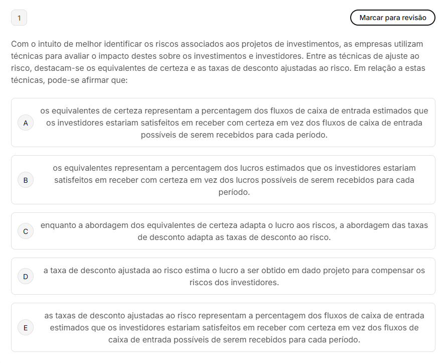 1 Marcar para revisão Com intuito de melhor identificar os riscos associados aos projetos de investimentos, as empresas utilizam técnicas para avaliar impacto destes sobre os investimentos e investidores. Entre as técnicas de ajuste ao risco, destacam-se os equivalentes de certeza e as taxas de desconto ajustadas ao risco. Em relação a estas técnicas, pode-se afirmar que: os equivalentes de certeza representam a percentagem dos fluxos de caixa de entrada estimados que A os investidores estariam satisfeitos em receber com certeza em vez dos fluxos de caixa de entrada possíveis de serem recebidos para cada período. os equivalentes representam a percentagem dos lucros estimados que os investidores estariam B satisfeitos em receber com certeza em vez dos lucros possíveis de serem recebidos para cada período. enquanto a abordagem dos equivalentes de certeza adapta lucro aos riscos, a abordagem das taxas C de desconto adapta as taxas de desconto ao risco. a taxa de desconto ajustada ao risco estima lucro a ser obtido em dado projeto para compensar os D riscos dos investidores. as taxas de desconto ajustadas ao risco representam a percentagem dos fluxos de caixa de entrada E estimados que os investidores estariam satisfeitos em receber com certeza em vez dos fluxos de caixa de entrada possíveis de serem recebidos para cada período.