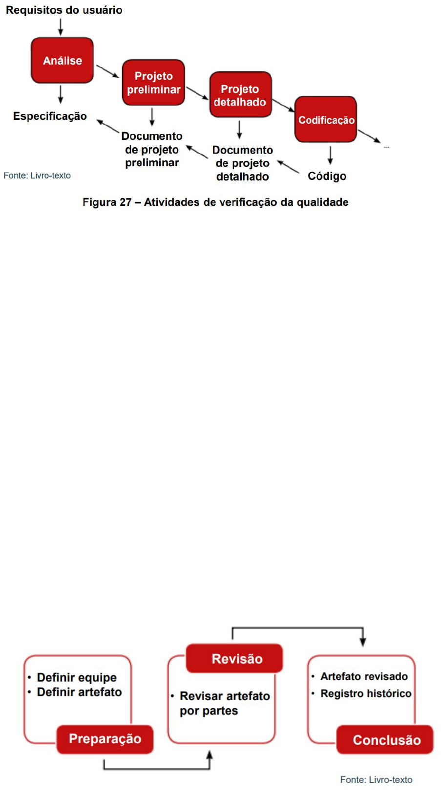 ENGENHARIA DE SOFTWARE II UNIDADE III BLOCO I Verificação e Validação de Software Garante que o produto seja construído corretamente, para que os esforços de correção de problemas causem o menor impacto possível. As técnicas de V&V abrangem os cenários: Aplicação de ferramentas que podem automatizar a revisão de determinados produtos; Utilização do processo de revisão de artefatos (documentação), como revisão por pares; Adoção de normas e padrões; Manutenção de registros de todas as alterações realizadas nos artefatos. Processo de medição para avaliar se a qualidade está se mantendo, melhorando ou piorando. Aspectos para levar em conta na utilização do V&V: Permite encontrar erros mais cedo; Aumenta a integração da equipe; Permite o acompanhamento contínuo da qualidade; Facilita o gerenciamento; Melhora a qualidade; Aumenta a interação das equipes; Deve ser aplicado durante todo o ciclo de desenvolvimento e do planejamento das demais atividades; A ausência do planejamento limita a qualidade; Gera custos mais elevados para encontrar falhas introduzidas no início do desenvolvimento. Verificação Consiste nas ações realizadas ao final de cada fase; Objetivo é atestar que o produto está sendo desenvolvido corretamente; Validação Consiste nas ações realizadas ao final ou no decorrer do processo de desenvolvimento; Objetivo de avaliar se o produto está de acordo com as especificações de requisitos iniciais fornecidas pelo cliente e Garantir que o produto tenha sido desenvolvido corretamente. Revisões técnicas Avaliação crítica de todos os artefatos produzidos durante o desenvolvimento de um software, em pontos predefinidos do ciclo de vida; Objetivo: Encontrar e corrigir erros inseridos durante o processo. Quanto mais cedo encontrarmos esses erros, teremos redução de custos no processo de desenvolvimento. Benefícios: Verificação se o produto de trabalho está em conformidade com os padrões, as especificações e os requisitos definidos; identificação de melhorias necessárias; Documentação e geração de histórico de erros; Consenso entre cliente e equipe sobre os produtos de trabalho. Revisão Técnica Formal (RTF) Deve ser estruturada, Conduzida em uma reunião e será tão bem-sucedida quanto for planejada e controlada. Deve ser realizada sobre artefatos para permitir melhor avaliação e aumentar as probabilidades de sucesso. Revisão Técnica Formal (RTF) – Boas práticas Boas práticas para a condução de uma RTF: A equipe de revisão deve ter de três a cinco pessoas; Equipe com um objetivo alvo para revisão; Artefato a ser revisado deve ser enviado com antecedência; Os papéis dos stakeholders devem estar claramente definidos: moderador, autor e revisores; Iniciar pela leitura do documento pelo autor; A cada parte do documento, a equipe de revisores faz os comentários; O líder faz a mediação em eventuais conflitos e discordâncias; Registrar todos os comentários da revisão para histórico; Duração de, no máximo, 2 horas. Diretrizes básicas de uma RTF As RTFs são procedimentos relativamente simples que produzem resultados significativos na garantia da qualidade de um produto de software. Diretrizes básicas de condução: Fixe e mantenha uma agenda com os participantes; Revise o produto, não o autor do artefato; Faça anotações por escrito; Enuncie os problemas, mas não tente resolver cada um deles; Limite o debate; Realize um treinamento sobre revisões para todos os revisores; Analise suas antigas revisões. Passeio (walkthrough) São revisões técnicas informais, também chamados de revisão por pares, mas podem ter até três participantes: autor, revisor e moderador. O revisor pode ser um técnico, um cliente ou uma pessoa externa ao projeto que domine o assunto em revisão. O moderador não deve ser do mesmo nível hierárquico do autor e do revisor. Prática recomendada pelos métodos ágeis de desenvolvimento. Apoia a recomendação da qualidade a qual determina que tudo deve ser revisado antes de ser entregue ao cliente. O processo: Passeio (walkthrough) Reuniões informais para avaliação dos produtos. Extremamente simples; Não envolve agendamento, preparação ou planejamento prévio. Características: Pouca preparação requerida; Objetivo de comunicar ou receber aprovação do artefato; Papéis específicos não são estabelecidos; Autor guia os presentes pelo artefato; O revisor lê o documento e faz suas considerações; O autor nunca pode ser o leitor. Diretrizes básicas de um Walkthrough Algumas recomendações importantes que devem ser observadas: O autor seleciona os revisores e convida-os para a reunião; O autor entrega o artefato aos revisores na reunião; O foco deve ser o artefato, e não o autor; O autor deve apresentar o artefato durante a reunião; Os revisores apresentam possíveis falhas, comentários e sugestões de melhoria; Com base nas informações apresentadas, o autor faz as devidas correções. Revisões progressivas por pares Constituem características da walkthrough e da RTF. Artefato é dividido em partes e distribuído aos revisores; O artefato deve ser separado e distribuído aos revisores; Na revisão, cada revisor faz a leitura do artefato; Há o registro das revisões; Ao término de cada trecho revisado, o revisor passa a vez para o próximo, e assim sucessivamente, até que todo o material seja revisado; O autor já faz as alterações sugeridas para verificar a eficácia destas Bloco II Técnica de Inspeção Técnica formal, em que os envolvidos examinam os artefatos produzidos contra uma especificação inicial com o objetivo de encontrar incoerência e erros; Realizada a qualquer momento dentro do ciclo de vida de um produto de software; Envolve pessoas com domínio do assunto que está sendo inspecionado e possui um checklist dos pontos que devem ser verificados no artefato. Qualquer produto resultado do trabalho de desenvolvimento, inclusive: D