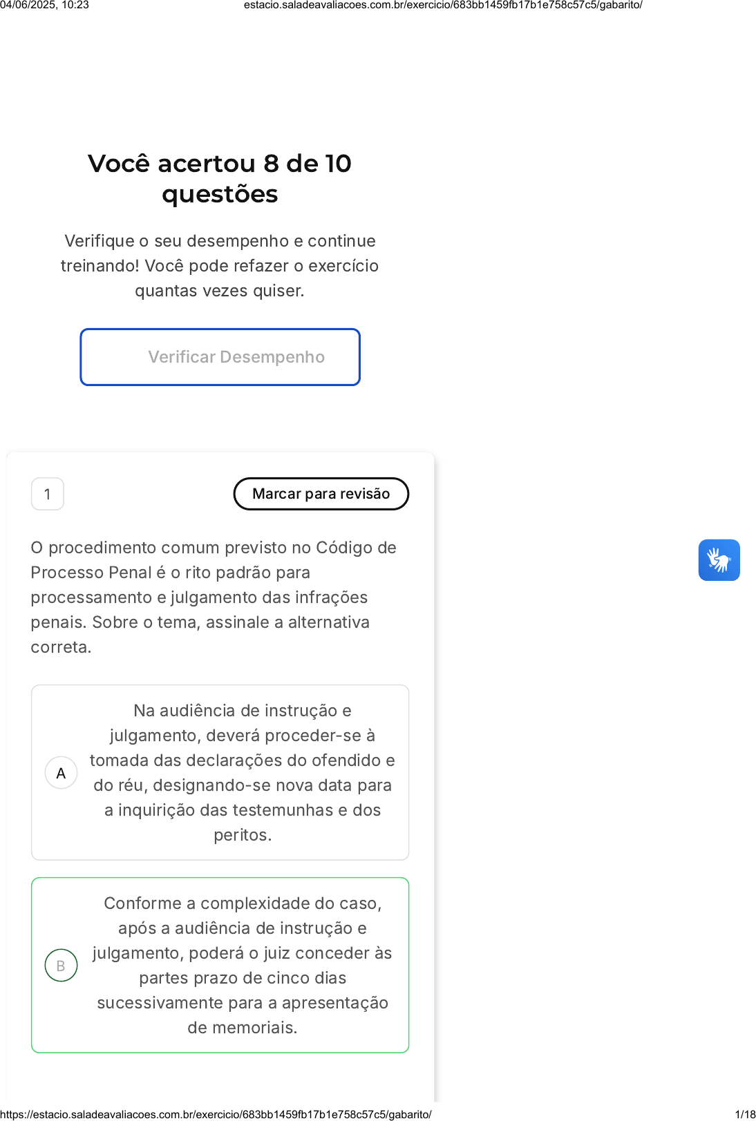 Você acertou 8 de 10 questões Verifique o seu desempenho e continue treinando! Você pode refazer o exercício quantas vezes quiser. Verificar Desempenho A B 1 Marcar para revisão O procedimento comum previsto no Código de Processo Penal é o rito padrão para processamento e julgamento das infrações penais. Sobre o tema, assinale a alternativa correta. Na audiência de instrução e julgamento, deverá proceder-se à tomada das declarações do ofendido e do réu, designando-se nova data para a inquirição das testemunhas e dos peritos. Conforme a complexidade do caso, após a audiência de instrução e julgamento, poderá o juiz conceder às partes prazo de cinco dias sucessivamente para a apresentação de memoriais. 04/06/2025, 10:23 estacio.saladeavaliacoes.com.br/exercicio/683bb1459fb17b1e758c57c5/gabarito/ https://estacio.saladeavaliacoes.com.br/exercicio/683bb1459fb17b1e758c57c5/gabarito/ 1/18 C D E Caso a denúncia ou a queixa sejam manifestamente ineptas ou falte justa causa para ação penal, deverá o réu ser absolvido sumariamente. O juiz decidirá se realiza o interrogatório por videoconferência em razão de pedido do MP, não precisando fundamentar sua decisão. As testemunhas arroladas pela defesa poderão ser inquiridas antes das arroladas pela acusação. Resposta incorreta Opa! A alternativa correta é a letra B. Confira o gabarito comentado! Gabarito Comentado De acordo com o procedimento comum ordinário, após a audiência de instrução e julgamento, o juiz pode conceder às partes um prazo de cinco dias para a apresentação de memoriais, conforme estabelecido no art. 403, § 3º, do Código de Processo Penal (CPP). Isso ocorre em função da complexidade do caso, permitindo que as partes tenham tempo adequado para elaborar suas alegações finais de forma escrita. É importante ressaltar que, na audiência de instrução e julgamento, conforme o art. 400 do CPP, ocorre a tomada de declarações do ofendido, a inquirição das testemunhas arroladas pela acusação e pela defesa, nesta ordem, além dos esclarecimentos dos peritos, acareações e Questão 2 de 10 Corretas (8) Incorretas (2) Em branco (0) 1 2 3 4 5 6 7 8 9 10 Lista de exercícios Atos… Sair 04/06/2025, 10:23 estacio.saladeavaliacoes.com.br/exercicio/683bb1459fb17b1e758c57c5/gabarito/ https://estacio.saladeavaliacoes.com.br/exercicio/683bb1459fb17b1e758c57c5/gabarito/ 2/18 A B C o reconhecimento de pessoas e coisas, culminando no interrogatório do acusado. As hipóteses de absolvição sumária estão previstas no art. 397 do CPP, que incluem a existência manifesta de causa excludente da ilicitude do fato ou da culpabilidade do agente, a constatação de que o fato narrado evidentemente não constitui crime e a extinção da punibilidade do agente. Por fim, a decisão sobre a realização do interrogatório por videoconferência deve ser sempre fundamentada, conforme o art. 185, parágrafo 2º do CPP. 2 Marcar para revisão A citação é o ato pelo qual determinada pessoa é chamada em juízo a fim de se defender. Sobre o tema, assinale a alternativa correta. No processo penal, o réu que se oculta para não ser citado poderá ser citado por hora certa, porém não se aplica a regra estabelecida no Código de Processo Civil. Estando o acusado no estrangeiro, em lugar sabido, a citação far-se-á por carta ou qualquer meio hábil de comunicação. Se o acusado, citado por edital, não comparecer, nem constituir advogado, ficarão suspensos o processo, mas o prazo prescricional continuará correndo. 04/06/2025, 10:23 estacio.saladeavaliacoes.com.br/exercicio/683bb1459fb17b1e758c57c5/gabarito/ https://estacio.saladeavaliacoes.com.br/exercicio/683bb1459fb17b1e758c57c5/gabarito/ 3/18 D E O processo seguirá sem a presença do acusado que, citado ou intimado pessoalmente para qualquer ato, deixar de comparecer sem motivo justificado. A citação do militar será pessoal, na pessoa do acusado. Resposta correta Parabéns, você selecionou a alternativa correta. Confira o gabarito comentado! Gabarito Comentado A alternativa correta é a letra D. De acordo com o artigo 367 do Código de Processo Penal (CPP), o processo pode prosseguir sem a presença do acusado, caso este, após ser citado ou intimado pessoalmente para qualquer ato, deixe de comparecer sem motivo justificado. Nesse caso, o juiz nomeará um defensor para o acusado, caso este não tenha advogado constituído. As demais alternativas apresentam informações incorretas ou incompletas sobre o processo de citação. Por exemplo, a citação por hora certa segue as normas dos artigos 252 e 255 do Código de Processo Civil (CPC), e não como mencionado na alternativa A. Da mesma forma, se o acusado estiver no estrangeiro, a citação se dará por carta rogatória, conforme o artigo 368 do CPP, e não como descrito na alternativa B. Além disso, se o acusado, citado por edital, não comparecer e nem constituir advogado, o processo e o prazo prescricional ficarão suspensos, contrariando o que é afirmado na alternativa C. Por fim, a citação do militar 04/06/2025, 10:23 estacio.saladeavaliacoes.com.br/exercicio/683bb1459fb17b1e758c57c5/gabarito/ https://estacio.saladeavaliacoes.com.br/exercicio/683bb1459fb17b1e758c57c5/gabarito/ 4/18 A B C será feita por intermédio do chefe do respectivo serviço, em respeito aos princípios da hierarquia e disciplina, e não como afirmado na alternativa E. 3 Marcar para revisão Julio Cesar foi denunciado e processado perante o IV Tribunal do Júri da Comarca da Capital. Segundo o Ministério Público, ele teria praticado o crime de homicídio, na modalidade de dolo eventual, previsto no artigo 121, caput do Código Penal. Ao término da primeira fase do procedimento do júri, o juiz pronunciou o acusado. A defesa de Julio Cesar pretende recorrer da decisão de pronúncia e por isso irá interpor o recurso em sentido estrito, previsto no artigo 581, inciso IV do CPP. Considerando que o advogado foi 