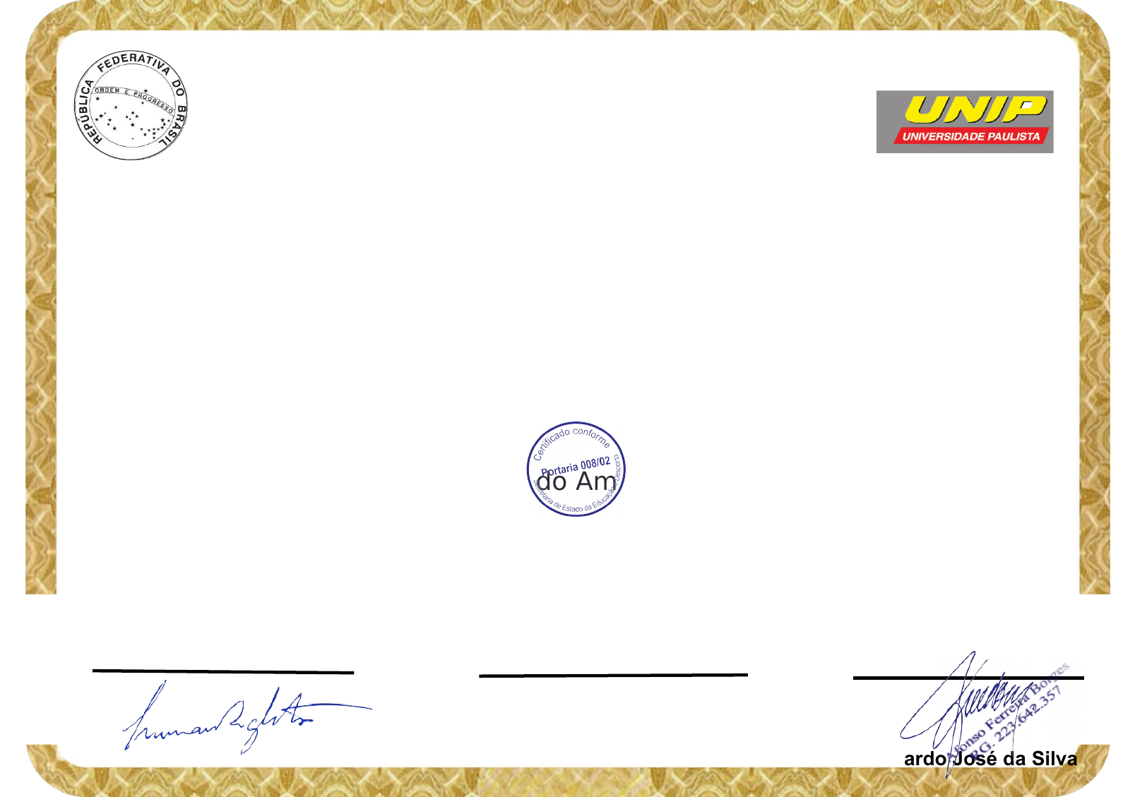 ´ Universidade Paulista O Reitor da Universidade Paulista, no uso de suas atribuições e tendo em vista a conclusão Curso Superior de Psicologia´ A outorga em catráter de mérioa à Bacharel em Psicologia a Ricardo José da Silva Lins brasileiro, natural do Estado do Amazonas, nascido a 23 de novembro de 1977 R.G. n. 121482-3 e outorga-lhe o presente Diploma, a /im de que possa gozar de todos os direitos e prerrogativas legais Ingrid Almeida Diretora de Relacionamento e Serviço do Alunado RG - 22.634.358.22 Ricardo José da Silva Lins Formando RG - 12.6482-3 Afonso Ferreira Borges Secretário Geral RG - 223.642.357 I I Reconhecida pela Portaria MEC nº 550Universidade Paulista PORT. REC. Nº 550 D.O.U DE 05/12/2006 UNIVERSIDADE PAULISTA - UNIP Secretaria Geral Departamento de Registros de Diplomas Diploma Registrado sob nº_321/546899-2020 Processo nº 456565/07-202 nos termos do Artigo 48, parágrafo 1º da Lei 9394/96. Manaus, 07de Julho de 2020 DE ACORDO 14/11/2001 - D.O.U. 16/11/2001 D.O.U de 09/11/1988 Reconhecido pela Portaria MEC nº 2.445 Manaus Reconhecimento Renovado nos termos da Portaria Ministerial nº 2.413 de 07/07/2005 UNIVERSIDADE PAULISTA UNIP INSTITUTO DE ENSINO PRESENCIAL E A DISTÂNCIA Ato Legal de Criação: DECRETO: 156466 de 23/11/1996 Unidade de Ensino: Universidade Paulista - UNIP Av. Mário Ypiranga, 4390 - Parque 10 de Novembro, Manaus - AM Curso: Psicologia Eixo : Humanas Ato de Criação do Curso: Portaria Nº 0022-F Ato de Aprovação do Curso: Resolução CEE Nº 3.745/2002 Carga Horária Total do Curso: 4750 horas Fundamentação Legal: Lei nº 9394/1996, ResoluçãoCNE/CEB nº. 4/1999, Decreto nº. 5154/2004, Resolução Nome do Aluno (a): Ricardo José da Silva Lins Portador (a) do RG.: 1261482-3 Local de Nascimento: Manaus - AM Data de Nascimento: 23/11/1977 Filiação: Pai: José dos Santos Lins (IM) Mãe: Célia Saraiva da Silva Lins HISTÓRICO ESCOLAR SUPERIOR EM PSICOLOGIA 1º PERÍODO COMPONENTES CURRICULARES PONTOS CARGA HORÁRIA % DE FALTAS RESULTADO FINAL 06/02/2016 Abordagens Humanistas em Psicologia 88 60 h 0,5 APROVADO à Apresentação do Trabalho de Pesquisa 93 60 h - APROVADO Atividades Complementares 93 240 h 1,8 APROVADO 25/06/20176 Atividades Práticas Supervisionadas 90 640 h 0,2 APROVADO Ciências Sociais 78 30 h 0,4 APROVADO CARGA HORÁRIA Comportamento Humano nas Organizações 80 30 h 0,2 APROVADO 1180 hs Comunicação e Expressão 88 30 h 1,0 APROVADO Desdobramentos da Teoria Psicanalítica 89 60 h 1,2 APROVADO Direitos da Criança, do Adolescente e do Idoso 90 30 h 0,8 APROVADO 2º PERÍODO COMPONENTES CURRICULARES PONTOS CARGA HORÁRIA % DE FALTAS RESULTADO FINAL 26/06/2017 Educação Ambiental 92 30 h 0,9 APROVADO à Educacão Inclusiva 96 60 h 1,6 APROVADO Estágio Curricular 65 720 h 0,8 APROVADO 06/12/2017 Estratégias de Intervenção Psicológica (Supervisão) 70 60 h 0,4 APROVADO CARGA HORÁRIA Estratégias Específicas de Intervenção Psicológica 88 60 h 0,2 APROVADO Estudos Disciplinares 91 180 h 0,3 APROVADO 1230 hs Ética Profissional 75 60 h 0,2 APROVADO Fisiologia Geral 79 30 h 1,2 APROVADO Genética Humana 88 30 h 1,0 APROVADO 3° PERÍODO COMPONENTES CURRICULARES PONTOS CARGA HORÁRIA % DE FALTAS RESULTADO FINAL 08/06/2018 Metodologia do Trabalho Acadêmico 90 30 h 0,5 APROVADO à Métodos de Pesquisa 82 60 h - APROVADO Neurociências 80 60 h 1,8 APROVADO 22/12/2018 Pesquisa de Campo em Psicologia 70 30 h 0,2 APROVADO Políticas Públicas e Psicologia 62 30 h 0,4 APROVADO CARGA HORÁRIA Práticas Psicológicas em Contextos Específicos 93 60 h 0,2 APROVADO 390 hs Práticas Psicológicas (Supervisão) 89 60 h 1,0 - APROVADO- Práticas Psicológicas (Supervisão) II 88 60 h - APROVADO -- 4° PERÍODO COMPONENTES CURRICULARES PONTOS CARGA HORÁRIA % DE FALTAS RESULTADO FINAL 06/12/2018 à 17/06/2019 Práticas Sociais e Subjetividade 65 60 h 0,2 APROVADO Processos Grupais 91 60 h - APROVADO Processos Psicológicos Básicos 66 30 h 1,2 APROVADO Projeto de Pesquisa em Psicologia 74 60 h 0,3 APROVADO CARGA HORÁRIA 320 hs Psicodiagnóstico (Supervisão) 92 30 h 0,6 APROVADO Psicodiagnóstico (Supervisão) II 91 Psicodiagnóstico (Supervisão) III 95 TOTAL DE HORAS CURSADAS NO CURSO 4750 horas Numa escala de 0 a 100 pontos é promovido à etapa/módulo subsequente o aluno que alcançar, no mínimo, 60 pontos e pelo menos 75% de frequência do total de horas letivas em cada componente curricular. Ingrid´ Almeida Diretora de relacionamento e serviços ao aluno Afonso Ferreira Borges Secretário Geral 5º PERÍODO COMPONENTES CURRICULARES PONTOS CARGA HORÁRIA % DE FALTAS RESULTADO FINAL 25/06/2019 à 06/12/2019 Psicodiagnóstico Interventivo (Supervisão) 76 60 h 0,4 APROVADO Psicologia Comportamental 100 60 h - APROVADO Psicologia Comunitária 95 30 h 0,3 APROVADO Psicologia Construtivista 89 30 h 0,1 APROVADO CARGA HORÁRIA 330 hs Psicologia do Cotidiano 90 30 h 0,1 APROVADO Psic. do Desenv. e Teorias de Aprendizagem 100 30 h 1,2 APROVADO Psicologia do Desenvolvimento: Ciclo Vital 80 60 h 0,2 APROVADO Psicologia Escolar 85 30 h 1,0 APROVADO 6º PERÍODO COMPONENTES CURRICULARES PONTOS CARGA HORÁRIA % DE FALTAS RESULTADO FINAL 06/12/2019 à 25/06/2020 Psicologia Fenomenológica 92 60 h 0,8 APROVADO Psicologia Geral/Experimental 90 30 h 1,2 APROVADO Psicologia Integrada 80 60 h 0,8 APROVADO Psicologia Interdisciplinar 78 60 h 0,2 APROVADO CARGA HORÁRIA 360 hs Psicologia Jurídica 77 30 h 0,1 APROVADO Psicologia Organizacional e do Trabalho 90 60 h 0,3 APROVADO Psicologia Social 78 30 h 1,3 APROVADO Psicologia Sócio-Interacionista 82 30 h 1,1 APROVADO 7º PERÍODO COMPONENTES CURRICULARES PONTOS CARGA HORÁRIA % DE FALTAS RESULTADO FINAL 28/06/2020 à 06/12/2020 Psicologia: Ciência e Profissão 90 60 h - APROVADO Psicometria 85 30 h 0,2 APROVADO Psicopatologia Especial 78 60 h 0,3 APROVADO Psicopatologia Geral 9,0 60 h - APROVADO CARGA HORÁRIA 240 hs Psicoterapia Cognitiva 9,0 30 h 1,4 APROVADO OPTATIVA 001 8.