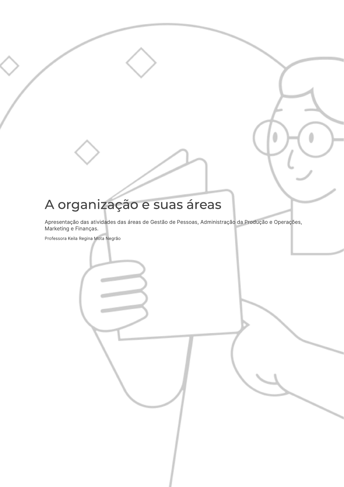 A organização e suas áreas Apresentação das atividades das áreas de Gestão de Pessoas, Administração da Produção e Operações, Marketing e Finanças. Professora Keila Regina Mota Negrão1. Itens iniciais Propósito Compreender a função e o papel de algumas áreas que fazem parte do universo da organização. Objetivos Identificar os principais processos da área de Gestão de Pessoas. Reconhecer a importância da área de Finanças para as organizações. Descrever o funcionamento da área de Produção e Operações. Listar os elementos do Mix de marketing. Introdução A Administração tem como objeto de estudo as organizações. As organizações podem ser de tamanhos, formas e finalidades bem diferentes. Entretanto, elas geralmente têm em comum alguns pontos: são formadas por pessoas que trabalham para algum objetivo, bem como são divididas em algumas atividades específicas. francês Henry Fayol foi um dos pais da Administração Clássica e tentou dividir a organização em algumas funções ou áreas dentre elas a comercial, a financeira, a técnica ou de produção, de segurança ou de pessoal. A Administração tem como objeto de estudo as organizações. As organizações podem ser de tamanhos, formas e finalidades bem diferentes. Entretanto, elas geralmente têm em comum alguns pontos: são formadas por pessoas que trabalham para algum objetivo, bem como são divididas em algumas atividades específicas. francês Henry Fayol foi um dos pais da Administração Clássica e tentou dividir a organização em algumas funções ou áreas dentre elas a comercial, a financeira, a técnica ou de produção, de segurança ou de pessoal. Provavelmente, você participa de algumas organizações. Podem ser educacionais, clubes recreativos, empresas, igrejas etc. Quanto melhor entendermos o que são organizações e quais suas principais áreas, melhor devemos nos engajar nos trabalhos. Além disso, vamos também entender que tais áreas são como partes do corpo que devem trabalhar em harmonia e sintonia. Assim como não podemos desprezar alguma parte do corpo, como o pâncreas ou a boca, não podemos desprezar alguma área da organização, como comercial e pessoal. Objetivos claros, boa gestão e boas equipes fazem com que a organizações e suas áreas trabalhem com afinco para bater suas metas. Seja bem-vindo ao estudo da organização e suas áreas!1. Pessoas nas Organizações Introdução Você já ouviu falar que as pessoas são a parte mais importante de uma organização? Em qualquer ambiente de trabalho, seja uma pequena, média ou grande empresa; pública (prefeitura, escola, hospital etc.) ou privada (loja de roupas, academia, restaurante etc.), ou até mesmo em uma organização não governamental ONG (APAE, Greenpeace, Médicos sem Fronteiras etc.), sempre encontraremos pessoas. Para que uma organização possa alcançar resultados, precisa do apoio de uma área que cuide não apenas dos trâmites legais relacionados aos contratos de trabalho dos seus colaboradores, mas também que seja responsável pelos processos capazes de atrair, ESTAMOS desenvolver e reter seus FALANDO Pessoas talentosas, qualificadas e da área de Gestão de Pessoas comprometidas realizam seu trabalho com excelência, entregam maior valor aos clientes e são capazes de atingir os resultados desejados. que é a organização? Assista ao vídeo e conheça o conceito de organização e o papel de algumas de suas áreas funcionais. Conteúdo interativo Acesse a versão digital para assistir ao vídeo. ambiente organizacional e desempenho humano As últimas décadas testemunharam mudanças profundas no papel da área de Gestão de Pessoas dentro das organizações. Visão Tradicional do RH Tradicionalmente, os gerentes viam a função de recursos humanos como basicamente administrativa e pessoal. Para eles, a área de Gestão de Pessoas se concentrava no gerenciamento dos benefícios exigidos em lei e das atividades rotineiras, como folhas de pagamentos e outras funções operacionais, fatores que, de acordo com essa mentalidade, mensuravam a influência do RH sobre o bom funcionamento da empresa.RH como Estratégia Empresarial A área passou a ser considerada estratégica a partir do momento em que se tornou possível medir a eficácia das suas ações e entender de que forma elas favorecem o aumento da performance e dos resultados organizacionais.Desenvolveu-se uma nova ênfase sobre estratégias de negócios e sobre a relevância dos processos da área de Gestão de Pessoas. Cada vez mais, passa-se a conhecer e reconhecer que o alinhamento da área com a estratégia da empresa garante melhores resultados. Um dos principais motivos é a valorização dos ativos intangíveis como fonte de vantagem competitiva sustentável, que é a maneira pela qual uma empresa se diferencia de seus concorrentes. Em um ambiente competitivo, as empresas precisam entregar produtos e ou serviços que sejam raros, difíceis de imitar, além de oferecer real valor aos clientes. (Prahalad; Hamel, 1998) Ativos intangíveis As competências dos empregados para a realização das atividades, o clima para a ação em busca de resultados, que envolve a motivação e o compromisso de todos, a capacidade da empresa melhorar seus processos internos são exemplos de recursos intangíveis. Se as empresas buscam fortalecer essa vantagem competitiva, cabe à área de Gestão de Pessoas, portanto, maximizar a contribuição das suas atividades para alcançar esse mesmo objetivo. Vejamos alguns exemplos que exemplificam este conceito na prática: o caso do Google exemplifica como operacionalizar na prática esse conceito: Os principais ativos do Google são o atendimento e a confiança dos clientes. A inovação é o que sustenta a vantagem competitiva. Quanto mais popular é uma ideia, mais adeptos ela ganha, e maiores são suas possibilidades de avançar. Por isso, na empresa, estimula-se o trabalho em equipe de pessoas br