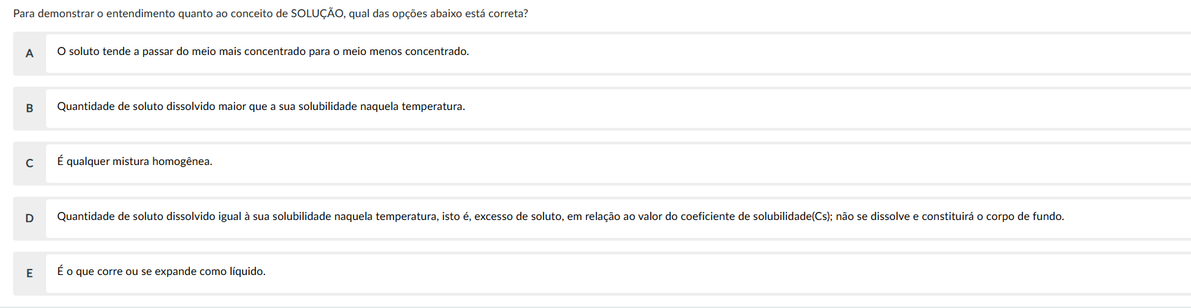 Para demonstrar o entendimento quanto ao conceito de SOLUÇÃO, qual das opções abaixo está correta? A soluto tende a passar do meio mais concentrado para o meio menos concentrado. B Quantidade de soluto dissolvido maior que a sua solubilidade naquela temperatura. C É qualquer mistura homogênea. D Quantidade de soluto dissolvido igual à sua solubilidade naquela temperatura, isto é, excesso de soluto, em relação ao valor do coeficiente de não se dissolve e constituirá o corpo de fundo. E É o que corre ou se expande como líquido.