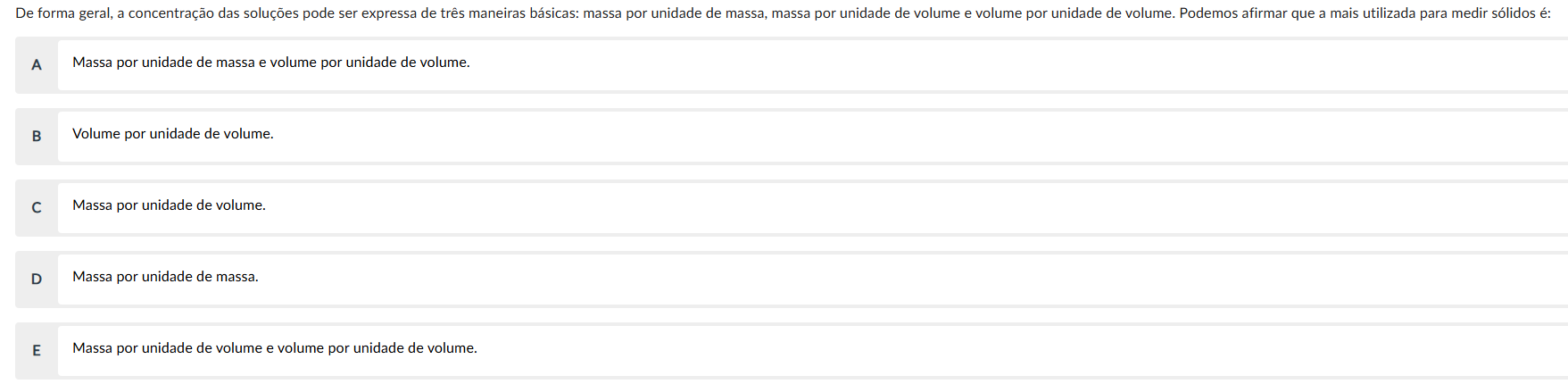 De forma geral, a concentração das soluções pode ser expressa de três maneiras básicas: massa por unidade de massa, massa por unidade de volume e volume por unidade de volume. Podemos afirmar que a mais utilizada para medir sólidos é: A Massa por unidade de massa e volume por unidade de volume. B Volume por unidade de volume. C Massa por unidade de volume. D Massa por unidade de massa. E Massa por unidade de volume e volume por unidade de volume.
