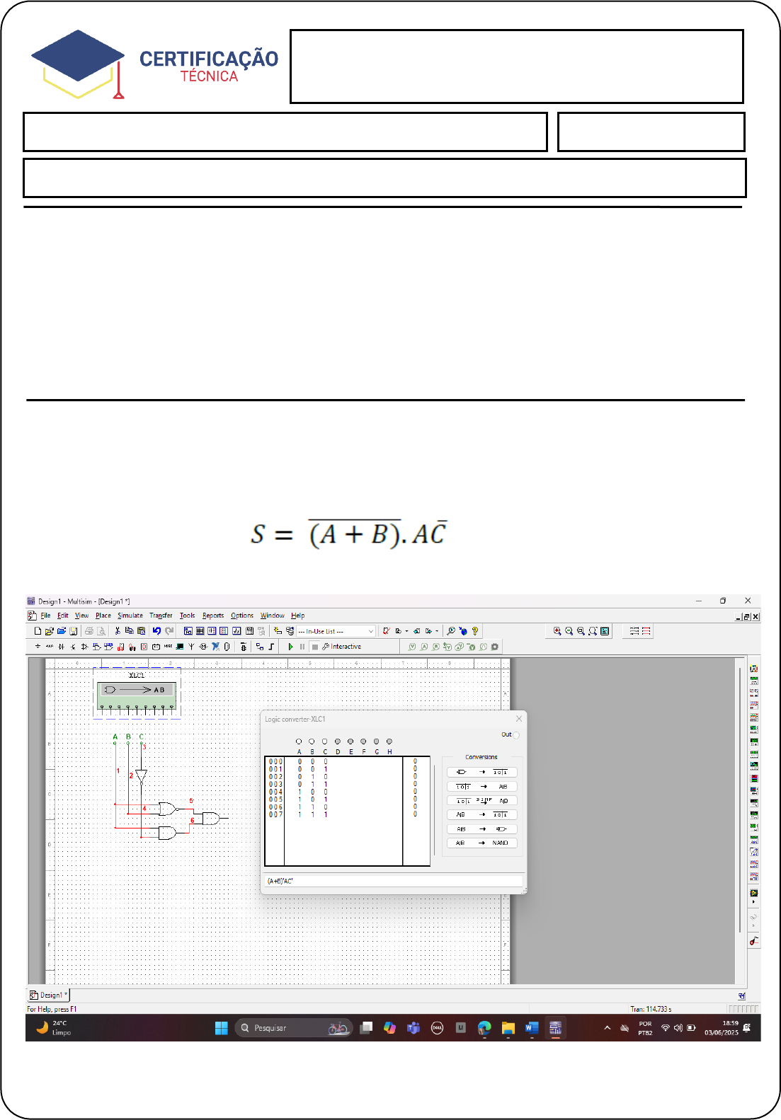 Multisim Avançado - Técnicas de Simulação Multisim Avançado - Técnicas de Simulação Aluno (a): Data: 03 / 06/ 2025. Atividade Prática Final INSTRUÇÕES: · Esta Avaliação contém questões, totalizando 10 (dez) pontos. · Você deve preencher dos dados no Cabeçalho para sua identificação · Nome / Data de entrega · As respostas devem ser digitadas abaixo de cada pergunta. · Todas as questões podem ser resolvidas estudando os tópicos da disciplina. · Ao terminar, grave o arquivo com o nome Avaliação Pesquisa/Prática. · Envio o arquivo pelo sistema. Utilize o Multisim online para criar o circuito digital referente à expressão booleana mostrada abaixo: Atividade Prática Final image3.png image1.png image2.png
