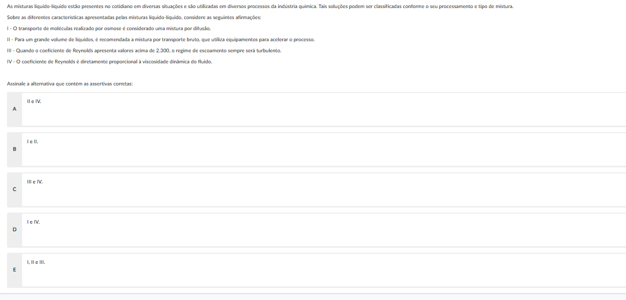 As misturas liquido-liquido estão presentes no cotidiano em diversas situações e são utilizadas em diversos processos da Tais soluções podem ser classificadas conforme o seu processamento e tipo de mistura. Sobre as diferentes caracteristicas apresentadas pelas misturas considere as seguintes transporte de moléculas realizado por osmose é considerado uma mistura por difusão. Para um grande volume de é recomendada a mistura por transporte que utiliza equipamentos para acelerar processo. III Quando coeficiente de Reynolds apresenta valores acima de 2.300, o regime de escoamento sempre será turbulento. IV coeficiente de Reynolds é diretamente proporcional à viscosidade dinâmica do fluido. Assinale a alternativa que contém as assertivas corretas: II IV. A II. B III IV. C IV. D I. III. E