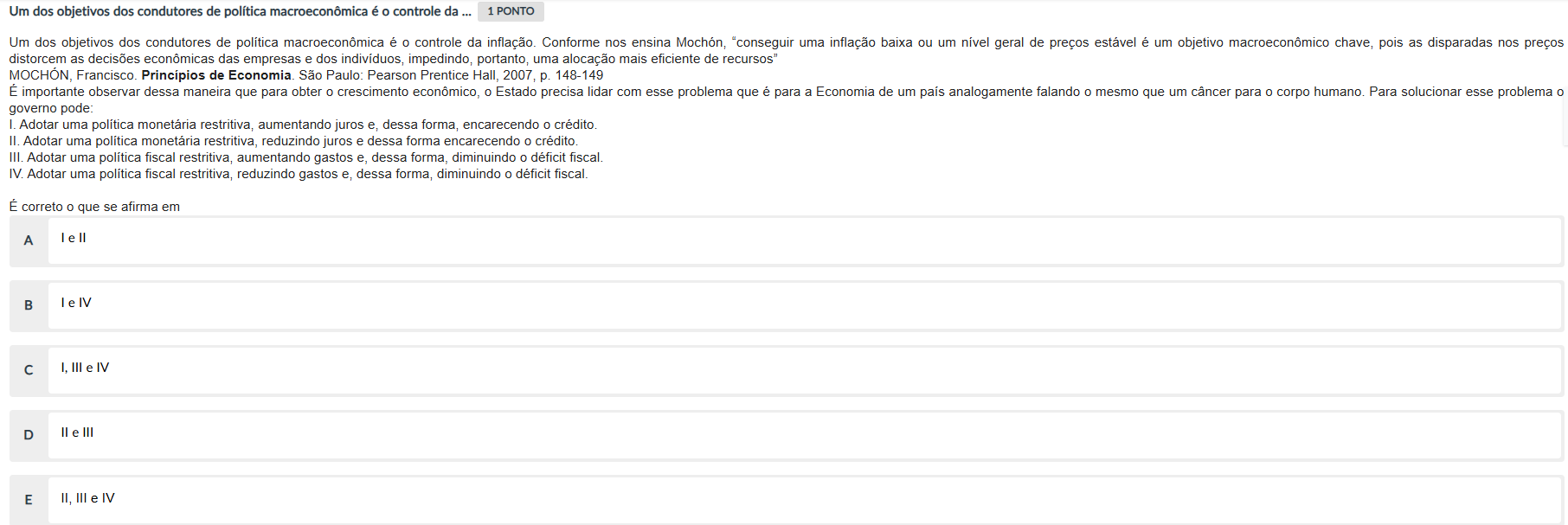 Um dos objetivos dos condutores de política macroeconômica controle da 1 PONTO Um dos objetivos dos condutores de política macroeconômica é controle da inflação. Conforme nos ensina Mochón, "conseguir uma inflação baixa ou um nível geral de preços estável é um objetivo macroeconômico chave, pois as disparadas nos preços distorcem as decisões econômicas das empresas e dos indivíduos, impedindo, portanto, uma alocação mais eficiente de recursos" Francisco. Princípios de São Paulo: Pearson Prentice Hall, 2007, p. 148-149 É importante observar dessa maneira que para obter crescimento econômico, Estado precisa lidar com esse problema que é para a Economia de um país analogamente falando mesmo que um câncer para corpo Para solucionar esse problema o governo pode: I. Adotar uma política monetária restritiva, aumentando juros e, dessa forma, encarecendo o crédito. II. Adotar uma política monetária restritiva, reduzindo juros e dessa forma encarecendo crédito. III. Adotar uma política fiscal restritiva, aumentando gastos e, dessa forma, diminuindo déficit fiscal. IV. Adotar uma política fiscal restritiva, reduzindo gastos e, dessa forma, diminuindo déficit fiscal. É correto que se afirma em A le II B le IV C I. III e IV D II III E II, III e IV