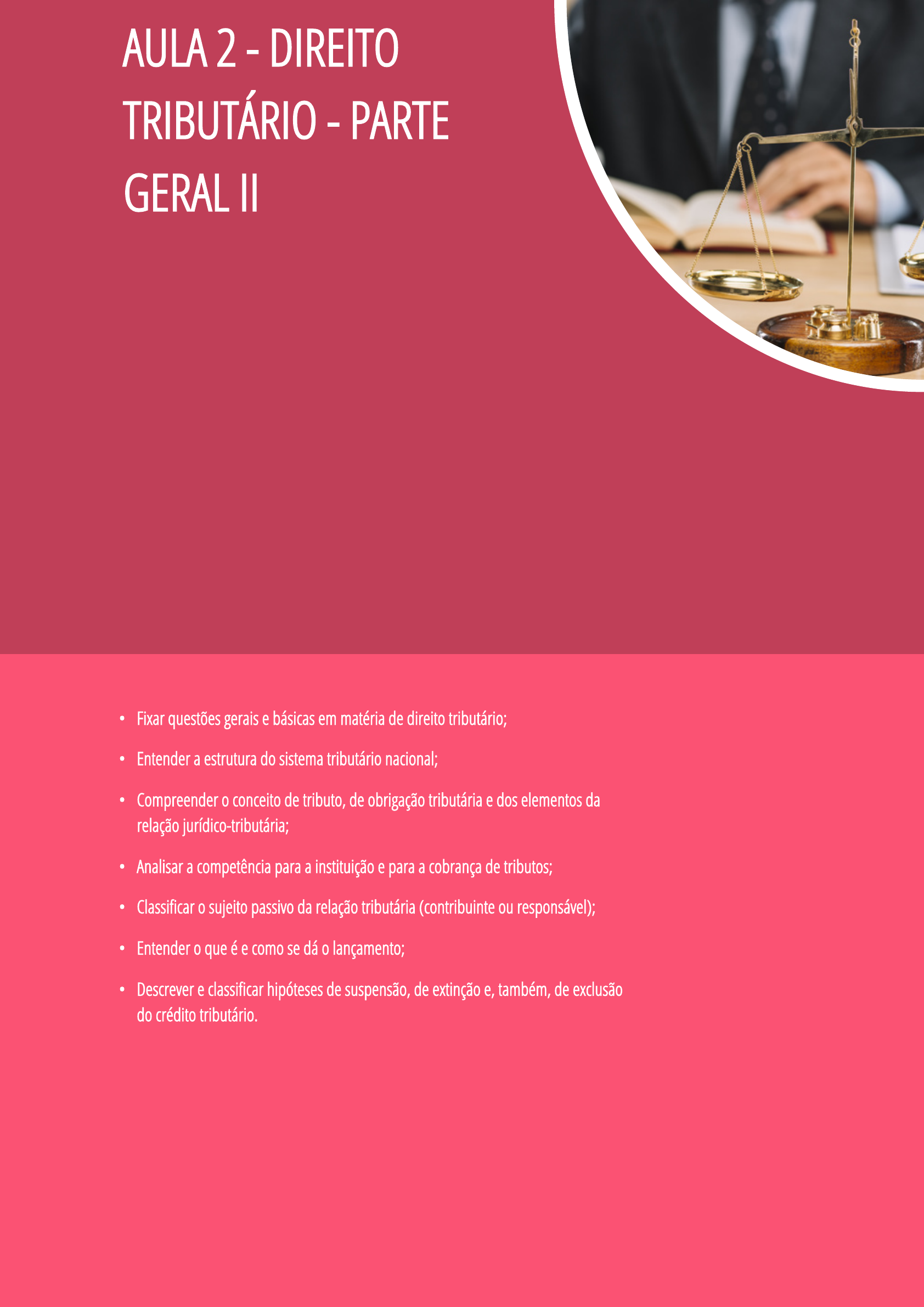AULA 2 - DIREITO TRIBUTÁRIO - PARTE GERAL II • Fixar questões gerais e básicas em matéria de direito tributário; • Entender a estrutura do sistema tributário nacional; • Compreender o conceito de tributo, de obrigação tributária e dos elementos da relação jurídico-tributária; • Analisar a competência para a instituição e para a cobrança de tributos; • Classificar o sujeito passivo da relação tributária (contribuinte ou responsável); • Entender o que é e como se dá o lançamento; • Descrever e classificar hipóteses de suspensão, de extinção e, também, de exclusão do crédito tributário. CONTEXTUALIZANDO A APRENDIZAGEM Na primeira Aula, tivemos um primeiro contato com o direito tributário, a partir da análise de algumas questões gerais como o surgimento, os objetivos e a importância da tributação. Vimos, também, o papel do direito tributário neste contexto, suas fontes (isto é, de onde se originam as normas tributárias e quais seus meios de expressão), o modo como se dá sua aplicação, interpretação e integração no ordenamento jurídico. Também analisamos os princípios que norteiam a matéria e limitam o poder de tributar do Estado, bem como entendemos o funcionamento das isenções e imunidades tributárias. Nesta segunda Aula, daremos continuidade à parte geral do direito tributário, antes de adentrarmos no estudo dos tributos em espécie, de outros temas pontuais como processo e planejamento tributário e, também, de partirmos para a análise do direito empresarial. Você é capaz de entender a estrutura do sistema tributário nacional? Sabe identificar o conceito de tributo dado pela legislação tributária e como se forma a obrigação tributária e a relação jurídica entre Estado e sujeito passivo? Ainda no universo da relação jurídico-tributária, pode compreender sobre a competência e a capacidade de cada ente para instituir e cobrar um tributo? E sobre a qualidade do sujeito passivo, que, mesmo não sendo contribuinte, poderá ser responsabilizado pelo pagamento do tributo devido por outra pessoa? Sabe como o crédito tributário é constituído, susénso, extinto e excluído? Provavelmente, alguns termos lhe causam estranheza, correto!? Mas, assim como o que já estudamos, são fundamentais à compreensão do direito tributário! Por isto, veremos, neste momento, como é estruturado o Sistema Tributário Nacional. Também apresentaremos o conceito de tributo dado pela legislação, antes de introduzir o tema da obrigação tributária e analisarmos a competência para a instituição e a cobrança de tributos, bem como a qualidade dos particulares para figurarem como sujeito passivo desta relação jurídico-tributária. Examinaremos o ato administrativo do lançamento e, por fim, casos nos quais o crédito tributário é suspenso, extinto e excluso. Mapa mental panorâmico Para contextualizar e ajudá-lo(a) a obter uma visão panorâmica dos conteúdos que você estudará na Aula 2, bem como entender a inter-relação entre eles, é importante que se atente para o Mapa Mental, apresentado a seguir: DIREITO TRIBUTÁRIO - PARTE GERAL II 1 SISTEMA TRIBUTÁRIO NACIONAL 2 TRIBUTO 3 OBRIGAÇÃO TRIBUTÁRIA E RELAÇÃO JURÍDICO 3.1 ASPECTOS DA NORMA TRIBUTÁRIA IMPOSITIVA 3.2 CLASSIFICAÇÃO DOS FATOS GERADORES 4 COMPETÊNCIA 5 O SUJEITO PASSIVO 5.1 CONTRIBUINTE 5.2 RESPONSÁVEL 6 LANÇAMENTO TRIBUTÁRIO 7 SUSPENSÃO DO CRÉDITO TRIBUTÁRIO 8 EXTINÇÃO DO CRÉDITO TRIBUTÁRIO 9 EXCLUSÃO DO CRÉDITO TRIBUTÁRIO DIREITO TRIBUTÁRIO - PARTE GERAL II 1 SISTEMA TRIBUTÁRIO NACIONAL O Código Tributário Nacional possui dois livros. O primeiro deles, “O Sistema Tributário Nacional”, trata do conceito de tributo, da competência tributária e das suas limitações, das distribuições das receitas tributárias e, também, das espécies tributárias e tributos variados. O segundo, “Normas gerais de direito tributário”, cuida de temas como a legislação tributária e sua aplicação, interpretação e integração; a obrigação tributária; o lançamento; a administração tributária; as preferências e privilégios da Fazenda Pública. No ápice do sistema tributário está a Constituição Federal. Os demais documentos normativos infraconstitucionais, isto é, abaixo da CF, nesta hierarquia, extraem dela os fundamentos para sua validade. Os entes da federação recebem diretamente da CF as suas competências, acompanhadas das respectivas limitações e passam a editar suas Constituições (estaduais e municipais) e suas demais leis, mas sempre em observância às normas gerais veiculadas pela Carta Magna; depois, obedientes ao Código Tributário Nacional, às demais leis complementares e às resoluções do senado (COELHO, 2018). Vejamos o seguinte quadro, que mostra a hierarquia de algumas normas tributárias: Quadro 1 - hierarquia de algumas normas tributárias Fonte: Coelho (2018, p. 295). Leis complementares e ordinárias se diferenciam, basicamente, nos quesitos da matéria do quórum de aprovação (isto é, quanto aos votos necessários para que sejam aprovadas). A lei complementar regula as matérias definidas pela Constituição Federal (podendo abordar outras) e deve ser aprovada por maioria absoluta dos votos (mais da metade de todos os membros precisa aprovar). A lei ordinária aborda quaisquer matérias que não sejam reguladas por lei complementar, por decretos legislativos, ou por resoluções e sua aprovação se dá por maioria simples ou relativa (mais da metade dos membros presentes na sessão de votação apenas). Devemos salientar que não necessariamente haverá hierarquia entre ambas, que atuam em campos diferentes. O CTN foi editado como Lei Ordinária, mas foi recepcionado no ordenamento como Lei Complementar, por tratar de normas gerais e porque a Constituição definiu que seriam objeto deste tipo de normativa. Sugiro que você aprofunde seus estudos nos tipos de normas e suas