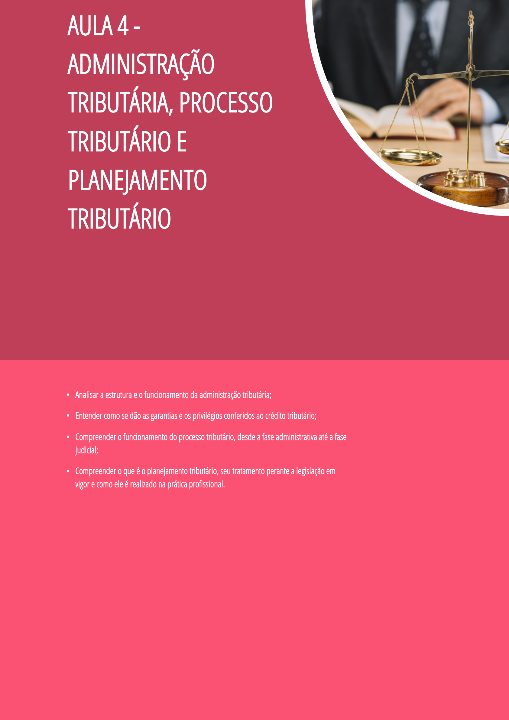 AULA 4 - ADMINISTRAÇÃO TRIBUTÁRIA, PROCESSO TRIBUTÁRIO E PLANEJAMENTO TRIBUTÁRIO • Analisar a estrutura e o funcionamento da administração tributária; • Entender como se dão as garantias e os privilégios conferidos ao crédito tributário; • Compreender o funcionamento do processo tributário, desde a fase administrativa até a fase judicial; • Compreender o que é o planejamento tributário, seu tratamento perante a legislação em vigor e como ele é realizado na prática profissional. CONTEXTUALIZANDO A APRENDIZAGEM Na Aula 3, prosseguimos com o estudo do direito tributário, na qual analisamos os tipos de tributos, as repartições das receitas tributárias, os principais impostos atualmente existentes e os regimes brasileiros de tributação, notadamente o Simples Nacional. Você sabe o que são e como funcionam os procedimentos adotados pela Administração Tributária? Neste sentido, compreende o papel da fiscalização, da inscrição dos débitos tributários em dívida ativa, da cobrança extrajudicial e judicial do crédito tributário (por meio de atos como protesto de CDA´s e execução fiscal) e das medidas de controle e verificação da regularidade fiscal do contribuinte (como a emissão de certidões de regularidade fiscal)? É capaz de compreender como se dão as garantias e privilégios conferidos ao crédito tributário sobre outros créditos existentes em face de um mesmo devedor? Pode compreender o funcionamento do processo tributário, desde a fase administrativa até a fase judicial? Sabe o que é o planejamento tributário, qual seu tratamento dado pela legislação e como ocorre na prática? Neste momento, podemos iniciar o estudo de outros assuntos pontuais ainda em matéria tributária, como Administração Tributária, garantias e privilégios atribuídos ao crédito tributário, processo tributário, planejamento tributário e temas, ou questões mais específicas, recorrentes e importantes dentro destes assuntos. Mapa mental panorâmico Para contextualizar e ajudá-lo(a) a obter uma visão panorâmica dos conteúdos que você estudará na Aula 4, bem como entender a inter- relação entre eles, é importante que se atente para o Mapa Mental, apresentado a seguir: ADMINISTRAÇÃO TRIBUTÁRIA, PROCESSO TRIBUTÁRIO E PLANEJAMENTO TRIBUTÁRIO 1 ADMINISTRAÇÃO TRIBUTÁRIA 1.1 FISCALIZAÇÃO 1.2 DÍVIDA ATIVA 1.3 PROTESTO DE CDA 1.4 CERTIDÕES DE REGULARIDADE FISCAL 1.5 EXECUÇÃO FISCAL 1.6 DECADÊNCIA E PRESCRIÇÃO 1.7 DISPOSIÇÕES FINAIS E TRANSITÓRIAS DO CTN 2 GARANTIAS E PRIVILÉGIOS DO CRÉDITO TRIBUTÁRIO 2.1 GARANTIAS 2.2 PREFERÊNCIAS (OU PRIVILÉGIOS) DO CRÉDITO TRIBUTÁRIO 3 PROCESSO TRIBUTÁRIO ADMINISTRATIVO E JUDICIAL 3.1 PROCESSO ADMINISTRATIVO 3.2 PROCESSO JUDICIAL 3.2.1 AÇÕES E DEFESAS DO CONTRIBUINTE 4 PLANEJAMENTO TRIBUTÁRIO ADMINISTRAÇÃO TRIBUTÁRIA, PROCESSO TRIBUTÁRIO E PLANEJAMENTO TRIBUTÁRIO 1 ADMINISTRAÇÃO TRIBUTÁRIA A administração tributária, fundamental para o cumprimento do objetivo do Poder Público de efetivamente obter receita tributária (SABBAG, 2019), consiste basicamente nos procedimentos descritos nos arts. 194 a 208 do CTN, quais sejam: fiscalização, cobrança judicial dos valores inscritos em dívida ativa (subitem 1.2) e medidas de controle e verificação da regularidade fiscal do contribuinte, que passamos a abordar em seguida. 1.1 FISCALIZAÇÃO Pela fiscalização, a Administração verifica o cumprimento das obrigações tributárias principais e acessórias pelos sujeitos passivos. Trata- se de um ato da Administração que, revestido de caráter público, deve observar os princípios que regem o direito administrativo, como legalidade, impessoalidade, moralidade, publicidade e eficiência (art. 37 da CF). Mesmo as pessoas isentas ou imunes (que devem cumprir obrigações que não sejam especificamente de “pagar”) estão sujeitas à fiscalização; tanto, que todos os seus livros comerciais - que, juntamente com outros documentos importantes de uma pessoa jurídica - devem ser guardados (mantidos) enquanto perdurarem os créditos, conforme art. 195 do CTN. A fiscalização, no entanto, fica limitada aos pontos que são objeto da investigação, não podendo haver usurpação (posse) da competência administrativa, conforme Súmula n° 439 do STF: “Estão sujeitos à fiscalização tributária ou previdenciária quaisquer livros comerciais, limitado o exame aos pontos objeto da investigação”. A fiscalização é formalmente iniciada com o chamado “termo de início de fiscalização” (ou semelhante) e possui prazo de encerramento, para que não seja prolongada ad infinitum - isto é, para que tenha um fim, um limite; até porque, como já estudamos, o poder do Estado deve ser limitado. Eduardo Sabbag (2019) aponta que os atos de início e fim da fiscalização orientam dois importantes institutos: a denúncia espontânea e a decadência, previstos nos arts. 138 e 173 do CTN, respectivamente. No que tange à denúncia espontânea (já mencionada no subitem “a.4”, do item “5.2”, da Aula 2), deve ser oferecida antes de qualquer procedimento fiscalizatório, nos termos do art. 138 do referido Código. E, quanto à decadência, caso a medida fiscalizatória se dê antes do primeiro dia do exercício seguinte ao que o lançamento poderia ter sido efetuado, é do início da fiscalização que será contado o prazo decadencial, da perda do direito do Fisco de lançar (formalizar, constituir) um crédito tributário para posterior cobrança (SABBAG, 2019). Vale dizer, também, que algumas pessoas estão obrigadas a prestar informações a respeito de terceiros, após serem intimadas nos termos da lei, como tabeliães, escrivães, bancos, corretoras, leiloeiros, empresas administradoras de bens, síndicos, comissários. Estas pessoas devem prestar à autoridade administrativa todas as informações de que disponham sobre os bens, negócios ou atividades de terceiros, co