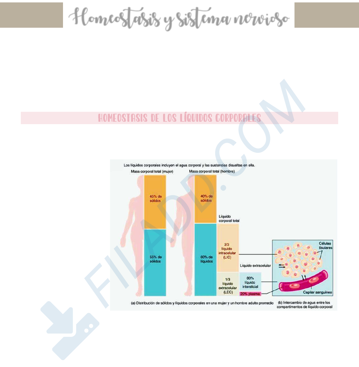 Página 1 de 24 La homeostasis es la condición de equilibrio del medio interno gracias a la interacción continua de los múltiples procesos de regulación corporal. La homeostasis es un proceso dinámico. El estado de equilibrio del cuerpo se puede modificar dentro de estrechos márgenes compatibles con la vida, en respuesta a condiciones cambiantes. Es decir que, la homeostasis es la tendencia a resistir cambios con el fin de mantener un ambiente interno estable y relativamente constante. Los líquidos corporales son soluciones acuosas diluidas que contienen sustancias químicas disueltas, que se encuentran tanto dentro de las células como a su alrededor. El líquido dentro de las células se denomina líquido intracelular (LIC) (intra- = dentro). El líquido fuera de las células del cuerpo es el líquido extracelular (LEC) (extra- = fuera). El LEC que rellena los estrechos espacios entre las células de los tejidos se conoce como líquido intersticial (inter- = entre). El LEC varía según las distintas partes del cuerpo en que se encuentra: se denomina al LEC dentro de los vasos sanguíneos. El funcionamiento adecuado de las células del cuerpo depende de la regulación precisa de la composición del líquido intersticial que las rodea. Debido a ello, el líquido intersticial suele ser denominado medio interno. La composición del líquido intersticial se modifica a medida que las sustancias se desplazan hacia el plasma y fuera de éste. Este intercambio de sustancias se produce a través de las delgadas paredes de los capilares sanguíneos, los vasos más pequeños del cuerpo. El movimiento bidireccional a través de las paredes de los capilares aporta los materiales necesarios, como glucosa, oxígeno, iones y otros, a las células de los tejidos. También elimina desechos, por ejemplo, dióxido de carbono, del líquido intersticial. Homeostasis y sistema nervioso Este archivo fue descargado de https://filadd.com � FILADD.COM Página 2 de 24 Entre el LIC y el LEC hay intercambio de sustancias, y la composición de ambos no es la misma. Dos barreras generales separan el LIC, el líquido intersticial y el plasma: 1. La membrana plasmática de cada célula separa el LIC del medio interno. Esta permite que algunas sustancias la atraviesen e impide el movimiento de otras. Así mismo, el transporte activo funciona manteniendo diferentes concentraciones de ciertos iones entre el citosol y el medio interno. 2. Paredes de vasos sanguíneos separan el medio interno del plasma. Solo en capilares (porque son los vasos sanguíneos más chicos), las paredes son delgadas y permeables, lo que permite el intercambio de agua y de solutos entre plasma y líquido intersticial. Concentración de los electrolitos en los líquidos corporales: La diferencia principal entre los dos líquidos intracelulares (plasma e intersticial) es que el plasma contiene numerosas proteínas anionicas, mientras que el líquido intersticial muy pocas. El contenido de electrolitos del LIC difiere considerablemente del contenido del LEC. En este último el catión más abundante es el Na+ y el anión más abundante es el Cl-. En el LIC el catión más abundante es el K+ y los aniones más abundantes son las proteínas y los fosfatos HPO4(2-). La bomba Na+/K+ ATPasa cumple un papel fundamental en el mantenimiento de la concentración elevada de K+ en el LIC y de Na+ en el LEC La homeostasis del cuerpo humano se ve continuamente alterada. Algunas de las alteraciones provienen del medio externo en forma de agresiones físicas o alteraciones en el medio interno. Este archivo fue descargado de https://filadd.com � FILADD.COM Página 3 de 24 El cuerpo cuenta con muchos sistemas de regulación que permiten restablecer el equilibrio del medio interno. El Sistema nervioso regula la homeostasis enviando señales conocidas como potenciales de acción a los órganos que pueden contrarrestar las desviaciones del estado de equilibrio. El sistema endocrino comprende numerosas glándulas que secretan hacia la sangre moléculas mensajeras, denominadas hormonas. Sin embargo, ambos tipos de regulación actúan con un mismo objetivo, a menudo a través de sistemas de retroalimentación negativa. Un sistema de retroalimentación o circuito de retroalimentación es un ciclo de fenómenos en el cual el estado de una determinada condición corporal es supervisado, evaluado, modificado, vuelto a supervisar y a evaluar, y así sucesivamente. Cada variable supervisada, como la temperatura corporal, la presión arterial o el nivel de glucemia, se denomina condición controlada. Cualquier alteración que cause un cambio en una condición controlada se denomina estímulo. Un sistema de retroalimentación consiste en tres componentes básicos: un receptor, un centro de control y un efector. Un receptor es la estructura del cuerpo que detecta cambios de una condición controlada y envía información a un centro de control. Esta vía se denomina vía aferente (af- = hacia; -ferente = transportada), porque la información fluye hacia el centro de control. Habitualmente, la aferencia se produce en forma de impulsos nerviosos o señales químicas. Un centro de control del cuerpo –por ejemplo, el cerebro– establece el rango de valores dentro de los cuales se debe mantener una condición controlada (punto de regulación), evalúa las señales aferentes que recibe de los receptores y genera señales de salida cuando son necesarias. Por lo general, la señal de salida o eferencia se produce en forma de impulsos nerviosos, hormonas u otras señales químicas. Esta vía se denomina vía eferente (ef- = lejos de), porque la información se aleja del centro de control. Este archivo fue descargado de https://filadd.com � FILADD.COM Página 4 de 24 Un efector es la estructura del cuerpo que recibe las señales eferentes del centro de control y provoca una respuesta o efecto que modifica la condición controlada. Casi todos los órganos o tejidos del cuerpo 
