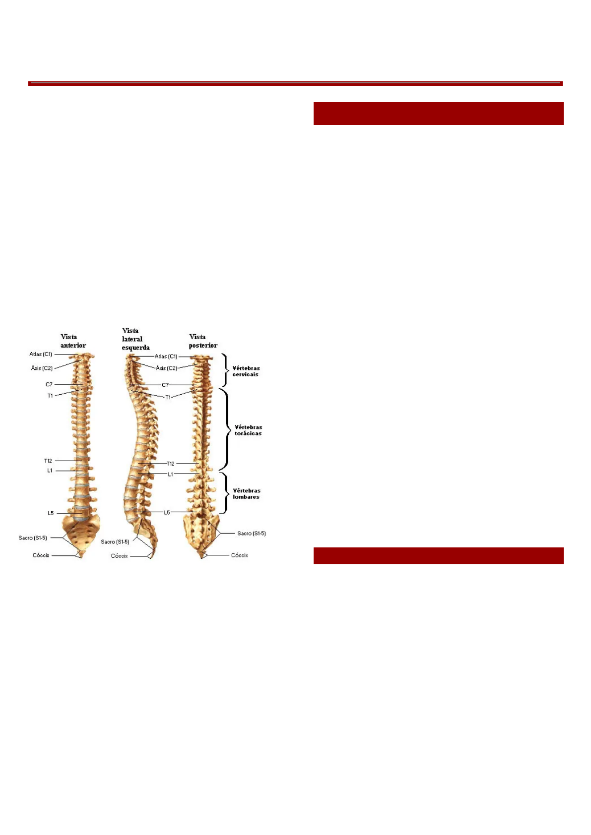 AESHA KARAJEH - XLV NEUROANATOMIA - COLUNA VERTEBRAL A coluna vertebral é o eixo de sustentação do corpo e tem função de proteger a medula espinhal, sustentar o peso corporal, permitir movimentos e servir de ponto de fixação para músculos e ligamentos. A coluna é formada por 33 vértebras (24 móveis e 9 fundidas), sendo dividas em: - Cervicais: 7 vértebras (C1-C7) - Torácicas: 12 vértebras (T1-T12) - Lombares: 5 vértebras (L1-L5) - Sacrais : 5 vértebras fundidas (S1-S5) - Coccígeas : 4 vértebras fundidas (Co1-Co4) ESTRUTURA GERAL DE UMA VÉRTEBRA - Corpo vertebral: parte anterior cilíndrica, maciça, que suporta o peso e dá forças à coluna. Seu tamanho aumenta à medida que desce na coluna vertebral. Os corpos adjacentes são separados por discos intervertebrais. - Arco vertebral: estrutura localizada posteriormente ao corpo e forma o forame vertebral. Possui: ○ 2 Pedículos: contém incisuras vertebrais (superiores e inferiores) e formam o forame intervertebral ○ 2 Lâminas: são extensões do arco vertebral que ao final se juntam para formar o processo espinhoso. - Processos: ○ Espinhoso (posterior) ○ Transversos (laterais) ○ Articulares (superiores e inferiores): contêm as faces articulares - Forame vertebral: aloja a medula espinhal. - Forames intervertebrais: passagem de nervos espinhais (entre duas vértebras). VÉRTEBRAS CERVICAIS - As duas primeiras vértebras cervicais (Atlas e Áxis) são atípicas, ou seja, não seguem os padrões das outras vértebras - No geral as vértebras cervicais possuem: ○ Corpo vertebral menor ○ Possuem forames transversos que dão passagem para a artéria vertebral (são as únicas vértebras que possuem, as vértebras T e L não tem forame transverso). ○ Processo espinhoso geralmente bífido. AESHA KARAJEH - XLV C1 – Atlas: - Sem corpo vertebral e nem processo espinhoso. - Formada por arcos anterior e posterior. - Suporta o crânio, se articula com os côndilos occipitais (articulação atlanto-occipital). C2 – Áxis: - Possui um corpo vertebral pequeno que projeta-se superiormente o dente do áxis. - Articula-se com o atlas (articulação atlanto-axial). VÉRTEBRAS TORÁCICAS - Articulam-se com as costelas, por isso apresentam fóveas costais (superior, inferior e transversa). - Forame vertebral menor e circular. - Processo espinhoso longo e inclinado inferiormente (oblíquo). VÉRTEBRAS LOMBARES - Maiores e mais robustas (suportam maior carga). - Corpo grande e reniforme. - Processos espinhosos curtos, largos e horizontais. - Forame vertebral triangular. AESHA KARAJEH - XLV SACRO - Vértebras fundidas formando um osso único. - Forma triangular. - Contém o hiato sacral (por onde passam estruturas nervosas). - Articula-se com os ílios (articulação sacroilíaca). - Os forames sacrais anteriores e posteriores são orifícios localizados na face anterior (pélvica) e posterior (dorsal) do osso sacro, que permitem a passagem de ramos dos nervos espinhais sacrais. CÓCCIX - Pequeno, vestigial. - Pode ser móvel ou fundido. - Importante como ponto de inserção ligamentar e muscular. LIGAMENTOS DA COLUNA VERTEBRAL - Ligamento longitudinal anterior: ○ Vai do occipital até o sacro, na face anterior dos corpos vertebrais. ○ Impede a hiperextensão da coluna. - Ligamento longitudinal posterior: ○ Dentro do canal vertebral, na face posterior dos corpos vertebrais. ○ Impede a hiperflexão. - Ligamento Amarelo (Lig. flavum) ○ Une as lâminas das vértebras adjacentes. ○ Rico em fibras elásticas (amarelado). ○ Ajuda a manter a postura ereta e fecha o canal vertebral posteriormente. AESHA KARAJEH - XLV - Ligamentos Interespinhosos e Supraespinhoso ○ Interespinhoso: entre os processos espinhosos. ○ Supraespinhoso: vai do processo espinhoso de uma vértebra ao da seguinte, formando uma linha contínua. ○ Limitam a flexão da coluna. - Ligamentos Intertransversários ○ Entre os processos transversos. ○ Limitam a flexão lateral. TETO DO CANAL VERTEBRAL - O canal vertebral é o espaço que se forma ao longo da coluna pela união dos forames vertebrais das vértebras empilhadas. Dentro dele passam a medula espinhal, as raízes nervosas e as meninges. - O teto do canal vertebral corresponde à porção mais posterior e desse canal. Estruturas que formam o teto: - Face interna das lâminas vertebrais, que fazem parte do arco posterior. - Ligamentos amarelos (lig. flava), que unem as lâminas de vértebras adjacentes e completam o fechamento do canal na parte posterior. Relevância clínica: - Alterações como espessamento dos ligamentos amarelos ou degeneração das lâminas podem comprimir o conteúdo do canal, causando estenose espinhal. - Cirurgias como laminectomias visam remover parte desse teto para descomprimir a medula ou raízes nervosas. FORAME INTERVERTEBRAL - O forame intervertebral (ou forame de conjugação) é o espaço formado entre duas vértebras adjacentes, por onde passam as raízes nervosas espinhais, vasos e outras estruturas. Limitado por: - Incisura vertebral inferior da vértebra acima. - Incisura vertebral superior da vértebra abaixo. - Face posterior do corpo vertebral e disco intervertebral (anterior). - Articulações zigapofisárias (facetas articulares) e cápsula articular (posterior). Conteúdo do forame intervertebral: - Raiz do nervo espinal (que logo se divide em ramos ventral e dorsal). - Ramos da artéria espinal. - Veias intervertebrais. - Gânglio espinal (raquidiano). ESTRUTURA GERAL DE UMA VÉRTEBRA C1 – Atlas: C2 – Áxis: VÉRTEBRAS LOMBARES SACRO CÓCCIX LIGAMENTOS DA COLUNA VERTEBRAL -Ligamento Amarelo (Lig. flavum) -Ligamentos Intertransversários TETO DO CANAL VERTEBRAL Estruturas que formam o teto: Relevância clínica: FORAME INTERVERTEBRAL Conteúdo do forame intervertebral: