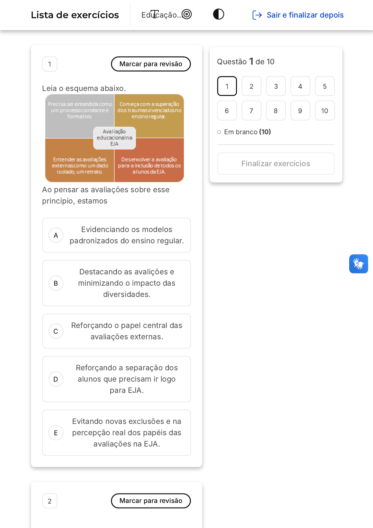A B C D E 1 Marcar para revisão Leia o esquema abaixo. Ao pensar as avaliações sobre esse princípio, estamos Evidenciando os modelos padronizados do ensino regular. Destacando as avalições e minimizando o impacto das diversidades. Reforçando o papel central das avaliações externas. Reforçando a separação dos alunos que precisam ir logo para EJA. Evitando novas exclusões e na percepção real dos papéis das avaliações na EJA. 2 Marcar para revisão Questão 1 de 10 Em branco (10) 1 2 3 4 5 6 7 8 9 10 Finalizar exercícios Lista de exercícios Educação… Sair e finalizar depois A B C D E Ao dizer que estamos reafirmando as identidades dos alunos na EJA, oportunizamos: Uma visão etnocêntrica. A procura de um padrão identitário. Uma inclusão efetiva dos alunos na educação formal. Uma separação necessária na educação formal. O reforço do corpo típico do aluno da EJA. 3 Marcar para revisão Ao pensarmos na ausência da Educação de Jovens e Adultos (EJA) na BNCC, avalie as asserções abaixo e identifique as possíveis relações entre elas. I - Essa exclusão não representa uma análise crítica dos fatores históricos que excluem milhares de jovens do ensino regular. porque II - Ao ignorar a EJA e seus processos de construção de uma educação popular, reforçamos o silenciamento das identidades e suas múltiplas relações com a educação. A B C D E As asserções I e II são proposições verdadeiras, a número II é uma justificativa correta da I. As asserções I e II não são proposições verdadeiras, a número II não é uma justificativa correta da I. As asserções I e II são proposições verdadeiras, a número II não é uma justificativa correta da I. As asserções I e II são proposições verdadeiras, a número I não possui relação com a número II. A número II é uma proposição falsa 4 Marcar para revisão Leia o trecho abaixo: A juventude constitui um momento determinado, mas não se reduz a uma passagem; ela assume uma importância em si mesma. Todo o processo é influenciado pelo meio social concreto no qual se desenvolve e pela qualidade das trocas que este proporciona. DAYRELL, Juarez. O jovem como sujeito social. Revista Brasileira de Educação, n. 24, Rio de Janeiro, set./dez. 2003. Com relação à presença do público jovem na EJA, é correto dizer: A B C D E A B A qualidade de trocas no ensino regular é limitada e não compreende a sua diversidade. Ocorreu uma inclusão de todos os alunos no ensino regular. Cada aluno é culpado por sua evasão. As diversidades atrapalham os alunos, por isso eles precisam ser nivelados e enquadrados. Todos são importantes, menos os jovens problemáticos. 5 Marcar para revisão Com relação à coletividade na EJA, avalie as afirmações a seguir: I. Podemos dizer que ela é reforçada pelo silenciamento da BNCC. II. A BNCC não compreende o papel reparador da EJA. III. A BNCC não faz uma leitura crítica dos processos de silenciamento da educação pelos pares no ensino regular. IV. O coletivo não é uma oportunidade de renovar a experiência educacional. Podemos dizer que as opções corretas são: II e III I e III C D E I e II II e IV I e IV 6 Marcar para revisão Leia o texto abaixo: Expressar-se, expressando o mundo, implica o comunicar-se. A partir da intersubjetividade originária, poderíamos dizer que a palavra, mais que instrumento, é origem da comunicação - a palavra é essencialmente diálogo. A palavra abre a consciência para o mundo comum das consciências, em diálogo portanto. Nessa linha de entendimento, a expressão do mundo consubstancia-se em elaboração do mundo e a comunicação em colaboração. E o homem só se expressa convenientemente quando colabora com todos na construção do mundo comum - só se humaniza no processo dialógico de humanização do mundo. A palavra, porque lugar do encontro e do reconhecimento das consciências, também o é do reencontro e do reconhecimento de si mesmo. A palavra pessoal, criadora, pois a palavra repetida é monólogo das consciências que perderam sua identidade, isoladas, imersas na multidão anônima e submissas a um destino que lhes é imposto e que não são capazes de superar, com a decisão de um projeto. FREIRE, Paulo - Pedagogia do Oprimido. São Paulo: Paz e Terra. A B C D E Podemos dizer que o texto acima trata: Dos alunos reprovados em nossas escolas. Do ensino regular. Das competências gerais da BNCC. Da BNCC que insere em seu texto a EJA. Do movimento de educação popular vivenciado nas salas de aula da EJA. 7 Marcar para revisão Leia o trecho da obra de Paulo Freire: "A libertação, por isto, é um parto. E um parto doloroso. O homem que nasce deste parto é um homem novo que só é viável na e pela superação da contradição opressores-oprimidos, que é a libertação de todos. A superação da contradição é o parto que traz ao mundo este homem novo não mais opressor; não mais oprimido, mas homem libertando- se." FREIRE, Paulo - Pedagogia do Oprimido. São Paulo: Paz e Terra. Avalie as asserções a seguir e suas relações partindo da leitura do texto. I. Na percepção da diversidade, esse novo sujeito consegue se libertar. Porque II. Precisa superar a estrutura de opressão que limita o reconhecimento A B C D E das subjetividades dos alunos da EJA. A respeito dessas asserções, marque a resposta correta. As asserções I e II são proposições verdadeiras, a número I não possui relação com a número II. A número II é uma proposição falsa, I e II são proposições verdadeiras e a II é uma justificativa correta. As asserções I e II não são proposições verdadeiras, a número II é uma justificativa correta da I. As asserções I e II são proposições verdadeiras, a número II não é uma justificativa correta da I. Não existem relações entre as asserções I e II. 8 Marcar para revisão Leia as afirmações que abordam a relação das novas tecnologias na sala de au