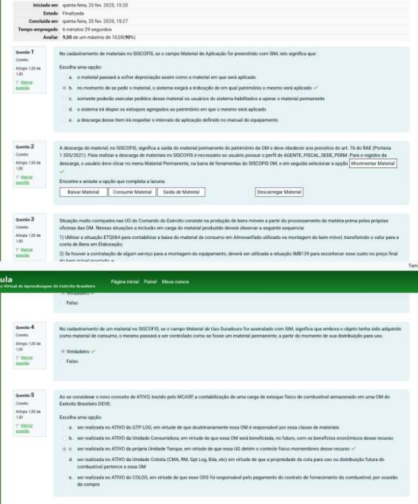 Iniciado 70 fev 15:20 Estado 20 15:27 Tempo empregado 6 29 de um de Question 1 No de no campo Material de for com SIM significa uma opção material depreciação como material em que aplicado b no momento de se pedir indicação de em qual mesmo aplicado poderão desse material sistema material permanente d sistema dispor estoques agregados em que mesmo a desse item de aplicação no manual de equipamento Question 2 A de no significa a do material permanente do DM deve do art. 75 de RAE Para realizar a descarga de materiais no SISCORS necessério possuir perfil de Para registro da deve no menu Material Permanente no de do SISCOFIS OM e em seguido Material a opção que completa a Material Consumir Material de Material Material 3 UG do Comando do consiste no produção de a partir do processamento de a inclusão em do deverá ETQ064 para contabilizar do material de consumo na montagem do bem transferindo valor para conta de em 2) Se de algum serviço para a montagem do a situação IMB139 preço final ula 4 No de material campo Material Uso for com SIM significa que objeto side adquirido como material de passará a ser como um material a do de para Falso 5 Ac as considerar de pelo a de uma carga de de em uma OM do Exército DEVE uma no ATIVO GTP LOG em virtude de que OM é responsável essa classe de materials D no ATIVO da Unidade em virtude de que DM no com beneficios ser realizada no ATIVO da Unidade em virtude de que essa UG desse d no ATIVO da Unidade (CMA Gpt etc) em virtude de que propriedade da cota uso ou distribuição futura pertence a OM no ATIVO do virtude de que pelo pagamento do contrato de do compra