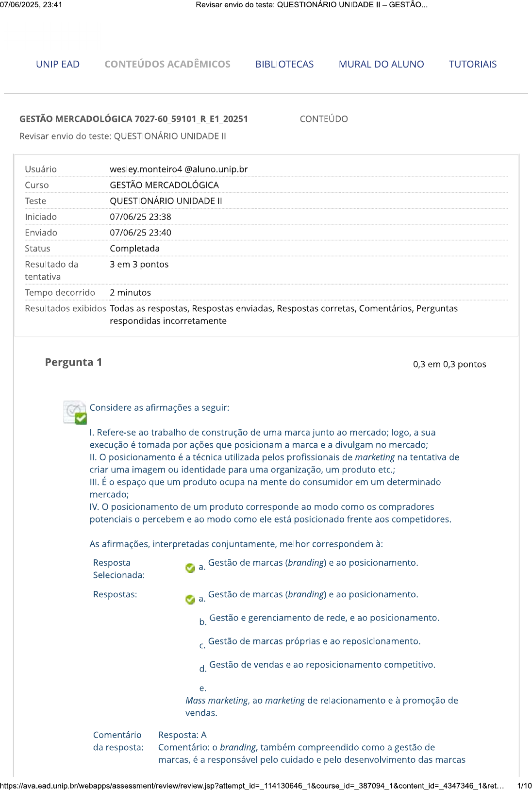 07/06/2025, 23:41 Revisar envio do teste: QUESTIONÁRIO UNIDADE - GESTÃO... UNIP EAD CONTEÚDOS ACADÊMICOS BIBLIOTECAS MURAL DO ALUNO TUTORIAIS GESTÃO MERCADOLÓGICA 7027-60_59101_R_E1_20251 CONTEÚDO Revisar envio do teste: QUESTIONÁRIO UNIDADE Usuário wesley.monteiro4@aluno.unip.br Curso GESTÃO MERCADOLÓGICA Teste QUESTIONÁRIO UNIDADE Iniciado 07/06/25 23:38 Enviado 07/06/25 23:40 Status Completada Resultado da 3 em 3 pontos tentativa Tempo decorrido 2 minutos Resultados exibidos Todas as respostas, Respostas enviadas, Respostas corretas, Comentários, Perguntas respondidas incorretamente Pergunta 1 0,3 em 0,3 pontos Considere as afirmações a seguir: I. Refere-se ao trabalho de construção de uma marca junto ao mercado; logo, a sua execução é tomada por ações que posicionam a marca e a divulgam no mercado; II. posicionamento é a técnica utilizada pelos profissionais de marketing na tentativa de criar uma imagem ou identidade para uma organização, um produto etc.; III. É o espaço que um produto ocupa na mente do consumidor em um determinado mercado; IV. posicionamento de um produto corresponde ao modo como os compradores potenciais o percebem e ao modo como ele está posicionado frente aos competidores. As afirmações, interpretadas conjuntamente, melhor correspondem à: Resposta a. Gestão de marcas (branding) e ao posicionamento. Selecionada: Respostas: a. Gestão de marcas (branding) e ao posicionamento. b. Gestão e gerenciamento de rede, e ao posicionamento. C. Gestão de marcas próprias e ao reposicionamento. d. Gestão de vendas e ao reposicionamento competitivo. e. Mass marketing, ao marketing de relacionamento e à promoção de vendas. Comentário Resposta: A da resposta: Comentário: o branding, também compreendido como a gestão de marcas, é a responsável pelo cuidado e pelo desenvolvimento das marcas 1/1007/06/2025, 23:41 Revisar envio do teste: QUESTIONÁRIO UNIDADE GESTÃO... em quaisquer mercados (locais ou global) e, as afirmações propostas, complementam-se na medida em que abordam a construção da marca, o posicionamento da marca e a criação de uma imagem forte; marca é o espaço que se ocupa na mente do cliente (...). Pergunta 2 0,3 em 0,3 pontos Das alternativas a seguir, qual delas não corresponde a um conhecimento e à atenção relativos ao processo de precificação dos produtos em marketing? Resposta e. Selecionada: A estratégia de precificação deve considerar, basicamente, as condições relativas aos custos de produção da empresa e o tamanho de seu interesse de retorno. Em outros termos, grosso modo, se a soma de todos os gastos, e custos de produção e de impostos é igual a 10, e o lucro desejado é de 30%, nenhum produto poderá ser vendido por menos do que 13, mesmo que os concorrentes estejam vendendo por 11. Respostas: a. Para aumentar a receita a empresa precisa assumir o caminho do aumento de preço ou do aumento do volume de produtos vendidos; raramente, é possível fazer as duas coisas ao mesmo tempo, tampouco é fácil fazer qualquer uma delas, pois existem implicações que podem culminar em clientes mais resistentes ao ato de comprar. b. Embora a precificação seja, mercadologicamente, uma das variáveis mais fáceis de executar (e de mudar), a decisão de precificar e de reprecificar (alteração de preço) deve ser tomada, apenas, mediante às informações contendentes e a uma profunda análise das mesmas, pois, pode levar (acidentalmente) à uma redução de vendas. C. Em termos competitivos as empresas têm muito trabalho para descobrir e antecipar as estratégias e as táticas de precificação das empresas rivais, mesmo assim, elas devem sempre tentar antecipar-se aos movimentos competitivos dos concorrentes, pois, estratégias de preços, praticados por terceiros, e com forte embasamento na redução de preços, pode, mesmo que por um curto período de tempo, atrair muitos compradores. d. processo de precificação deve estar atento às condições do mercado- alvo, ou seja, os preços na medida do possível não podem perder de vista a capacidade de pagamento em uma dada região, país etc., pois, os preços muito acima da capacidade de pagamento remetem aos estoques elevados e aos prejuízos; por sua vez, os preços muitos abaixo da expectativa dos clientes podem gerar problemas como a falta de produtos para as vendas e a entrega, a desvalorização marginal da marca, dentre outros.07/06/2025. 23:41 Revisar envio do teste: QUESTIONÁRIO UNIDADE GESTÃO... e. A estratégia de precificação deve considerar, basicamente, as condições relativas aos custos de produção da empresa e o tamanho de seu interesse de retorno. Em outros termos, grosso modo, se a soma de todos os gastos, e custos de produção e de impostos é igual a 10, e o lucro desejado é de 30%, nenhum produto poderá ser vendido por menos do que 13, mesmo que os concorrentes estejam vendendo por 11. Comentário Resposta: E da resposta: Comentário: naturalmente, os custos relativos à produção, bem como quaisquer outras demandas financeiras (especialmente, relativas aos impostos) devam pesar na balança da precificação, a fixação de margem de lucro e resposta ao preço de venda (mediante à concorrência) geralmente, não é vista como rígida a ponto de não permitir os ajustes; esse erro, poderia, por exemplo, levar a forte redução de encomendas de produtos da empresa que venda mais caro em detrimento dos interesses dos clientes intermediários que buscam os menores preços (para eles, menores custos) e passam a comprar do fornecedor que oferecer o menor preço final. Pergunta 3 0,3 em 0,3 pontos Sobre o lançamento de novos produtos, considere as afirmações: Existem diversos meios de classificar novos produtos, por exemplo: inovações contínuas (as mudanças ocorrem em produtos existentes; podem ser vistas com a evolução de um produto existente) ou inovações descontínuas (os produtos são completamente novos, n