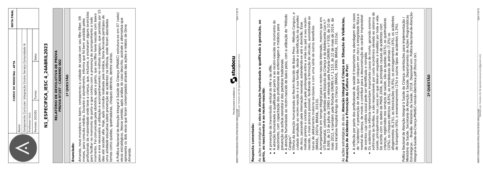 NOTA FINAL CURSO DE MEDICINA AFYA A Aluno: Componente Curricular: Integração Ensino Serviço Comunidade IV Professor (es): Período: 202301 Turma: Data: RELATÓRIO DE DEVOLUTIVA DE PROVA PROVA 07197 - CADERNO 002 QUESTÃO Enunciado: Amanda nova moradora no bairro, compareceu a unidade de saúde com seu filho Elber, 09 meses, para consulta médica. Durante o atendimento, informa que foi bem assistida pelos profissionais da maternidade onde teve a criança, que, inclusive, a ensinaram alguns exercícios para facilitar no momento do parto e que contou com a presença do acompanhante a todo momento. Foi comunicada pela obstetra, após o parto, que seu filho havia nascido com baixo peso e era necessário a utilização e acompanhamento no método canguru, que persistiu por 15 dias até receber alta. Hoje, após consulta realizada pela médica, Dona Amanda participou de uma atividade educativa sobre prevenção de acidentes na infância, onde foram abordados temas como quedas, queimaduras, choques elétricos, dentre outras. A Política Nacional de Atenção Integral à Saúde da Criança (PNAISC) estrutura-se em 07 (sete) eixos estratégicos. Nesse sentido, após análise do caso descrito, assinale a alternativa que apresenta os dois eixos que foram contemplados através das ações e relatos de Dona Amanda. This document available on studocu Baixado por Gustavo de com) Resposta comentada: As ações estratégicas do eixo de atenção humanizada e qualificada à gestação, ao parto, ao nascimento e ao A prevenção da transmissão vertical do HIV e da sífilis. A atenção humanizada e qualificada ao parto e ao recém-nascido no momento do com capacitação dos profissionais de enfermagem e médicos para prevenção da asfixia neonatal e das parteiras tradicionais. A atenção humanizada ao recém-nascido de baixo peso, com a utilização do "Método Canguru". Oferta da Atenção Humanizada ao Recém-Nascido de Baixo Peso Método Canguru, e cuidado ampliado ao recém-nascido e à sua família, desde a identificação da gravidez de risco, passando pela internação neonatal, estendendo-se até o domicílio. Esse método prioriza o contato pele a pele prolongado entre a mãe (ou pai) e seu recém- nascido, o mais precoce possível, facilitando a formação de vínculos, aumentando as taxas de aleitamento materno exclusivo e com uma série de outros benefícios 2007a; BRASIL, 2013i). Acompanhante em tempo integral para o recém-nascido internado, mesmo que em UTI Neonatal, conforme definido pelo Estatuto da Criança e do Adolescente (Lei 8.069, de 13 de julho de 1990) e reiterado pela Portaria GM/MS 930, de 10 de maio 2012, e também pela Portaria GM/MS 1.153, de 22 de maio de 2014, da nova Iniciativa Hospital Amigo da Criança (BRASIL, 1990b: BRASIL, 2012a). As ações estratégicas do eixo: Atenção Integral à Criança em Situação de Violências, Prevenção de Acidentes e Promoção da Cultura de Paz: A reflexão por parte dos profissionais de saúde é importante na abordagem dos casos de "acidentes" e prevenção de situações que coloquem em risco a integridade física e mental da criança, de modo a contribuir para a desconstrução do caráter imprevisível de eventos cuja cadeia causal pode ser identificada e rompida Os acidentes na infância representam importante causa de morte, gerando enorme sofrimento às famílias, e são responsáveis por custo econômico elevado ao sistema de saúde, principalmente nos casos em que deixam e invalidez por toda a vida. De acordo com os dados da PNDS 2006, as principais causas de acidentes com crianças, registrados nos serviços de saúde, são as quedas (81%), as queimaduras (10%), os choques elétricos (8,6%), as mordeduras de animais (7,6%) os afogamentos (6,1%), as intoxicações (4,9%), os esmagamentos (4%), os acidentes de transporte (4%), o envenenamento (1%) e outros tipos de acidentes (1,3%). Política Nacional de Atenção Integral à Saúde da Criança: orientações para implementação / Ministério da Saúde. Secretaria de Atenção à Saúde. Departamento de Ações Programáticas Estratégicas. Brasília: Ministério da Saúde, 2018. Disponível em: (fiocruz.br). QUESTÃOEnunciado: Uma menina de 2anos, procedente da região sudoeste da Bahia, é atendida na Unidade Básica de Saúde com queixa de tosse e febre há 2 dias. Na história pregressa, há relato de internações prévias por vários episódios de bronquite e pneumonia. Ao exame físico, observa-se que seu peso está abaixo do percentil para sua estatura que, por sua vez, está abaixo do percentil 3 para sua idade. Realizada ausculta, criança com chiado encaminhada para a sala de procedimento para nebulização. A menina apresenta dermatite de fralda de repetição. Ao verificar a caderneta da criança consta vacinas em atraso. Mãe resistente a vacinação. Somente consta a BCG e hepatite B. Orientada a mãe em relação aos cuidados higiênicos do domicílio e da criança, bem como a importância da atualização das vacinas. Ao terminar a consulta a criança foi direcionada para a sala de vacina. Considerando o caso supracitado quais foram os eixos estratégicos da Política Nacional de Atenção Integral à Saúde da Criança (PNAISC), contemplados no atendimento: I. Aleitamento materno e alimentação complementar II. Promoção e Acompanhamento do Crescimento e Desenvolvimento III. Atenção Integral a Crianças com Agravos Prevalentes na Infância e com Doenças Crônicas IV. Atenção Integral à Criança em situação de Violências, Prevenção de Acidentes e Promoção da Cultura de Paz. V. vigilância e prevenção do óbito infantil, fetal e materno. Marque a alternativa correta: Resposta comentada: Promoção e Acompanhamento do Crescimento e Desenvolvimento- No exame físico foi identificado a qualificação do acompanhamento do crescimento e desenvolvimento da primeira infância pela Atenção Básica à Saúde. o acompanhamento sistemático do cr
