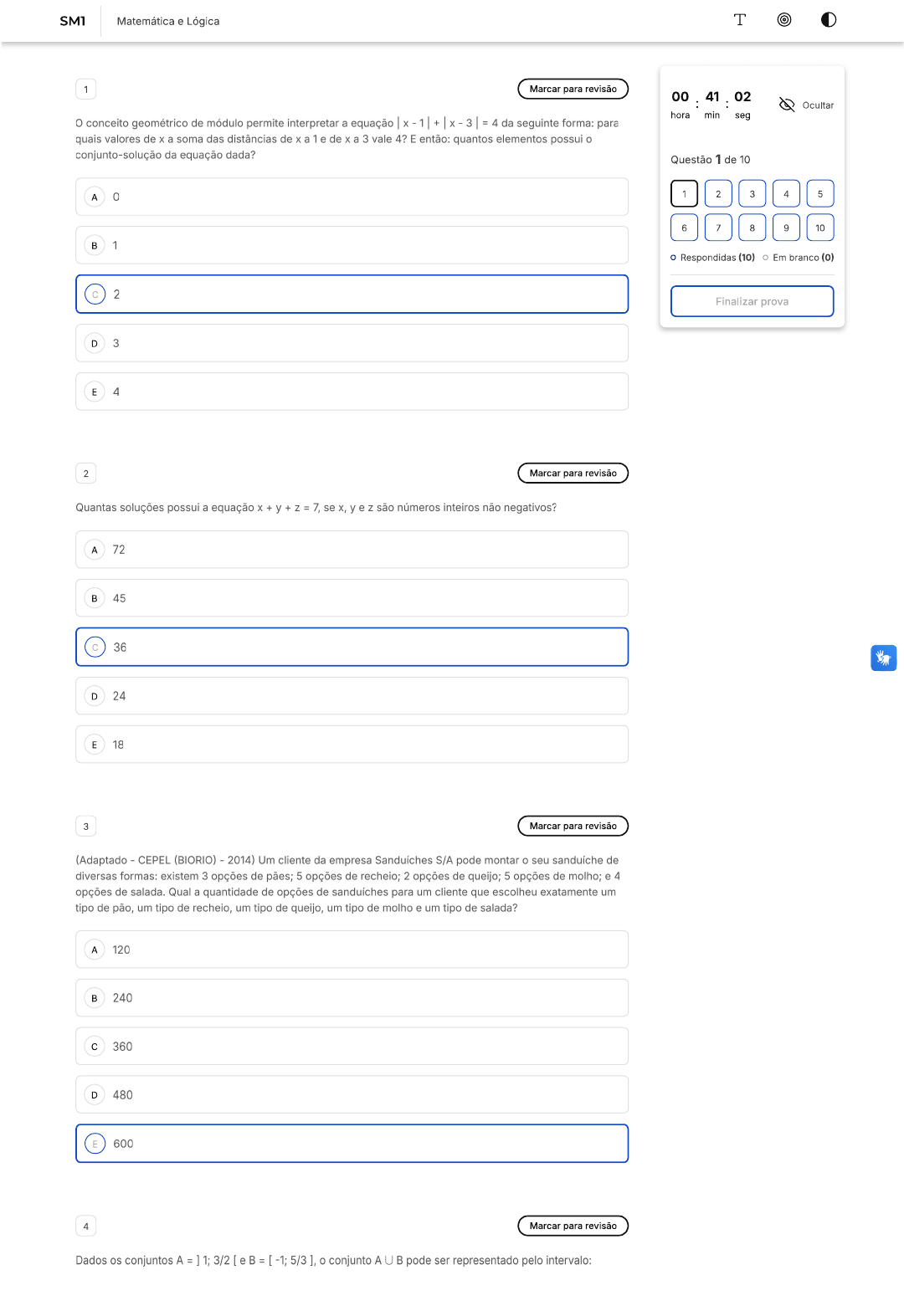 Matemática e Lógica T D 1 Marcar para revisão 00 41 02 : : Ocultar hora min seg o conceito geométrico de módulo permite interpretar a equação X 1 + X 3 = 4 da seguinte forma: para quais valores de X a soma das distâncias de X a 1 e de X a 3 vale 4? E então: quantos elementos possui o conjunto-solução da equação dada? Questão 1 de 10 A 0 1 2 3 4 5 6 7 8 9 10 B 1 Respondidas (10) Em branco (0) C 2 Finalizar prova D 3 E 4 2 Marcar para revisão Quantas soluções possui a e Z são números inteiros não negativos? A 72 B 45 C 36 D 24 E 18 3 Marcar para revisão (Adaptado - CEPEL (BIORIO) - 2014) Um cliente da empresa S/A pode montar o seu sanduíche de diversas formas: existem 3 opções de pães; 5 opções de recheio; 2 opções de queijo; 5 opções de molho; e 4 opções de salada. Qual a quantidade de opções de sanduíches para um cliente que escolheu exatamente um tipo de pão, um tipo de recheio, um tipo de queijo, um tipo de molho e um tipo de salada? A 120 B 240 C 360 D 480 E 600 4 Marcar para revisão Dados os conjunto A U B pode ser representado pelo intervalo:B C 3/2 [ D E 5 Marcar para revisão No gráfico a seguir tem-se o número de vagas fechadas a cada mês na indústria paulista, no ano de 1998. A partir desse gráfico, conclui-se corretamente que, em relação à indústria paulista no ano de 1998: 30000 25000 20000 15000 10000 5000 0 jan mar mai jul set nov (Fonte: FIESP) A Em dezembro havia menos desempregados que em janeiro. B Durante o primeiro trimestre, a taxa de desemprego diminuiu. No primeiro semestre, foram fechadas mais de 62.000 vagas. D No terceiro trimestre, diminuiu o número de desempregados. E o número de vagas fechadas no segundo semestre foi menor que 45.000. 6 Marcar para revisão Traçando dois eixos, OX ao qual chamaremos eixo das abscissas e OY que chamaremos eixo das ordenadas, de forma que ambos se interceptem perpendicularmente em O, o plano sobre o qual construímos esses eixos fica dividido em quatro quadrantes: y 2° quadrante 1° quadrante (+,+) 3° quadrante quadrante Considere as sentenças: J. (-1, 4) \(\in\) 3° quadrante K. (2, 0) \(\in\) ao eixo y L. (-3, -2) \(\in\) 3° quadrante Assinale a alternativa correta: A (I);(J);(K) São falsas e (L) é verdadeira. B São falsas C São falsas e e (L);( (J) são verdadeiras.D (I);(J);(K);(L) são verdadeiras. E São falsas e e (L);(K) são verdadeiras. 7 Marcar para revisão No gráfico a seguir, temos o nível da água armazenada em uma barragem, ao longo de três anos. nível (m) 100 90 80 10 tempo nível de 40m foi atingido quantas vezes neste período? A 1 B 2 3 D 4 E 5 8 Marcar para revisão (EsPCEx, 2015) Assinale a alternativa que representa o conjunto de todos os números reais para os quais está definida a função A B 9 Marcar para revisão Uma parte crucial na compreensão das funções é a identificação e compreensão do domínio, que representa quais valores de entrada são válidos para a função. Considere a função Qual das seguintes alternativas representa corretamente o domínio dessa função? A R B R {2}.C D 2). E [-2,2]. 10 Marcar para revisão -x 1,sex R definida por f(x) = +1,se-1