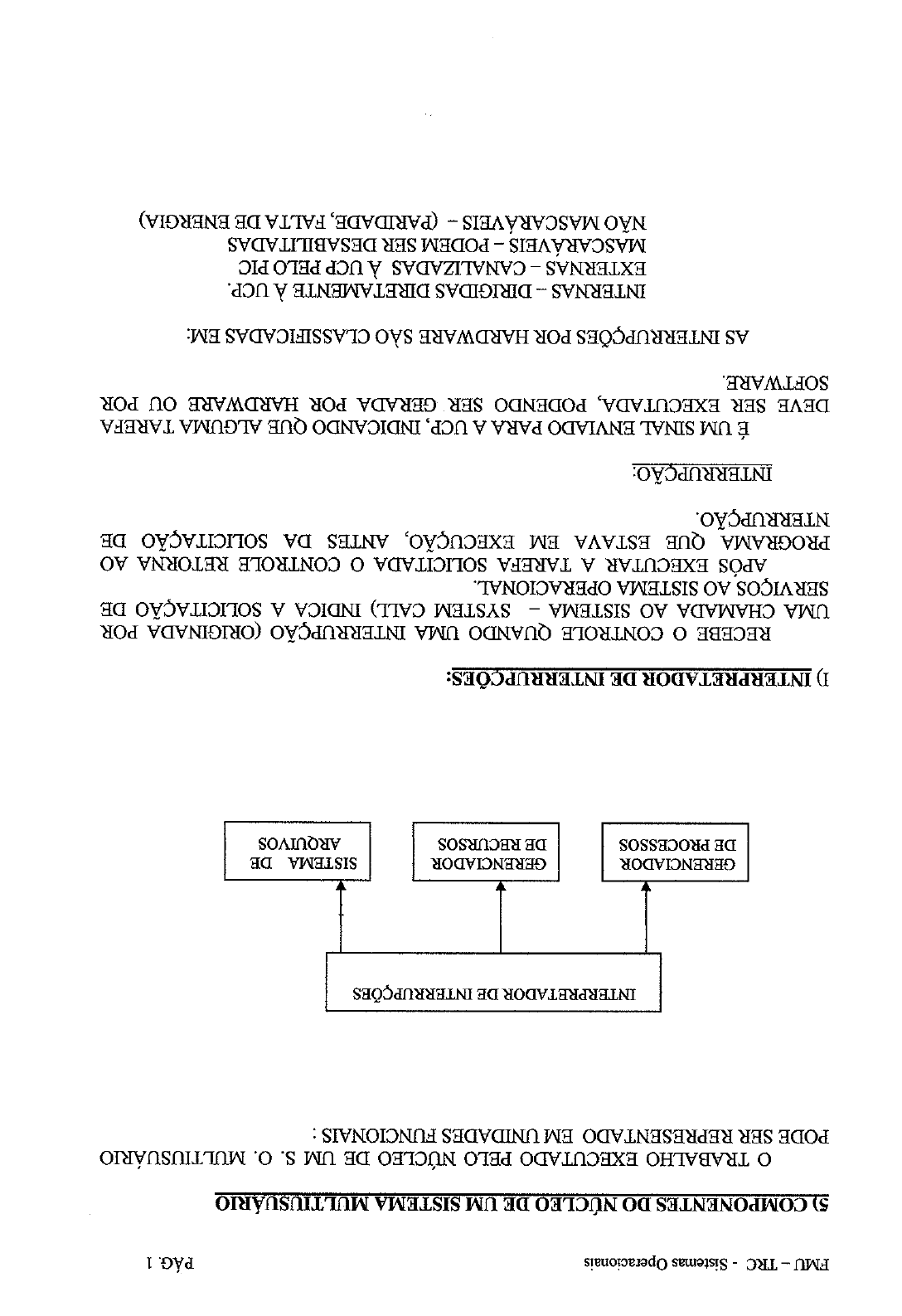 FMU - TRC - Sistemas Operacionais 1 5) COMPONENTES DO NÚCLEO DE UM SISTEMA MULTIUSUÁRIO TRABALHO EXECUTADO PELO NÚCLEO DE UM S. O. MULTIUSUÁRIO PODE SER REPRESENTADO EM UNIDADES FUNCIONAIS : INTERPRETADOR DE INTERRUPÇÕES GERENCIADOR GERENCIADOR SISTEMA DE DE PROCESSOS DE RECURSOS ARQUIVOS I) INTERPRETADOR DE RECEBE O CONTROLE QUANDO UMA INTERRUPÇÃO (ORIGINADA POR UMA CHAMADA AO SISTEMA - SYSTEM CALL) INDICA A SOLICITAÇÃO DE SERVIÇOS AO SISTEMA OPERACIONAL. APÓS EXECUTAR A TAREFA SOLICITADA O CONTROLE RETORNA AO PROGRAMA QUE ESTAVA EM EXECUÇÃO, ANTES DA SOLICITAÇÃO DE INTERRUPÇÃO: É UM SINAL ENVIADO PARA A UCP, INDICANDO QUE ALGUMA TAREFA DEVE SER EXECUTADA, PODENDO SER GERADA POR HARDWARE OU POR AS INTERRUPÇÕES POR HARDWARE SÃO CLASSIFICADAS EM: INTERNAS - DIRIGIDAS DIRETAMENTE À UCP. EXTERNAS - CANALIZADAS À UCP PELO PIC MASCARÁVEIS - PODEM SER DESABILITADAS NÃO MASCARÁVEIS - (PARIDADE, FALTA DE ENERGIA)FMU - TRC - Sistemas Operacionais 2 AS INTERRUPÇÕES POR SOFTWARE (TRAPS) ESTÃO CONTIDAS NO CÓDIGO DO PROGRAMA QUE AS GERA. EX.: INT 21 (DOS/WIN) A ROTINA (MANIPULADOR DE INTERRUPÇÃO - INTERRUPT HANDLER) A SER ATIVADA É IDENTIFICADA A PARTIR DO NÚMERO DA INTERRUPÇÃO, QUE NOS PCs SÃO NUMERADAS DE 00h A FFh (256 INTERRUPÇÕES). NA MAIORIA DOS SISTEMAS MODERNOS, O DESVIO PARA A ROTINA MANIPULADORA DA INTERRUPÇÃO É FEITO A PARTIR DE UMA TABELA DE VETORES DE INTERRUPÇÕES QUE CONTÉM O ENDEREÇO LÓGICO DE MEMÓRIA ONDE SE ENCONTRA O MANIPULADOR. NESSE CASO, O NÚMERO DA SERVE COMO ÍNDICE PARA LOCALIZAR A ENTRADA DA TABELA QUE CONTÉM O ENDEREÇO DO MANIPULADOR. os MANIPULADORES DE INTERRUPÇÕES SÃO ROTINAS RESIDENTES NA ROM (BIOS), NO SISTEMA OPERACIONAL, OU ROTINAS DESENVOLVIDAS PELOS USUÁRIOS. APLICATIVO SISTEMA OPERACIONAL BIOS HARDWAREFMU TRC - Sistemas Operacionais 3 II) GERENCIADOR DE PROCESSOS: É TAREFA CENTRAL DO SISTEMA OPERACIONAL, QUE CONSISTE BASICAMENTE NA CRIAÇÃO, CONTROLE, COMUNICAÇÃO E ESCALONAMENTO DE PROCESSOS (TAREFAS). O É ALOCADO PELO ESCALONADOR DE PROCESSOS, QUE PROPICIA A UTILIZAÇÃO DINÂMICA DO PROCESSADOR POR DIVERSOS PROCESSOS. 1) PROCESSO: UM PROCESSO REPRESENTA A SITUAÇÃO DE UMA ATIVIDADE A SER EXECUTADA PELO COMPUTADOR, SENDO GERADO PELA SUBMISSÃO DE UM PROGRAMA PARA EXECUÇÃO OU POR UM COMANDO EMITIDO POR UM USUÁRIO. DE FORMA MAIS ABRANGENTE UM PROCESSO É A ESTRUTURA RESPONSÁVEL PELA MANUTENÇÃO DAS INFORMAÇÕES NECESSÁRIAS PARA AEXECUÇÃO DE UM PROCGRAMA, COMO CONTEÚDO DOS REGISTRADORES, ARQUIVOS EM USO, ETC. 2) BLOCO DE CONTROLE DE PROCESSO: AS IFORMAÇÕES NECESSÁRIAS PARA A EXECUÇÃO DE UM PROGRAMA SÃO MANTIDAS EM UMA ESTRUTURA CHAMADA "BLOCO DE CONTROLE DO PROCESSO" (PCB PROCESS CONTROL BLOCK), COMO: ESTADO DO PROCESSO IDENTIFICAÇÃO DO PROCESSO PRIORIDADE DO PROCESSO REGISTRADORES LIMITES DE MEMÓRIA ARQUIVOS ABERTOS E POSIÇÃO NO ARQUIVO O PROCESSO PODE SER DIVIDIDO EM TRÊS ELEMENTOS BÁSICOS: CONTEXTO DE HARDWARE CONTEXTO DE SOFTWARE ESPAÇO DE ENDEREÇAMENTO. A) CONTEXTO DE CONSISTE BASICAMENTE DO CONTEÚDO DOS REGISTRADORES QUE POSICIONAM O PROGRAMA NA MEMÓRIA NO MOMENTO EM QUE UM PROCESSO ESTÁ EM EXECUÇÃO, SEU CONTEXTO DE HARDWARE ESTÁFMU - TRC - Sistemas Operacionais PÁG. 4 ARMAZENADO NOS REGISTRADORES DA CPU. QUANDO O PROCESSO PERDE O CONTROLE DA CPU O SISTEMA SALVA SUAS INFORMAÇÕES NO CONTEXTO DE HARDWARE, QUE É RESTAURADO QUANDO O PROCESSO RETOMA CONTROLE DA CPU. A TROCA DE UM PROCESSO POR OUTRO PARA USAR A CPU CHAMA-SE "MUDANÇA DE CONTEXTO". Sistema Operacional PROCESSO A PROCESSO B EXEC SALVA REG. DO PROCESSO A CARREGA REG. DO PROCESSO B EXEC SALVA REG. DO PROCESSO B CARREGA REG. DO PROCESSO A EXECFMU TRC Sistemas Operacionais PÁG. 5 B) CONTEXTO DE SOFTWARE: ESPECIFICA CARACTERÍSTICAS DO PROCESSO, QUE INFLUENCIAM A EXECUÇÃO DO PROGRAMA, COMO POR EXEMPLO, O NÚMERO MÁXIMO DE ARQUIVOS ABERTOS, O TAMANHO DO BUFFER PARA OPERAÇÕES DE E/S. O CONTEXTO DE SOFTWARE DEFINE BASICAMENTE TRÊS GRUPOS DE INFORMAÇÕES SOBRE O PROCESSO: IDENTIFICAÇÃO, QUOTAS E PRIVILÉGIOS. IDENTIFICAÇÃO: CADA PROCESSO CRIADO RECEBE UMA IDENTIFICAÇÃO ÚNICA PID (PROCESS IDENTIFICATION), GERALMENTE UM NÚMERO QUE É UTILIZADO PARA REFERENCIAR O PROCESSO MUDAR CARACTERÍSTICAS, ETC). ALÉM DO PID O PROCESSO POSSUI TAMBÉM A IDENTIFICAÇÃO DO USUÁRIO (UID USER IDENTIFICATION) OU PROCESSO QUE O CRIOU (OWNER). QUOTAS: REPRESENTAM LIMITES DE CADA RECURSO DO SISTEMA QUE UM PROCESSO PODE ALOCAR. CASO UMA QUOTA SEJA INSUFICIENTE O PROCESSO PODE SEREXECUTADO MAIS LENTAMENTE OU MESMO NÃO SER EXECUTADO. GERALEMTNE AS QUOTAS REFEREM-SE A: NÚMERO MÁXIMO DE ARQIUVOS ABERTOS. MAXIMO DE MEMÓRIA ALOCADA NUMERO MAXIMO DE OPERAÇÕES DE E/S NÚMERO MAXIMO DE PROCESSOS PARA CRIAR PRIVILÉGIOS: DEFINE O QUE O PROCESSO PODE OU NÃO FAZER EM RELAÇÃO AO SISTEMA E A OUTROS PROCESSOS. EXISTEM, POR EXEMPLO, PRIVILÉGIOS ASSOCIADOS À SEGURANÇA QUE PERMITEM A UM USUÁRIO ELIMINAR PROCESSOS DE OUTROS USUÁRIOS E ACESSAR ARQUIVOS QUE NÃO LHE PERTENCEM C) ESPAÇO DE É A ÁREA DE MEMÓRIA DO PROCESSO, ONDE O PROGRAMA SERÁ EXECUTADO E A ÁREA DE DADOS UTILIZADOS, QUE DEVEM SER PROTEGIDAS DOS DEMAIS PROCESSOS.FMU - TRC - Sistemas Operacionais 6 3) ESCALONAMENTO DE PROCESSOS O ESCALONAMENTO DE UM PROCESSO PARA EXECUÇÃO (ASSUMIR O CONTROLE DA CPU), REQUER QUE ELE ESTEJA PRONTO PARA SER EXECUTADO, DEVENDO SER MONITORADO QUANDO SAI DAS MÃOS DO USUÁRIO, INGRESSA NO SISTEMA E ASSUME VÁRIOS ESTADOS DURANTE SUA 3.1) ESQUEMA DOS completado suspenso pronto executando suspenso espera Na figura acima, os retângulos representam os possíveis estados de um processo e as setas representam as mudanças de estado. 3.2) os ESTADOS: A) SUSPENSO: SIGNIFICA QUE O PROCESSO JÁ FOI SUBMETIDO PORÉM O SISTEMA AINDA NÃO PERMITE QUE SEJA EXECUTADO. OCORRE QUANDO, P.EX., O USUÁRIO SUBMETE O PROCESSO COM INSTRUÇÕES PARA QUE SEJA EXECUTADO MAIS TARDE. B) PRONTO: INDICA QUE O PROCESSO ESTÁ PRONTO PARA SER EXECUTADO. O PROCE