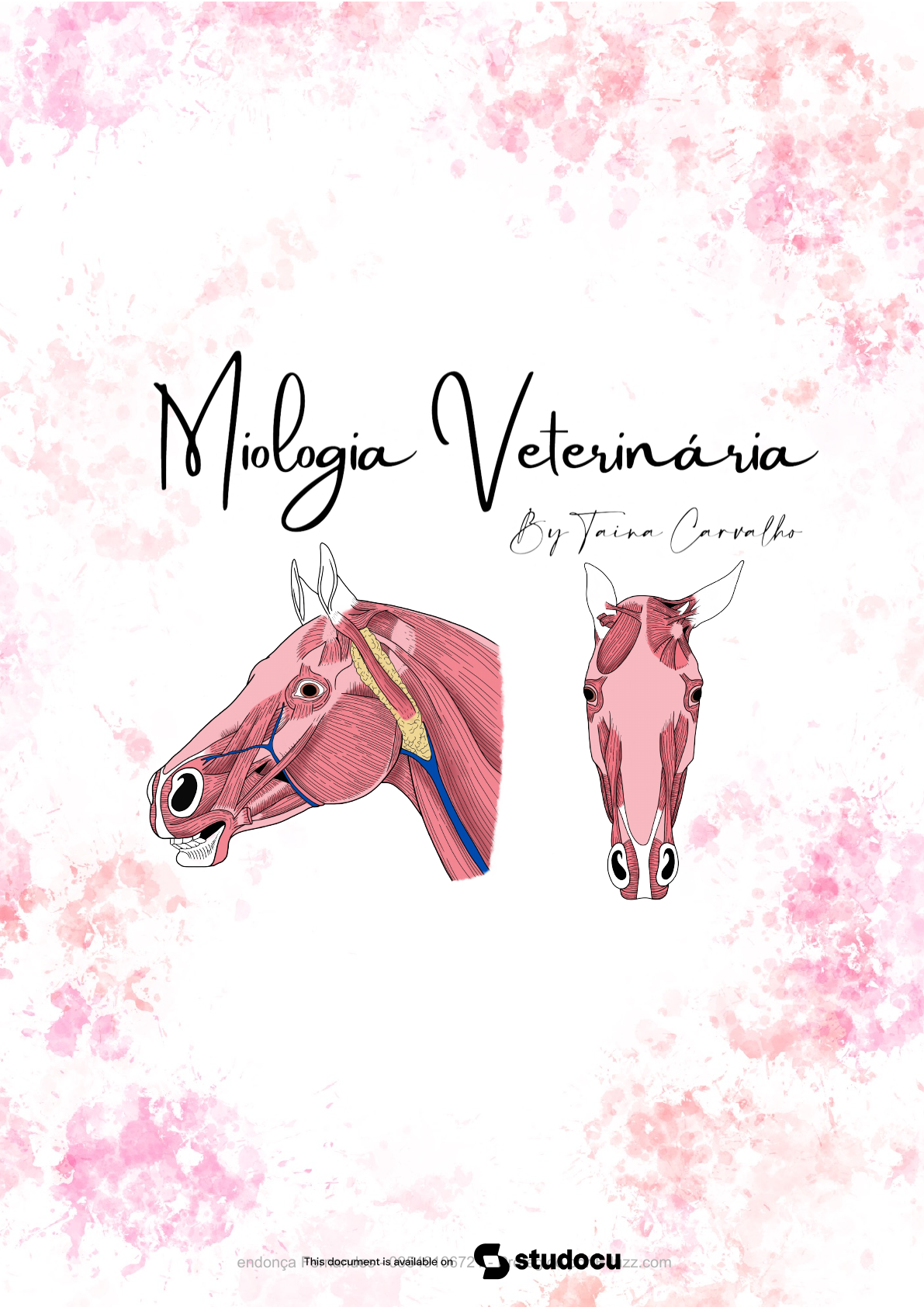 By Tainá Carvalho @medvet.cdm Licenciado para - Carolina Mendonça Fernandes - 09549106721 - Protegido por Eduzz.com Downloaded by Jéssica Amanda (ichibinoshukaku@hotmail.com) lOMoARcPSD|53028469 https://www.studocu.com/pt-br?utm_campaign=shared-document&utm_source=studocu-document&utm_medium=social_sharing&utm_content=apostila-miologia-veterinaria Sumário 1. Introdução ...............................................................................................1 2. Miologia Geral .........................................................................................2 1.1 Canino ..............................................................................................2 1.2 Felino ................................................................................................3 1.3 Equino ..............................................................................................4 1.4 Bovino ..............................................................................................5 1.5 Suíno ................................................................................................6 2. Cabeça.....................................................................................................7 2.1 Canino ..............................................................................................7 2.2 Equino ..............................................................................................9 3. Pescoço .................................................................................................13 3.1 Canino ............................................................................................13 3.2 Equino ............................................................................................15 4. Abdômen................................................................................................17 5. Membro Torácico ...................................................................................21 5.1 Miologia Comparada........................................................................21 5.2 Canino ............................................................................................23 5.3 Equino ............................................................................................25 6. Membro Pélvico......................................................................................27 6.1 Miologia Comparada........................................................................27 6.2 Canino ............................................................................................30 6.3 Equino ............................................................................................34 8. Tabela Músculo, inervação, origem, inserção e função............................38 9. Exercícios ...............................................................................................58 10. Respostas .............................................................................................67 By Tainá Carvalho @medvet.cdm Licenciado para - Carolina Mendonça Fernandes - 09549106721 - Protegido por Eduzz.com Downloaded by Jéssica Amanda (ichibinoshukaku@hotmail.com) lOMoARcPSD|53028469 Miologia (Estudo dos músculos) Os músculos são órgãos constituídos por tecido muscular e derivam do folheto embrionário Mesoderme. São capazes de se contrair e de se relaxar, gerando movimentos que permitem os animais de andar, correr, saltar, nadar, urinar, defecar, piscar os olhos, respirar… Existem 3 tipos de tecidos muscular: ✰ Tecido muscular liso ✰ Tecido muscular estriado cardíaco ✰ Tecido muscular estriado esquelético TECIDO MUSCULAR LISO - Apresenta miócitos fusiformes, mononucleados e sem estriações transversais. - É encontrado na parede de vasos sanguíneos e órgãos ocos (estômago, bexiga, intestino, útero, ureteres, baço). - É responsável por contrações involuntárias, lentas e rítmicas como, por exemplo, piloereção e movimentos peristálticos. TECIDO MUSCULAR ESTRIADO CARDÍACO - Apresenta miócitos alongados, estriados transversalmente e com ramificações. - Podem apresentar um ou dois núcleos centrais e é o tecido presente no coração. - Responsável por contrações rápidas e involuntárias e sua ação é comandada por impulsos elétricos gerados no próprio coração. TECIDO MUSCULAR ESTRIADO ESQUELÉTICO - Apresenta miócitos estriados transversalmente, cilíndricos, longos, com nucleação múltipla periférica. - Ao menos uma de suas extremidades é fixada ao esqueleto, tendo a isso a associação com o nome. - A contração é rápida e voluntária. Esse tipo de tecido corresponde a aproximadamente 40% do peso corporal dos animais. https://brasilescola.uol.com.br/biologia/tecido-muscular.htm By Tainá Carvalho @medvet.cdm 1Licenciado para - Carolina Mendonça Fernandes - 09549106721 - Protegido por Eduzz.com Downloaded by Jéssica Amanda (ichibinoshukaku@hotmail.com) lOMoARcPSD|53028469 https://www.studocu.com/pt-br?utm_campaign=shared-document&utm_source=studocu-document&utm_medium=social_sharing&utm_content=apostila-miologia-veterinaria Miologia do Cão By Tainá Carvalho @medvet.cdm 2Licenciado para - Carolina Mendonça Fernandes - 09549106721 - Protegido por Eduzz.com Downloaded by Jéssica Amanda (ichibinoshukaku@hotmail.com) lOMoARcPSD|53028469 Miologia do Gato By Tainá Carvalho @medvet.cdm 3Licenciado para - Carolina Mendonça Fernandes - 09549106721 - Protegido por Eduzz.com Downloaded by Jéssica Amanda (ichibinoshukaku@hotmail.com) lOMoARcPSD|53028469 https://www.studocu.com/pt-br?utm_campaign=shared-document&utm_source=studocu-document&utm_medium=social_sharing&utm_content=apostila-miologia-veterinaria Miologia do Equino By Tainá Carvalho @medvet.cdm 4Licenciado para - Carolina Mendonça Fernandes - 09549106721 - Protegido por Eduzz.com Downloaded by Jéssica Amanda (ichibinoshukaku@hotmail.com) lOMoARcPSD|53028469 Miologia do Bovino By Tainá Carva