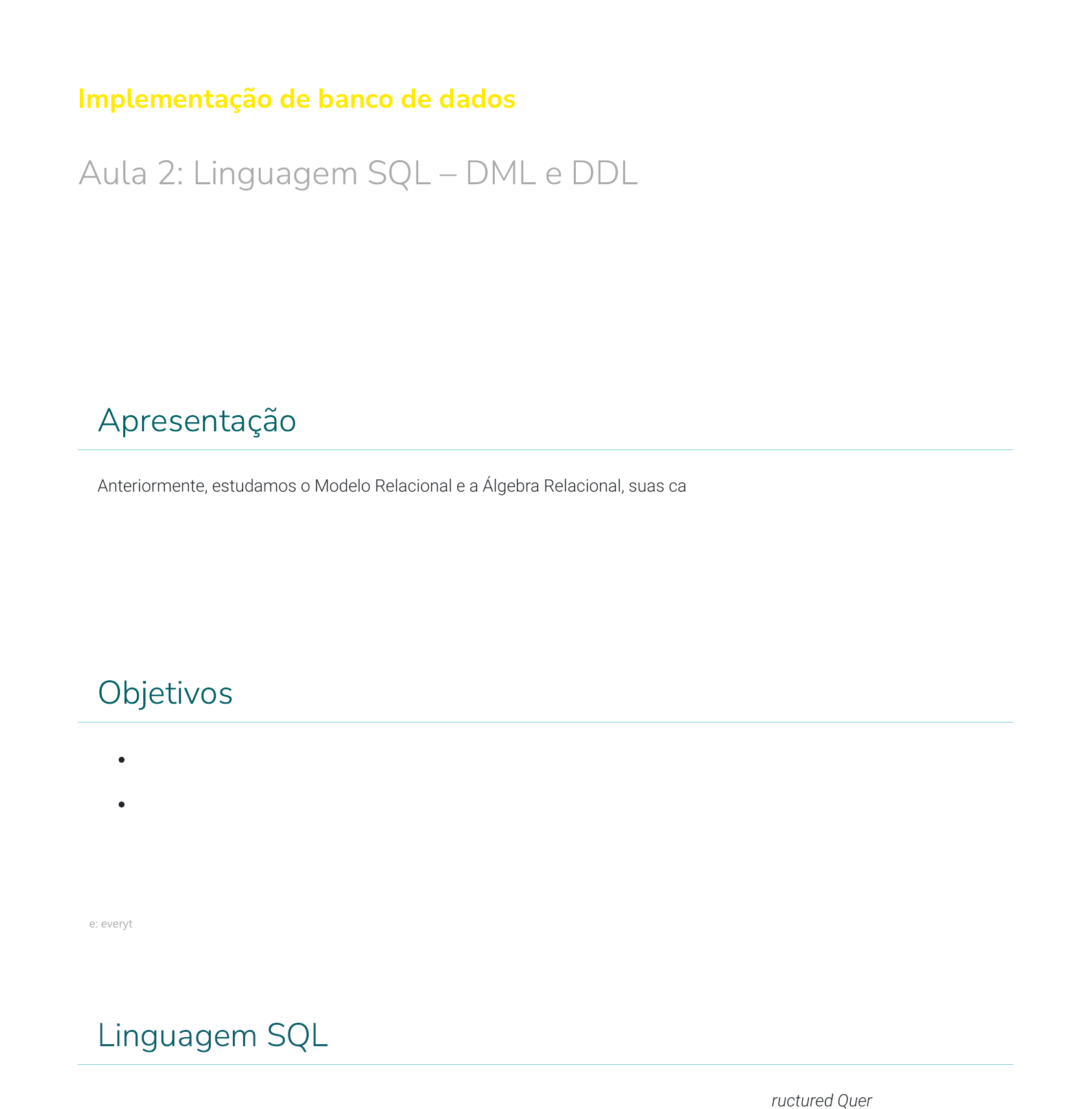 Implementação de banco de dados Aula 2: Linguagem SQL – DML e DDL Apresentação Anteriormente, estudamos o Modelo Relacional e a Álgebra Relacional, suas características e visualizamos suas principais operações. Além disso, realizamos vários exercícios de �xação. Nesta aula, seremos apresentados à linguagem SQL e vamos conhecer as partes que a compõem, estudaremos os comandos de criação de tabelas (DDL) e os comandos que permitem colocar, alterar ou eliminar linhas das tabelas (DML). Objetivos Criar e eliminar tabelas; Inserir, alterar e eliminar dados das tabelas. Fonte: everything possible / Shutterstock. Linguagem SQL O padrão mundial de acesso a banco de dados é a Linguagem Estruturada de Consulta (Structured Query Language) ou simplesmente SQL, na sigla em inglês. A linguagem SQL divide-se em partes, cada uma atendendo a uma necessidade especí�ca. Temos, então, a seguinte divisão: Nosso foco de estudo será nos comandos de criação, alteração e eliminação de tabelas e nos comandos de DML (Insert, Update, Delete e Select). Linguagem de Descrição de Dados (Data De�nition Language – DDL) – tem como principais comandos Create, Alter e Drop, destinados, respectivamente, a criar, alterar e eliminar objetos de banco de dados, como usuários, tabelas, índices etc. Linguagem de Manipulação de Dados (Data Manipulation Language - DML) – tem como principais comandos Insert, Update, Delete e Select, destinados, respectivamente, a inserir linhas nas tabelas, alterar linhas, eliminar linhas e consultar os dados da tabela. Linguagem de Controle de Dados (Data Control Language – DCL) – tem como principais comandos Grant e Revoke, destinados a conceder e revogar privilégios de acesso respectivamente. Tabelas Tabelas são os objetos básicos de armazenamento de dados no modelo relacional. Para criarmos uma tabela, devemos de�nir o seu nome, suas colunas, os tipos de dados das colunas e suas restrições. Nome, Coluna, Tipos de dados e Restrições Clique no botão acima. Nome O nome da tabela é normalmente de�nido durante a modelagem lógica, constituindo às vezes, alguma variação em relação ao nome da entidade. Por exemplo, entidade Aluno vira tabela Aluno ou Alunos. É importante conhecer as limitações do SGBD na hora de criar a tabela. A maior parte dos SGBD não dão suporte a caracteres em português no nome da tabela. Dessa forma, se temos uma entidade Aprovação, teremos que criar a tabela Aprovacao; se a entidade tem o nome Prova Aluno, teremos que substituir o espaço em banco por: _ Prova_Aluno. Colunas As colunas das tabelas se originaram dos atributos das entidades conforme vimos na modelagem lógica. Da mesma forma que o nome da tabela, temos que respeitar as limitações do SGBD: não usar espaço em branco, caracteres em português e nos preocupar também com a quantidade máxima de caracteres que o nome da coluna ou tabela pode ter. Muitas vezes, por causa dessa limitação, teremos que abreviar o nome. Por exemplo: o atributo Matrícula do Aluno poderá virar a coluna Mat_Aluno na tabela. Tipos de dados As colunas possuem um tipo de dado que podem armazenar de forma similar ao conceito de tipo utilizado nas variáveis criadas em programas. Os SGBD possuem uma variedade muito grande de tipos. Cada SGBD tem o seu conjunto especí�co, que é, muitas vezes, incompatível com outros SGBD. Nós faremos uso do PostGreSql como SGBD para a realização de exercícios. Nos comandos de criação de tabelas, os tipos básicos são: Atenção! Aqui existe uma videoaula, acesso pelo conteúdo online Esses tipos mostrados na tabela acima são uma pequena parte dos tipos existentes no PostgreSql, mas serão su�cientes para nossos exercícios. NOTA: Abordaremos também as particularidades do SQL do Oracle e do SQL Server no que diferem do PostgreSql. Restrições As restrições, normalmente chamadas constraint visam estabelecer regras para orientar o SGBD na forma de manter a integridade do banco. Aqui vamos tratar das seguintes constraint: Tipos de Dados Descrição VARCHAR(tam) Caracter de tamanho variável, podendo atingir de 1 até 8.000 bytes, sendo limitado a tam. CHAR(tam) Caracter de tamanho fixo, podendo tam ser especificado no máximo de 8.000 caracteres. TEXT Caracter de tamanho variável sem limite. INTEGER Número inteiro de 4 bytes podendo ir de -2147483648 a +2147483647. NUMERIC(I,d) Numérico com precisão. Em i, estabelecemos quantos dígitos tem o número e em d quantos há na parte decimal. Por exemplo, para especificar um número com formato 99999.99. Tipo seria NUMERIC(7,2) DATE Data entre 01 de janeiro de 4713 AC até 31 de dezembro de 32767 DC. TIMESTAMP Armazenamento da data e da hora juntos BIT Tipo booleano armazena 0 (falso) ou 1 (verdadeiro) Atenção! Para visualização completa da tabela utilize a rolagem horizontal Comando de criação de tabela O comando de Criação de Tabela é o Create Table. Vejamos sua sintaxe: CREATE TABLE nome_da_tabela( (nome_col1 tipo_col1 [restri_col1] [, nome_col2 tipo_col2 [restri_col2] [, nome_coln tipo_coln [restri_coln] [, restri_tab1 [restri_tab2]); Onde: Vamos ver um exemplo de criação. Considere a tabela Departamento: Restrição (Constraint) Descrição NOT NULL (Obrigatório) Especifica se a coluna é obrigatória para todas as linhas da tabela, não podendo conter nenhum valor NULO. UNIQUE (Chave alternada) A coluna ou combinação de diversas colunas tem que ser única para todas as linhas da tabela, não permitindo repetições. PRIMARY KEY (Chave primária) É a chave primária de identificação unívoca da tabela. Pode ser uma ou uma combinação de colunas. FOREIGN KEY (Chave estrangeira) É uma coluna que garante a integridade de uma relação entre duas tabelas, sendo referenciada por uma chave primária da outra tabela. Atenção! Para visualização completa da tabela utilize a rolagem horizontal Palavra Chave Descrição nome_da_tabela Nome que será 