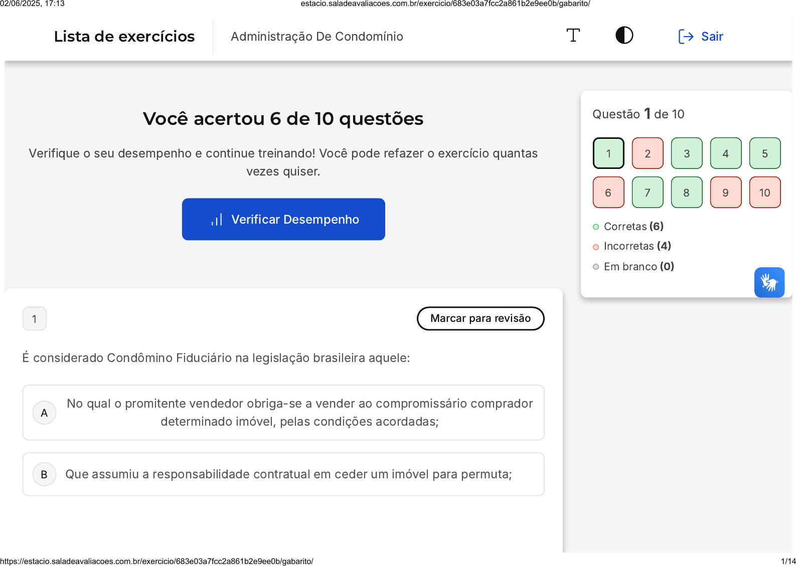 Você acertou 6 de 10 questões Verifique o seu desempenho e continue treinando! Você pode refazer o exercício quantas vezes quiser. Verificar Desempenho A B 1 Marcar para revisão É considerado Condômino Fiduciário na legislação brasileira aquele: No qual o promitente vendedor obriga-se a vender ao compromissário comprador determinado imóvel, pelas condições acordadas; Que assumiu a responsabilidade contratual em ceder um imóvel para permuta; Questão 1 de 10 Corretas (6) Incorretas (4) Em branco (0) 1 2 3 4 5 6 7 8 9 10 Lista de exercícios Administração De Condomínio Sair 02/06/2025, 17:13 estacio.saladeavaliacoes.com.br/exercicio/683e03a7fcc2a861b2e9ee0b/gabarito/ https://estacio.saladeavaliacoes.com.br/exercicio/683e03a7fcc2a861b2e9ee0b/gabarito/ 1/14 C D E Que possui o domínio de um bem imóvel, mas não o utiliza, sendo o usufruto exercido por outra pessoa; Possui a propriedade do imóvel conforme apontamento no Cartório de Registro de Imóvel, podendo dispor dele livremente; Sujeito que detém a propriedade, entretanto, com efeito suspensivo até realizar a quitação da obrigação assumida; Resposta correta Parabéns, você selecionou a alternativa correta. Confira o gabarito comentado! Gabarito Comentado Na legislação brasileira, o Condômino Fiduciário é aquele que detém a propriedade de um imóvel, mas com um efeito suspensivo. Isso significa que, embora ele seja o proprietário, essa propriedade está condicionada à quitação de uma obrigação assumida. Portanto, a propriedade só será efetivamente sua quando essa obrigação for totalmente quitada. Assim, a alternativa correta é a E: "Sujeito que detém a propriedade, entretanto, com efeito suspensivo até realizar a quitação da obrigação assumida". 02/06/2025, 17:13 estacio.saladeavaliacoes.com.br/exercicio/683e03a7fcc2a861b2e9ee0b/gabarito/ https://estacio.saladeavaliacoes.com.br/exercicio/683e03a7fcc2a861b2e9ee0b/gabarito/ 2/14 A B C D E 2 Marcar para revisão O balancete contábil é um instrumento essencial para a transparência na gestão do condomínio. Considerando a estrutura do balancete condominial, qual das alternativas representa corretamente uma despesa de investimento relacionada à modernização patrimonial? Aquisição de novos equipamentos para os elevadores Pagamento de prestadores de serviço de limpeza e conservação Honorários pagos a advogados por atuação judicial Gastos com consumo de energia das áreas comuns Pagamento de salário do zelador com adicionais legais Resposta incorreta Opa! A alternativa correta é a letra A. Confira o gabarito comentado! Gabarito Comentado 02/06/2025, 17:13 estacio.saladeavaliacoes.com.br/exercicio/683e03a7fcc2a861b2e9ee0b/gabarito/ https://estacio.saladeavaliacoes.com.br/exercicio/683e03a7fcc2a861b2e9ee0b/gabarito/ 3/14 A B C D E A aquisição de bens que aumentam ou modernizam o patrimônio, como novos equipamentos, se enquadra como despesa de investimento, e não de manutenção ou ordinária. 3 Marcar para revisão A legislação sobre condomínios estabelece como cláusula mínima que deve constar da convenção condominial: Responsabilidade pela contratação de empregados para o condomínio; Forma de cobrança das quotas condominiais; A finalidade de uso (residencial, comercial, misto); Limite de juros a ser pago em operações financeiras; Funcionamento da garagem do condomínio; 02/06/2025, 17:13 estacio.saladeavaliacoes.com.br/exercicio/683e03a7fcc2a861b2e9ee0b/gabarito/ https://estacio.saladeavaliacoes.com.br/exercicio/683e03a7fcc2a861b2e9ee0b/gabarito/ 4/14 A B Resposta correta Parabéns, você selecionou a alternativa correta. Confira o gabarito comentado! Gabarito Comentado A alternativa correta é a letra C, que se refere à finalidade de uso do condomínio (residencial, comercial, misto). Isso porque a legislação sobre condomínios estabelece que a convenção condominial deve, obrigatoriamente, conter a finalidade de uso do imóvel. As demais alternativas, embora possam ser importantes em algumas situações, não são cláusulas mínimas obrigatórias na convenção condominial. 4 Marcar para revisão Na administração financeira condominial, é importante que o síndico compreenda as diferentes origens de recursos para garantir o equilíbrio do caixa. Dentre as opções a seguir, qual representa um recurso extraordinário? Cotas condominiais mensais aprovadas em assembleia Valores provenientes da multa por atraso no pagamento da cota ordinária 02/06/2025, 17:13 estacio.saladeavaliacoes.com.br/exercicio/683e03a7fcc2a861b2e9ee0b/gabarito/ https://estacio.saladeavaliacoes.com.br/exercicio/683e03a7fcc2a861b2e9ee0b/gabarito/ 5/14 C D E Receita gerada com o aluguel do salão de festas Pagamento extra solicitado para realização de obra estrutural Fundo de reserva utilizado para despesas de consumo regular Resposta correta Parabéns, você selecionou a alternativa correta. Confira o gabarito comentado! Gabarito Comentado As cotas extraordinárias são recursos arrecadados com finalidades específicas e não rotineiras, como obras ou reformas estruturais. Por isso, são classificadas como extraordinárias 5 Marcar para revisão Durante uma assembleia condominial, os participantes discutem os diferentes tipos de síndico e suas implicações na gestão. Com base no Código Civil, qual das alternativas apresenta corretamente uma das atribuições legais do síndico em um condomínio edilício? 02/06/2025, 17:13 estacio.saladeavaliacoes.com.br/exercicio/683e03a7fcc2a861b2e9ee0b/gabarito/ https://estacio.saladeavaliacoes.com.br/exercicio/683e03a7fcc2a861b2e9ee0b/gabarito/ 6/14 A B C D E Votar em todas as deliberações da assembleia, mesmo que inadimplente Executar obras nas áreas comuns sem autorização da assembleia Apresentar parecer técnico sobre as contas do condomínio anualmente Convocar assembleias e representar o condomínio judicialmente Substituir os conselheiros fiscais sempre que considerar necessário Re