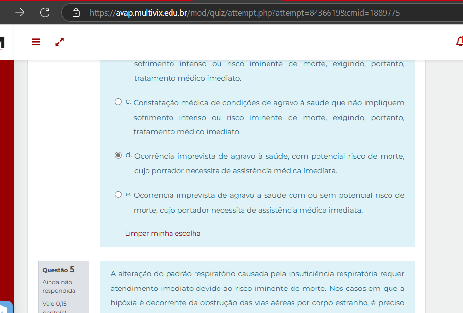C https://avap.multivix.edu.br/mod/quiz/attempt.php?attempt=8436619&cmid=1889775 L sofrimento intenso ou risco iminente de morte, exigindo, portanto, tratamento médico imediato. C. Constatação médica de condições de agravo à saúde que não impliquem sofrimento intenso ou risco iminente de morte, exigindo, portanto, tratamento médico imediato. d. Ocorrência imprevista de agravo à saúde, com potencial risco de morte, cujo portador necessita de assistência médica imediata. e. Ocorrência imprevista de agravo à saúde com ou sem potencial risco de morte, cujo portador necessita de assistência médica imediata. Limpar minha escolha Questão 5 A alteração do padrão respiratório causada pela insuficiência respiratória requer Ainda não respondida atendimento imediato devido ao risco iminente de Nos casos em que a Vale 0,15 hipóxia é decorrente da obstrução das vias aéreas por corpo estranho, é preciso