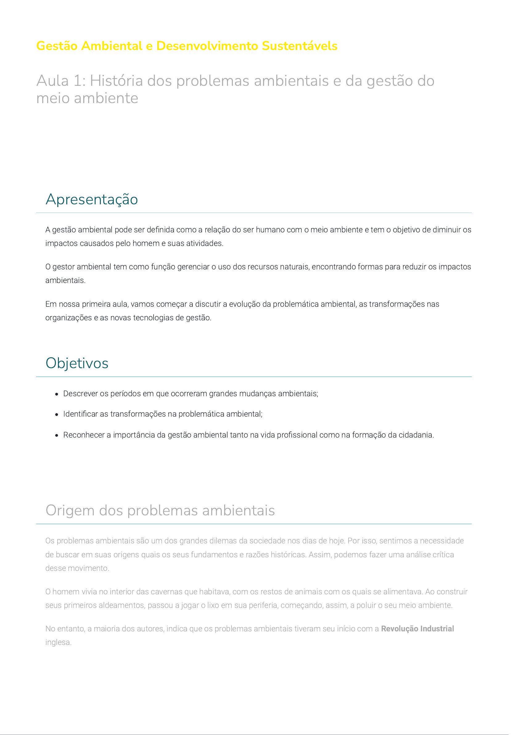 Gestão Ambiental e Desenvolvimento Sustentávels Aula 1: História dos problemas ambientais e da gestão do meio ambiente Apresentação A gestão ambiental pode ser definida como a relação do ser humano com o meio ambiente e tem o objetivo de diminuir os impactos causados pelo homem e suas atividades. O gestor ambiental tem como função gerenciar o uso dos recursos naturais, encontrando formas para reduzir os impactos ambientais. Em nossa primeira aula, vamos começar a discutir a evolução da problemática ambiental, as transformações nas organizações e as novas tecnologias de gestão. Objetivos Descrever os períodos em que ocorreram grandes mudanças ambientais; Identificar as transformações na problemática ambiental; Reconhecer a importância da gestão ambiental tanto na vida profissional como na formação da cidadania. Origem dos problemas ambientais Os problemas ambientais são um dos grandes dilemas da sociedade nos dias de hoje. Por isso, sentimos a necessidade de buscar em suas origens quais os seus fundamentos e razões históricas. Assim, podemos fazer uma análise crítica desse movimento. O homem vivia no interior das cavernas que habitava, com os restos de animais com os quais se alimentava. Ao construir seus primeiros aldeamentos, passou a jogar o lixo em sua periferia, começando, assim, a poluir o seu meio ambiente. No entanto, a maioria dos autores, indica que os problemas ambientais tiveram seu início com a Revolução Industrial inglesa. Fonte: Wikipedia Na Revolução Industrial, houve a transição da manufatura para a indústria mecânica, e, com isso, ocorreu a transformação completa das indústrias com relação à rapidez na produção e à otimização dos processos produtivos. As fábricas começaram a demandar mais recursos naturais para produzir bens de consumo, o que trouxe grandes desvantagens ao meio ambiente, alterando totalmente a relação homem-ambiente existente até então. A busca pelo desenvolvimento econômico em um ritmo muito acelerado ocasionou, também, a carência de vários recursos naturais. Grandes desastres ambientais As relações do homem com o meio ambiente acarretaram, ao longo dos anos, impactos e consequências que geraram grandes desastres ambientais. O principal exemplo com consequências na saúde populacional é o Desastre de Minamata, que aconteceu em 1956. Atenção! Aqui existe uma videoaula, acesso pelo conteúdo online javascript:void(0); Nesse episódio, houve o envenenamento de centenas de pessoas por mercúrio, em virtude da contaminação da água, na cidade de Minamata, no Japão. metaispesadospbi.blogspot.com Veja outros desastres importantes Clique no botão acima. Veja outros desastres importantes O caso do Vale de Meuse, na Bélgica, em 1930, em que uma grossa camada de poluição permaneceu no ar por 5 dias deixando 63 mortos e inúmeras pessoas doentes. O mais grave, conhecido como “A Névoa Matadora”, ocorreu em Londres, em 1952, em que mais de 4 mil pessoas morreram por causa da poluição do ar. Este evento foi o primeiro a promover a movimentação das autoridades de saúde quanto à qualidade do ar. O caso na cidade de Donora, Pensilvânia, nos Estados Unidos, em 1948, em que a poluição deixou 30 pessoas mortas e quase metade da população (6000 pessoas) com problemas respiratórios. Cidade de Danora, Pensilvânia. Fonte: Allegheny Front javascript:void(0); javascript:void(0); Saiba mais Para saber mais detalhes sobre esses importantes acidentes ambientais leia a matéria: • Saiba o que provocou o nevoeiro que matou milhares de pessoas em 1952 Assista também aos vídeos: • Grande impacto ambiental (Bélgica 1930) • O Grande Nevoeiro-Big Smok-1952 javascript:void(0); javascript:void(0); javascript:void(0); 1960 Somente no final da década de 1960, a questão ambiental começou a ser abordada, pois, anteriormente, os episódios que mostravam a relação existente entre a saúde da população e o meio ambiente eram ignorados, já que os efeitos da poluição eram tidos como um mal necessário para a existência do progresso. Porém, começaram a surgir os primeiros movimentos ambientalistas motivados pela preocupação com contaminação das águas e do ar nos países industrializados. 1970 Uma grande preocupação com a natureza e a exploração dos seus recursos surgiu na década de 1970, quando eclodiu no mundo um conjunto de manifestações, incluindo a liberação feminina e a revolução estudantil de maio de 1968 na França. Além disso, houve o endurecimento das condições políticas na América Latina e a instituição de governos autoritários, em resposta às exigências de organização democrática dos povos em busca de seu direito à liberdade, ao trabalho, à educação, à saúde, ao lazer e à definição participativa de seus destinos nos países desenvolvidos. Isso fez com que os governos impusessem às empresas que fizessem melhorias em relação ao meio ambiente. Ainda nessa década, foi escrito o “Manifesto para a Sobrevivência” por uma entidade relacionada à revista britânica The Ecologist, em que foi dito que um aumento indefinido da demanda não pode ser sustentado por recursos finitos. Nessa época, não existia uma política voltada para a conservação e para a preservação dos recursos naturais por parte dos governos. Contudo, estes se conscientizaram de que não poderiam continuar produzindo bens sem se preocupar com as consequências negativas para o meio ambiente. Além disso, a sociedade civil movimentava-se no mundo todo, buscando sensibilizar os governos e a população mundial quanto à necessidade de um consumo sustentável. Então, as organizações civis começaram a fazer vários manifestos e eventos com objetivo de chamar a atenção para os problemas ambientais e buscar soluções para minimizá-los e/ou resolvê-los. Principais mudanças 1980 Já na década de 1980, ocorreu um crescimento do movimento ambientalista, que passou