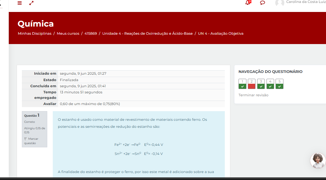 Carolina da Costa Luiz Química Minhas Disciplinas / Meus cursos / 415869 / Unidade 4 Reações de Oxirredução e Ácido-Base / UN 4 - Avaliação Objetiva Iniciado em segunda, 9 jun 2025, 01:27 NAVEGAÇÃO DO QUESTIONÁRIO Estado Finalizada 1 2 3 4 5 Concluída em segunda, 9 jun 2025, 01:41 Tempo 13 minutos segundos Terminar revisão empregado Avaliar 0,60 de um máximo de 0,75(80%) Questão 1 estanho é usado como material de revestimento de materiais contendo ferro. Os Correto de potenciais e as semirreações de redução do estanho são: P Marcar questão A finalidade do estanho é proteger ferro, por isso este metal é adicionado sobre a sua