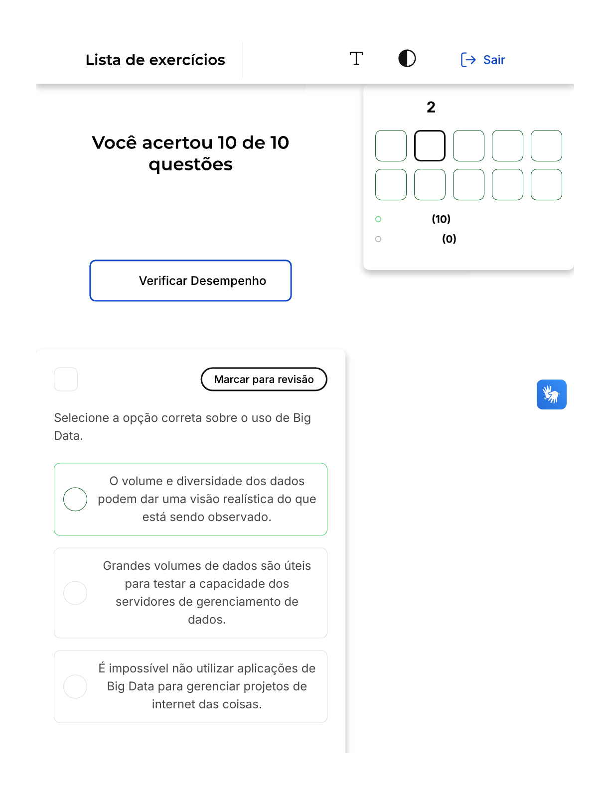 Verifique o seu desempenho e continue treinando! Você pode refazer o exercício quantas vezes quiser. A B C 1 Selecione a opção correta sobre o uso de Big Data. O volume e diversidade dos dados podem dar uma visão realística do que está sendo observado. Grandes volumes de dados são úteis para testar a capacidade dos servidores de gerenciamento de dados. É impossível não utilizar aplicações de Big Data para gerenciar projetos de internet das coisas. Questão de 10 Corretas Em branco 1 2 3 4 5 6 7 8 9 10 Princípios … Firefox https://estacio.saladeavaliacoes.com.br/exercicio/683e2fb09fb17b1e75f... 1 of 15 08/06/2025, 22:40 D E Com projetos de Big Data é sempre possível detectar fraudes em operações financeiras. Projetos de big de Big Data são uma forma de organizar tabelas normalizadas com grande volume de dados. Parabéns, você selecionou a alternativa correta. Confira o gabarito comentado! O item correto diz respeito ao fato de que volume e a diversidade de dados permitem que outras aplicações possam analisar os dados à procura de padrões e anomalias, dando assim uma visão realística das observações. Os demais itens estão incorretos, pois Big Data por si só não é capaz de detectar características que sejam relevantes para tomada de decisão, apesar de ser uma etapa essencial nesse processo. 2 Firefox https://estacio.saladeavaliacoes.com.br/exercicio/683e2fb09fb17b1e75f... 2 of 15 08/06/2025, 22:40 A B C D E Em relação às plataformas para Internet das Coisas, selecione a opção correta sobre o Arduino. É um programa É uma placa de hardware É o outro nome para Raspberry PI É um ecossistema que envolve software e hardware É um protocolo de internet das coisas Parabéns, você selecionou a alternativa correta. Confira o gabarito comentado! O Arduino é uma plataforma de código aberto que é utilizada para construir projetos de eletrônica. Ele é um ecossistema que envolve tanto o software quanto o hardware. Não é correto afirmar que o Arduino é apenas um programa, uma placa de hardware ou um protocolo de internet das coisas. Além disso, o Arduino não é o mesmo que o Raspberry PI, que é outra plataforma utilizada para projetos de eletrônica e Internet das Coisas. Portanto, a Firefox https://estacio.saladeavaliacoes.com.br/exercicio/683e2fb09fb17b1e75f... 3 of 15 08/06/2025, 22:40 A B C D E alternativa correta é a D� "É um ecossistema que envolve software e hardware". 3 Em relação às aplicações de Internet das coisas, selecione a opção correta sobre os seus objetivos. Obter dados que sirvam como base na tomada de decisão Melhorar a interatividade com o usuário Aumentar a complexidade do processo de gestão dos dados Aumentar a diversidade dos dados Ampliar o volume de dados da aplicação Parabéns, você selecionou a alternativa correta. Confira o gabarito comentado! Firefox https://estacio.saladeavaliacoes.com.br/exercicio/683e2fb09fb17b1e75f... 4 of 15 08/06/2025, 22:40 A B C D A internet das coisas tem como objetivo coletar dados de dispositivos e oferecer os meios para que possam trafegar pela infraestrutura de internet para que possam ser usados como base de algoritmos que vão analisá-los e, a partir da detecção de padrões ou anomalias, tomarão as medidas necessárias para regularizar o sistema. A opção sobre melhorar interatividade, aumentar complexidade, aumentar diversidade e ampliar volume são consequências da utilização de sistemas complexos. 4 Selecione a opção correta a respeito do processamento e streaming de dados. Caracterizam-se pelo envio do mesmo dado por várias fontes Os dados podem vir de várias fontes Os dados sempre são provenientes de aplicações transacionais Os dados sempre estão no mesmo formato Firefox https://estacio.saladeavaliacoes.com.br/exercicio/683e2fb09fb17b1e75f... 5 of 15 08/06/2025, 22:40 E A B Os dados são caracterizados também são denominados de lotes estáticos. Parabéns, você selecionou a alternativa correta. Confira o gabarito comentado! Os dados de aplicações streaming são gerados e processados em tempo real. Também podem vir de várias fontes e de diversos formatos, o que torna um desafio fazer o gerenciamento deles. As demais opções estão erradas, pois dados de streaming não são transacionais, além disso os dados revelam o estado da aplicação em um dado instante, por isso é muito difícil que o mesmo dado seja reenviado. 5 Em relação ao protocolo de transporte para transmissão de aplicações de streaming, selecione a opção correta. TCP HTTP Firefox https://estacio.saladeavaliacoes.com.br/exercicio/683e2fb09fb17b1e75f... 6 of 15 08/06/2025, 22:40 C D E UDP MQTT CoAP Parabéns, você selecionou a alternativa correta. Confira o gabarito comentado! Firefox https://estacio.saladeavaliacoes.com.br/exercicio/683e2fb09fb17b1e75f... 7 of 15 08/06/2025, 22:40 A O protocolo correto para a transmissão de aplicações de streaming é o UDP �User Datagram Protocol - Protocolo de Datagrama do Usuário). Este protocolo é preferido para aplicações de streaming devido à sua velocidade, que é superior à do TCP �Transmission Control Protocol - Protocolo de Controle de Transmissão). O TCP, embora seja um protocolo orientado à confiabilidade, é menos eficiente para aplicações de streaming devido à sua lentidão, o que pode inviabilizar a aplicação. Os protocolos HTTP �Hypertext Transfer Protocol - Protocolo de Transferência de Hipertexto), MQTT �Message Queuing Telemetry Transport - Transporte de Telemetria por Enfileiramento de Mensagens) e CoAP �Constrained Application Protocol - Protocolo de Aplicação Restrita) não são adequados para o transporte de dados em aplicações de streaming. 6 Selecione a opção em que a computação se refere à execução de aplicações e serviços em uma rede distribuída usando recursos virtualizados. Computação centralizada Firefox https://estacio.saladeavaliacoes.com.br/exercicio/683e2fb09fb17